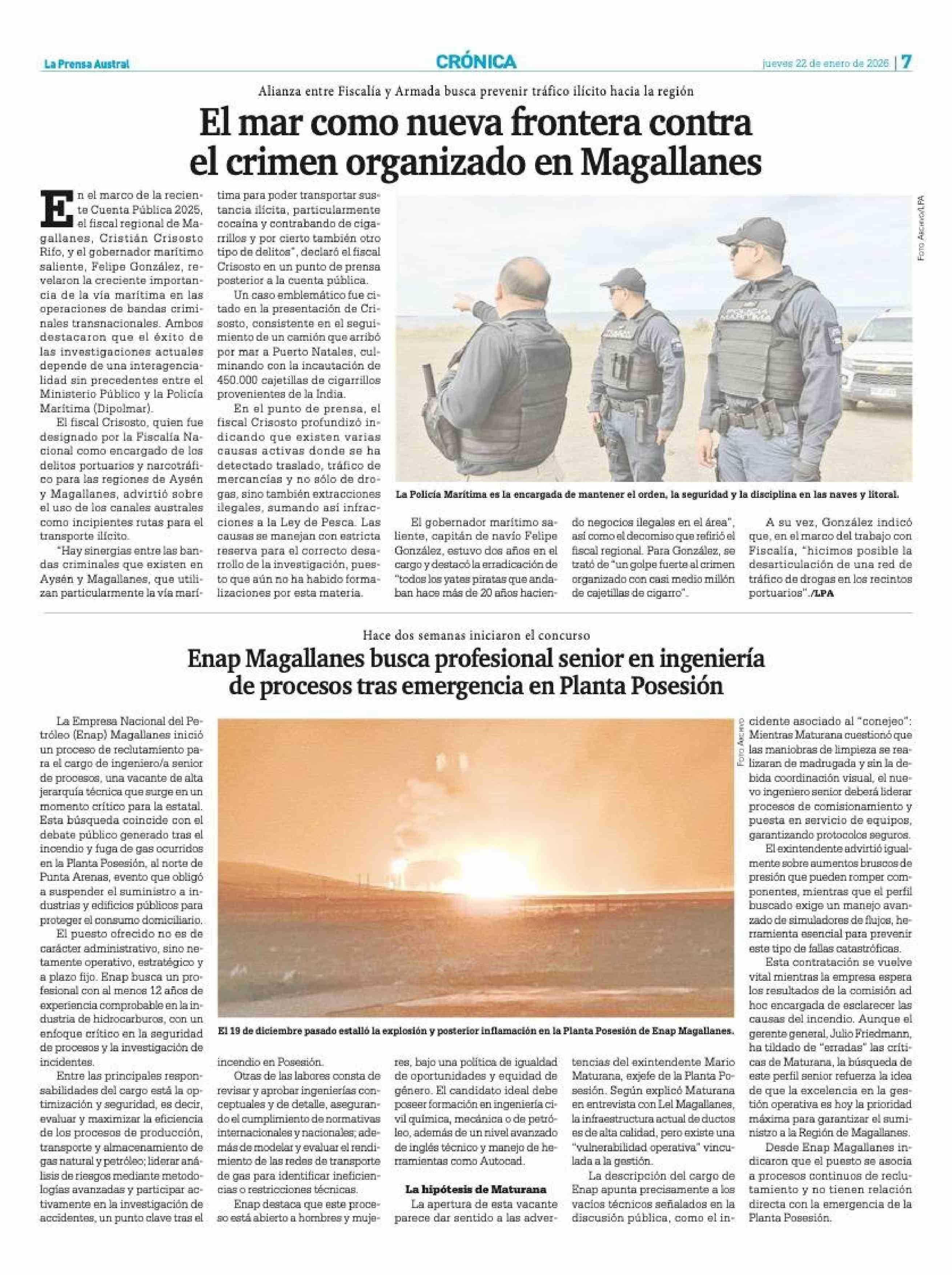 El mar como nueva frontera contra el crimen organizado en Magallanes 22-01-2026 La Prensa Austral |
