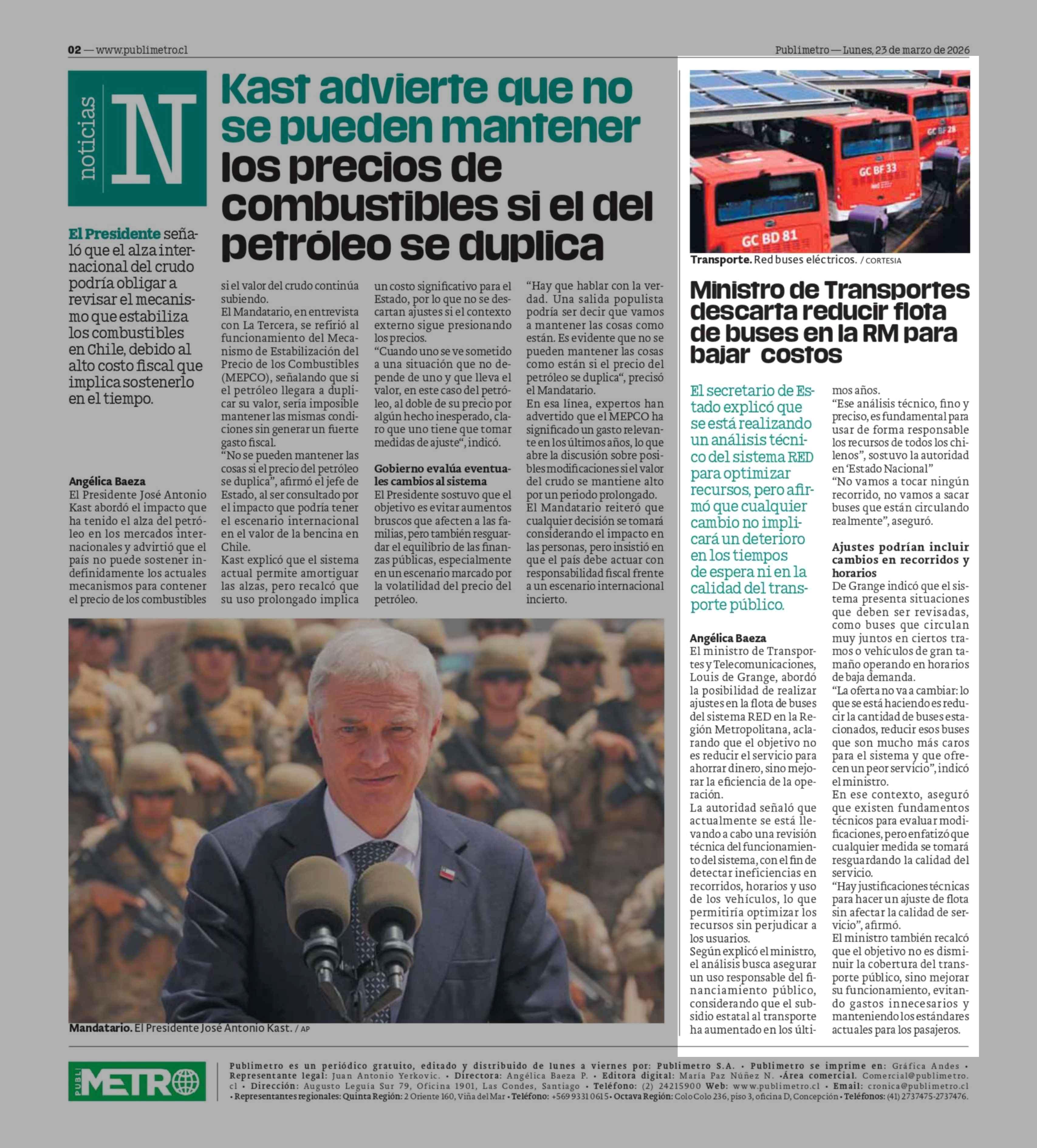 Ministro de Transportes descarta reducir flota de buses en la RM para bajar costos 23-03-2026 Publimetro |