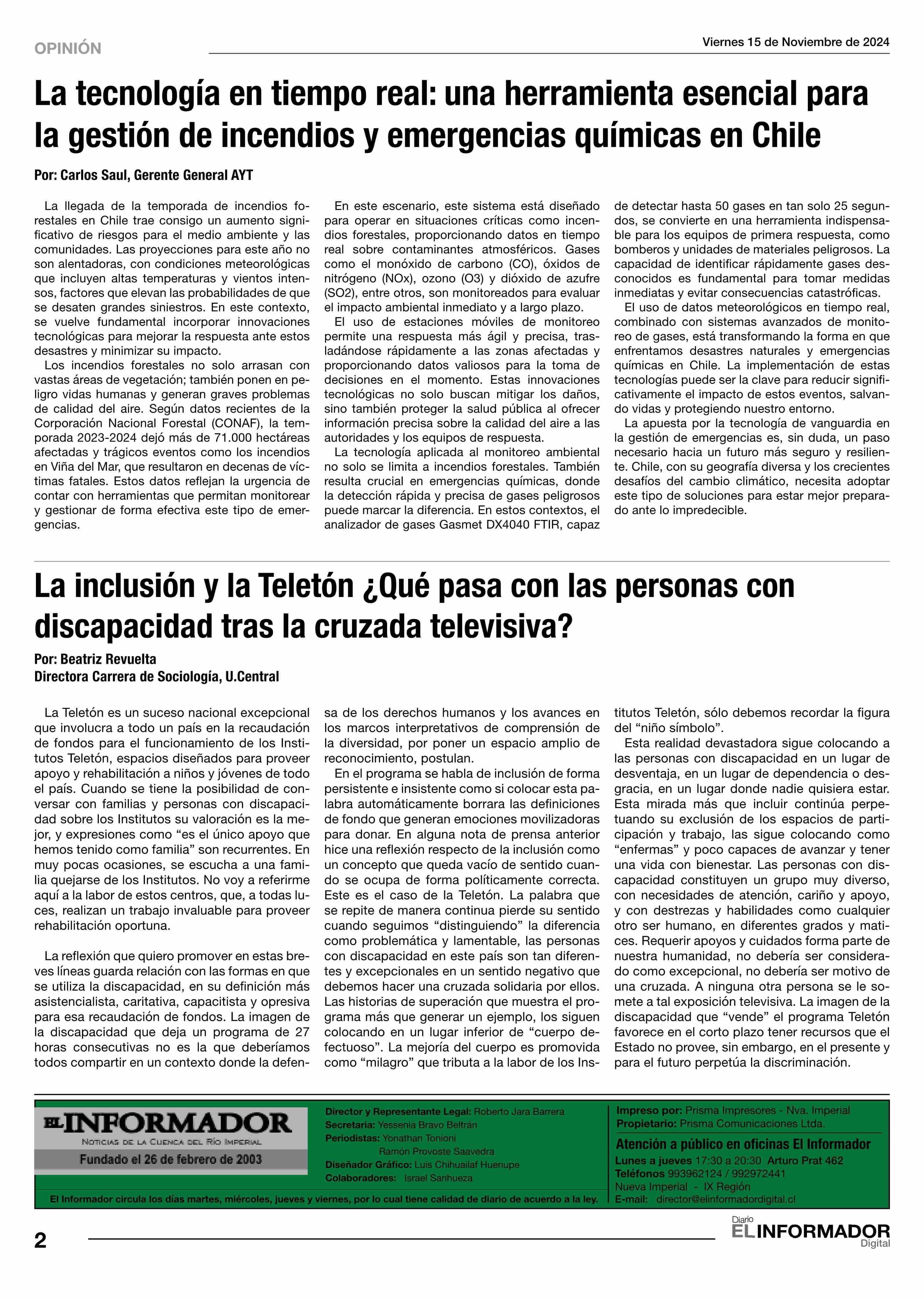 COLUMNAS DE OPINIÓN: una herramienta esencial para la gestión de incendios y emergencias químicas en Chile 15-11-2024 El Informador |