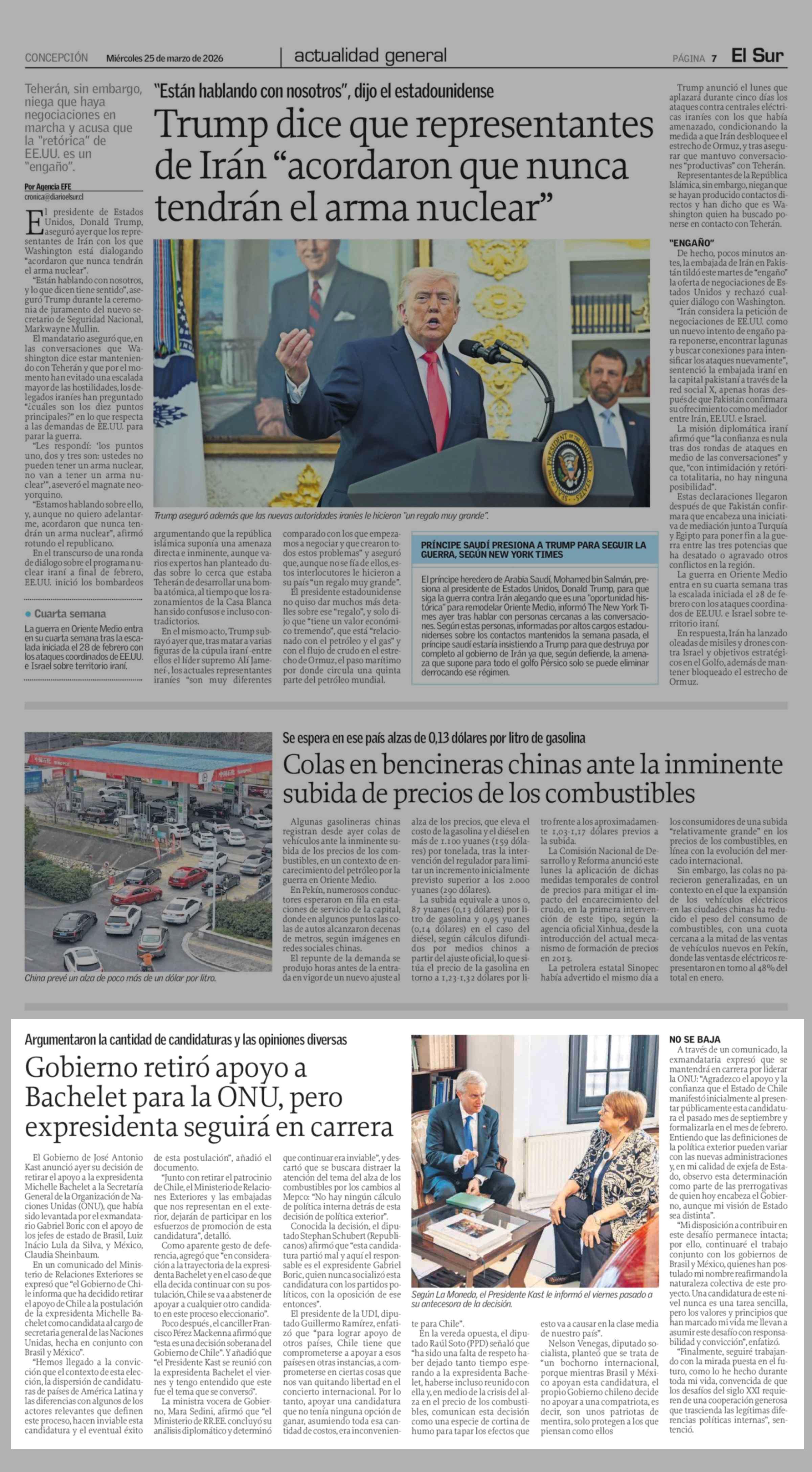 Gobierno retiró apoyo a Bachelet para la ONU, pero expresidenta seguirá en carrera 25-03-2026 El Sur |