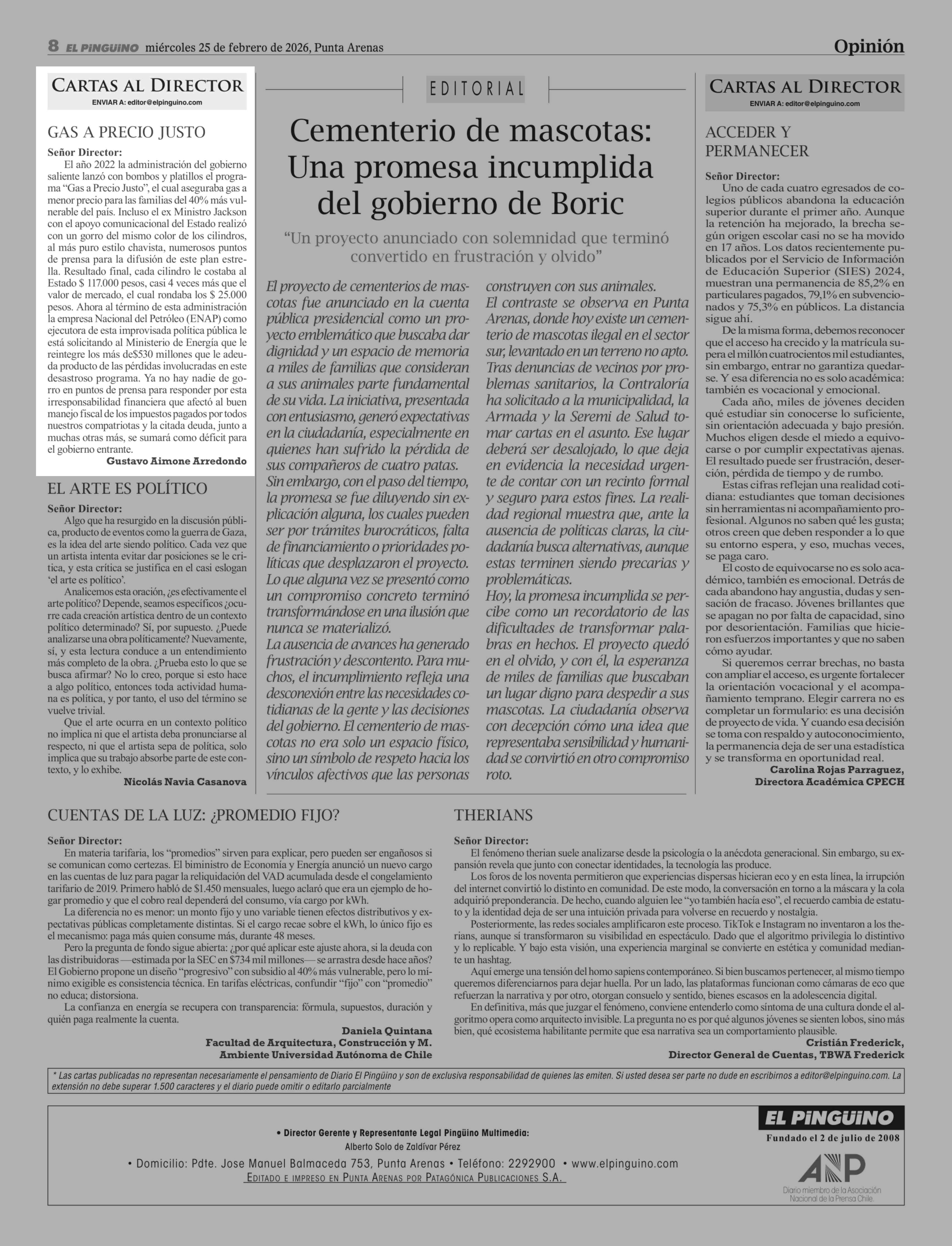 Cartas: GAS A PRECIO JUSTO Señor Director: El año 2022 la administración del gobierno saliente lanzó con bombos y platillos el programa "Gas a Precio Justo", el cual aseguraba gas a menor precio para las familias del 40% más vulnerable del país. Incluso el ex Ministro Jackson con el apoyo comunicaci