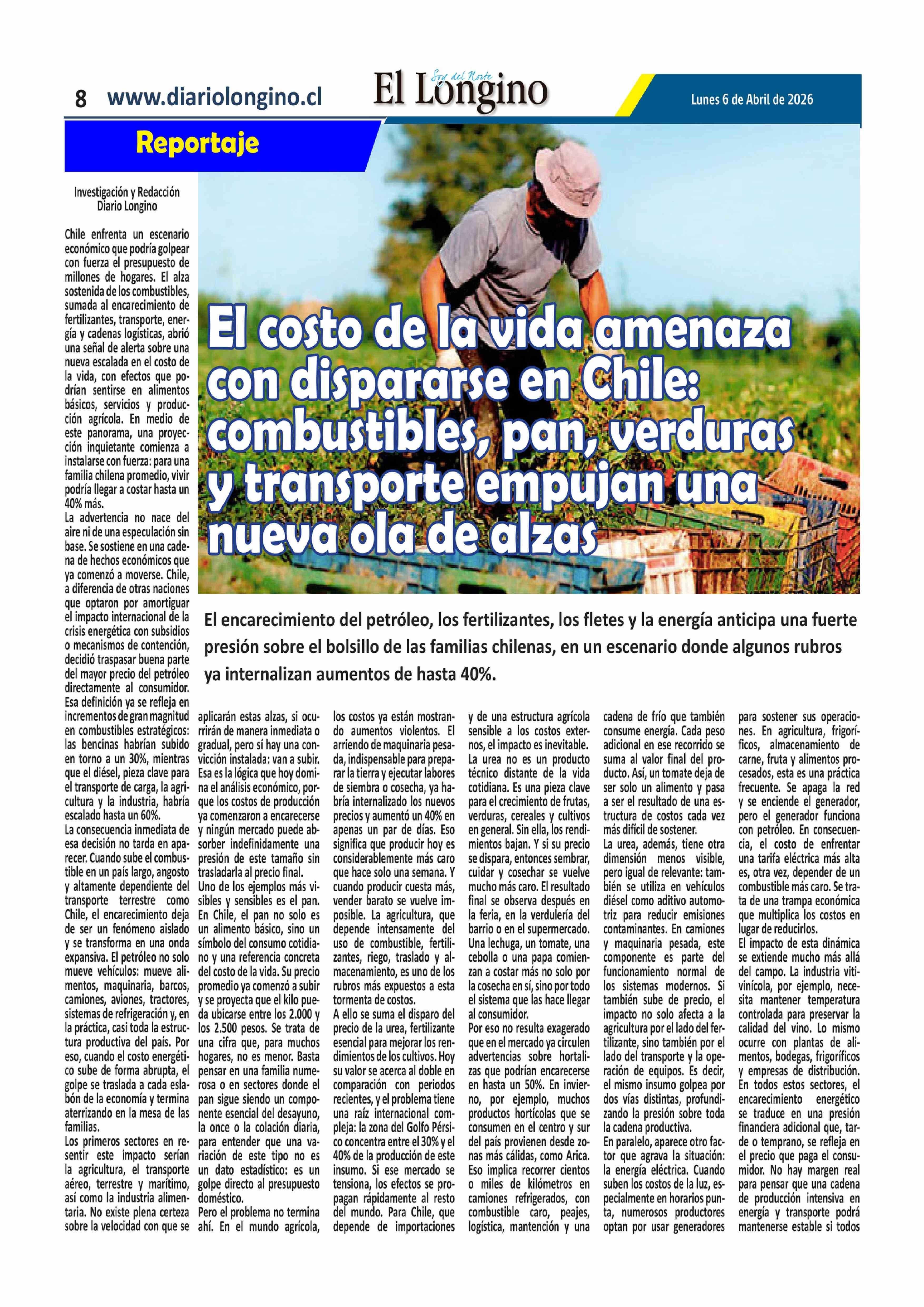 Título: El costo de la vida amenaza con dispararse en Chile: combustibles, pan, verduras y transporte empujan una nueva ola de alzas