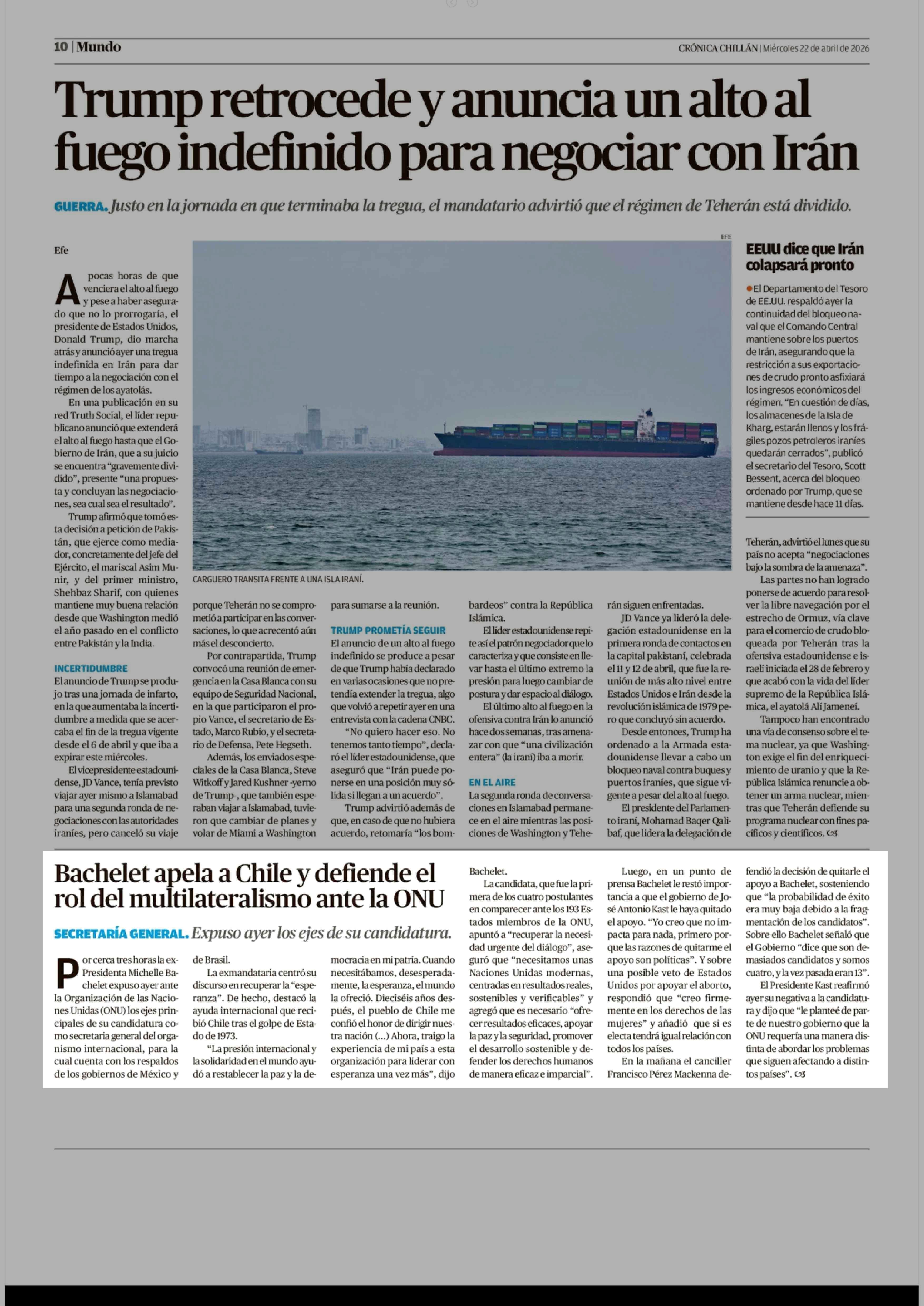 Bachelet apela a Chile y defiende el rol del multilateralismo ante la ONU 22-04-2026 Crónica de Chillán |