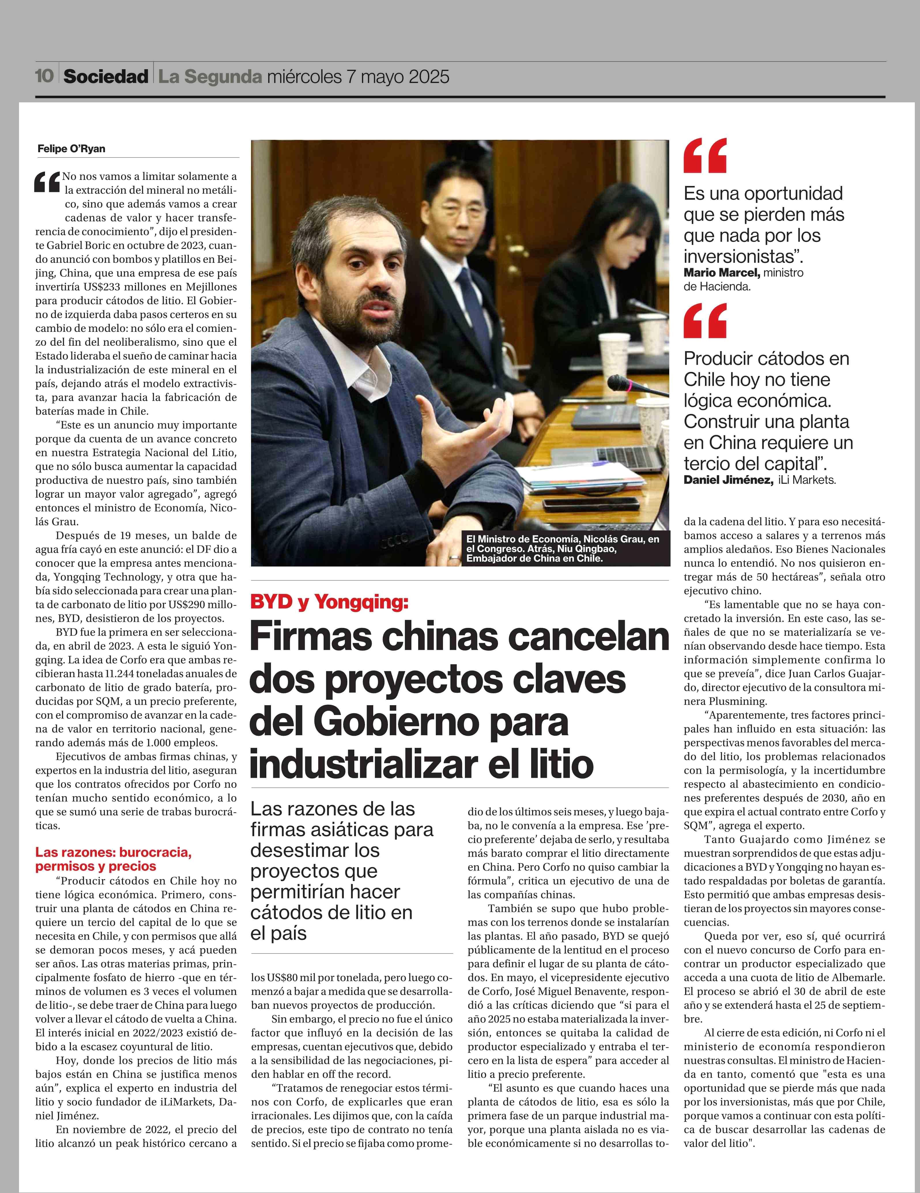 Firmas chinas cancelan dos proyectos claves del Gobierno para industrializar el litio 07-05-2025 La Segunda |