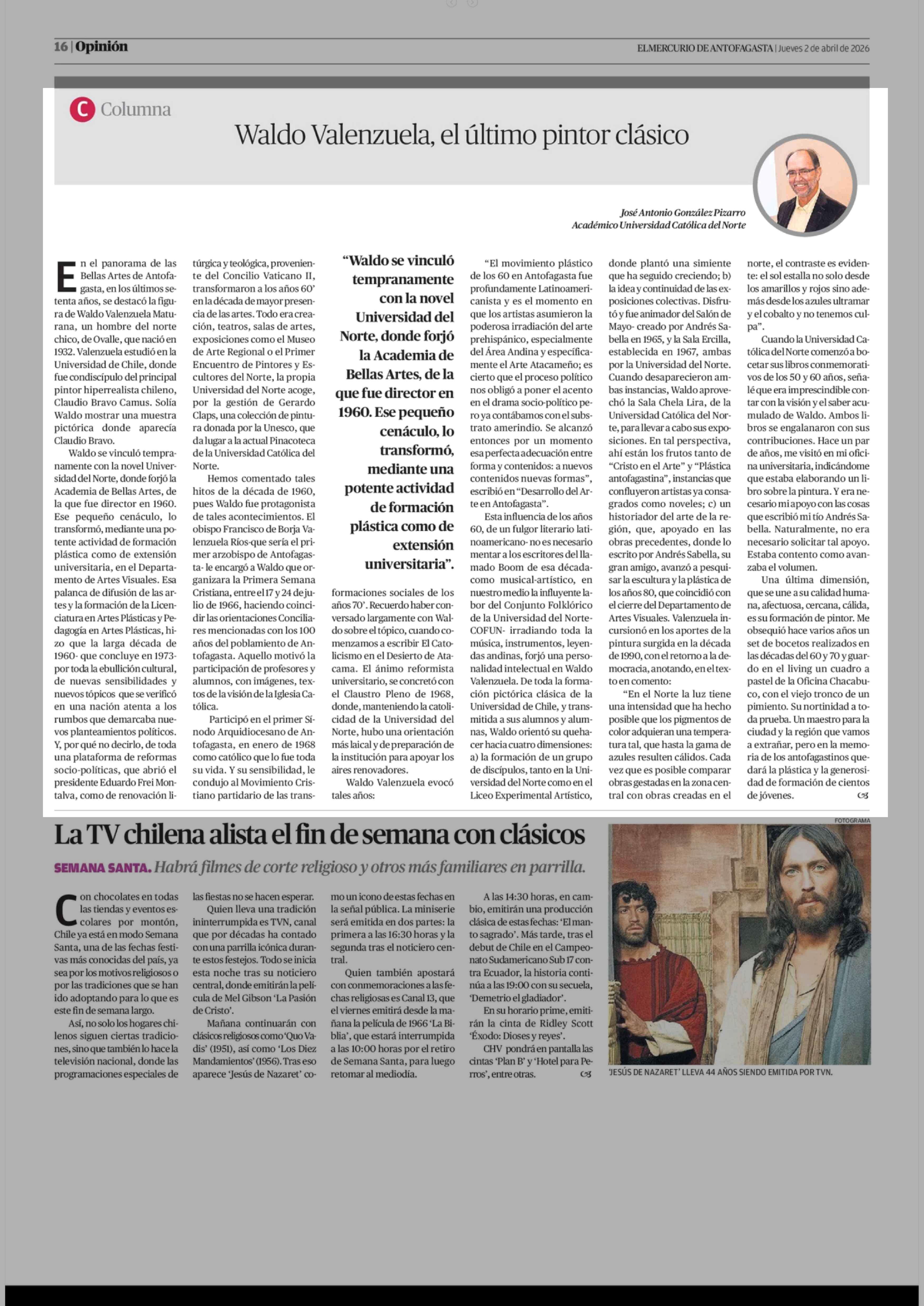 Columnas de Opinión: Waldo Valenzuela, el último pintor clásico 02-04-2026 El Mercurio de Antofagasta |