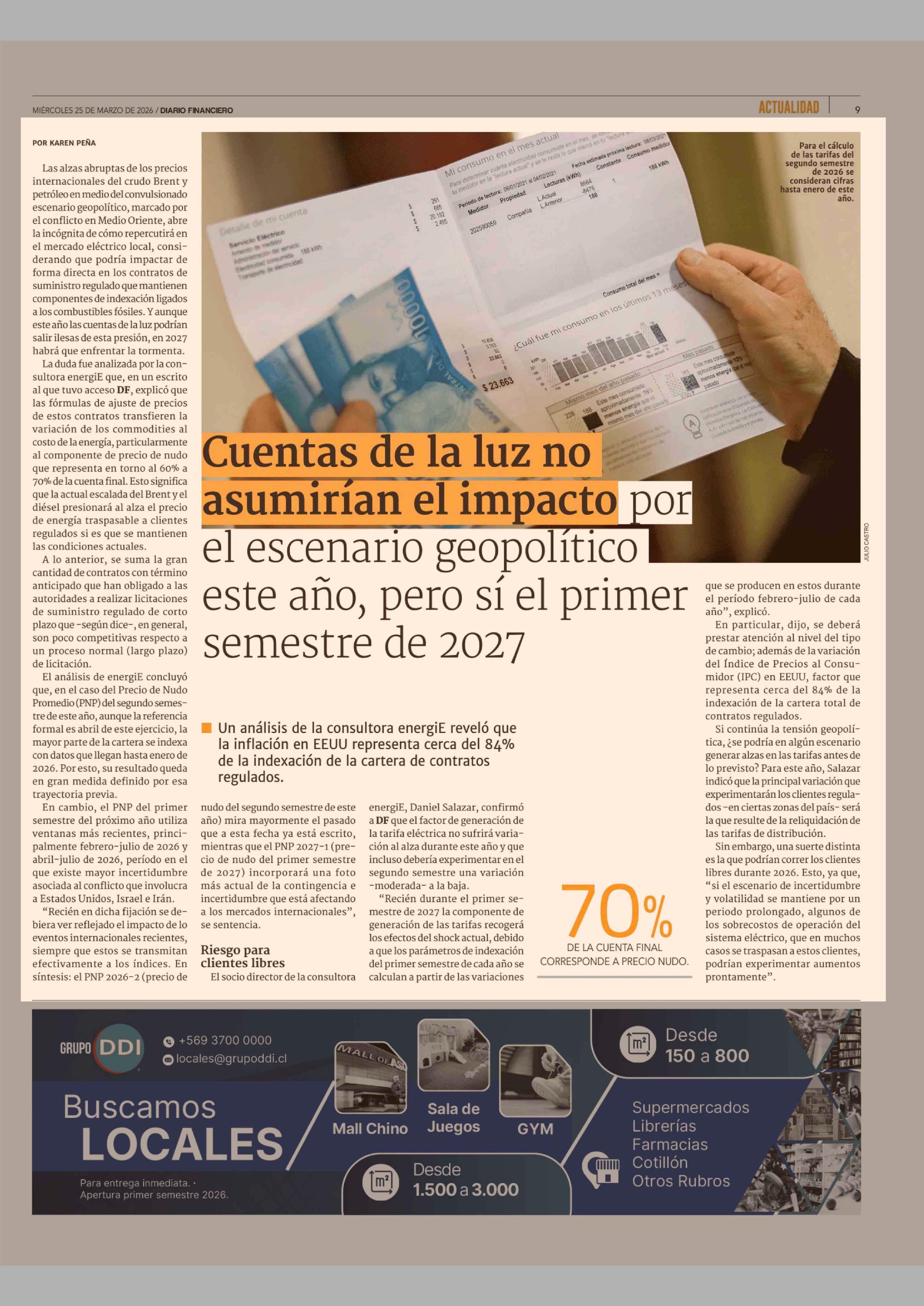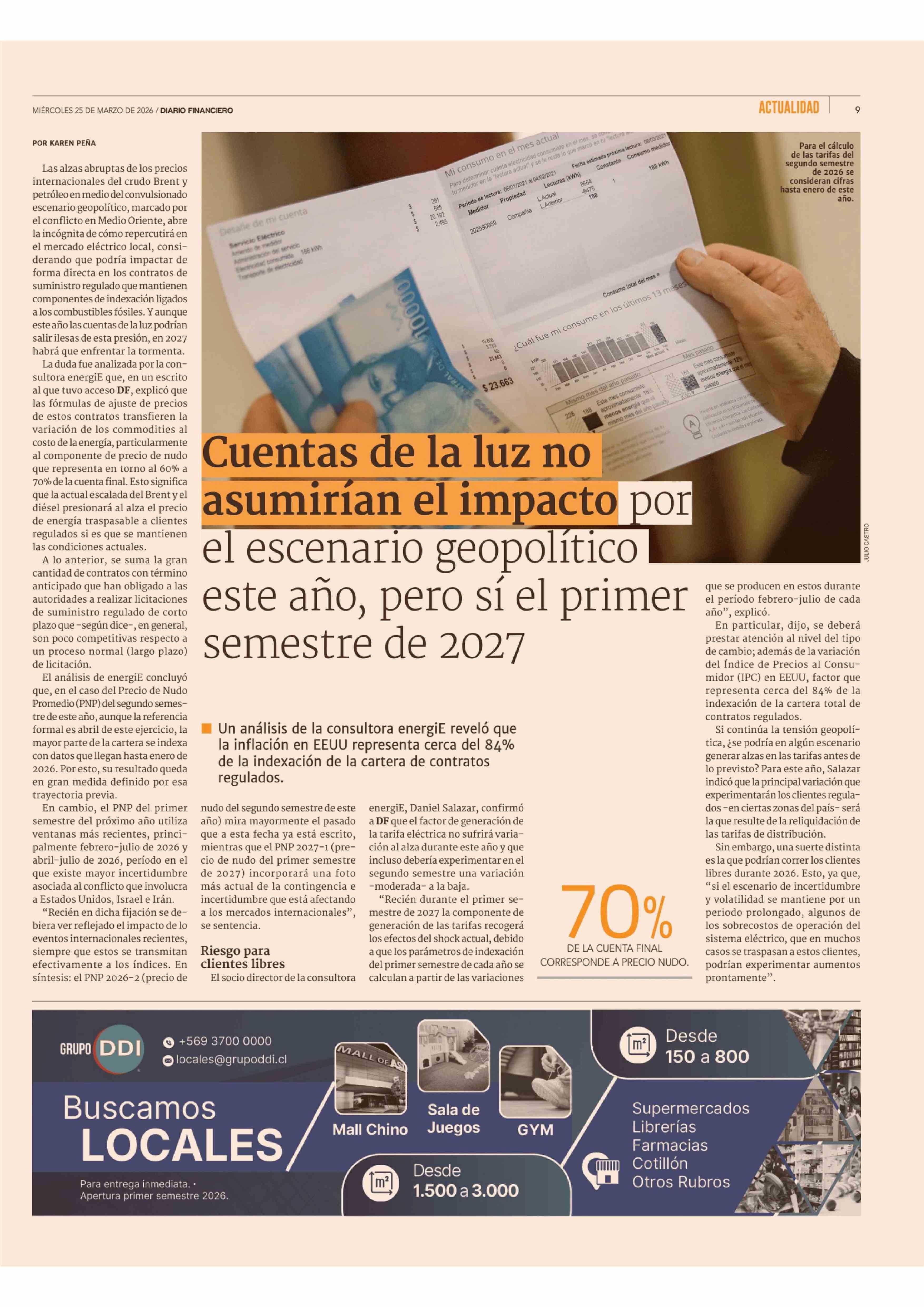 Cuentas de la luz no asumirían el impacto por el escenario geopolítico este año, pero sí el primer semestre de 2027 25-03-2026 Diario Financiero |