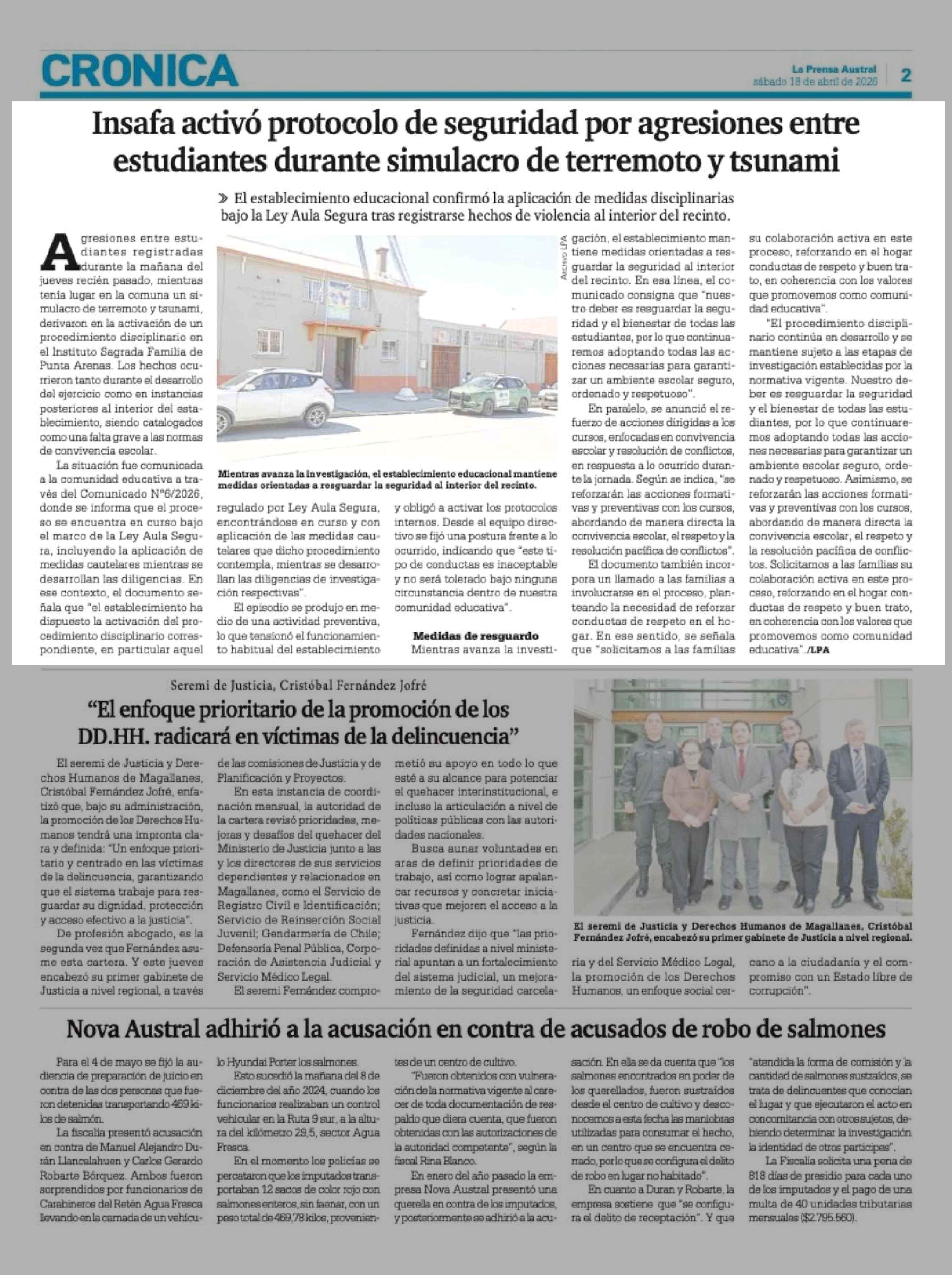 Insafa activó protocolo de seguridad por agresiones entre estudiantes durante simulacro de terremoto y tsunami 18-04-2026 La Prensa Austral |