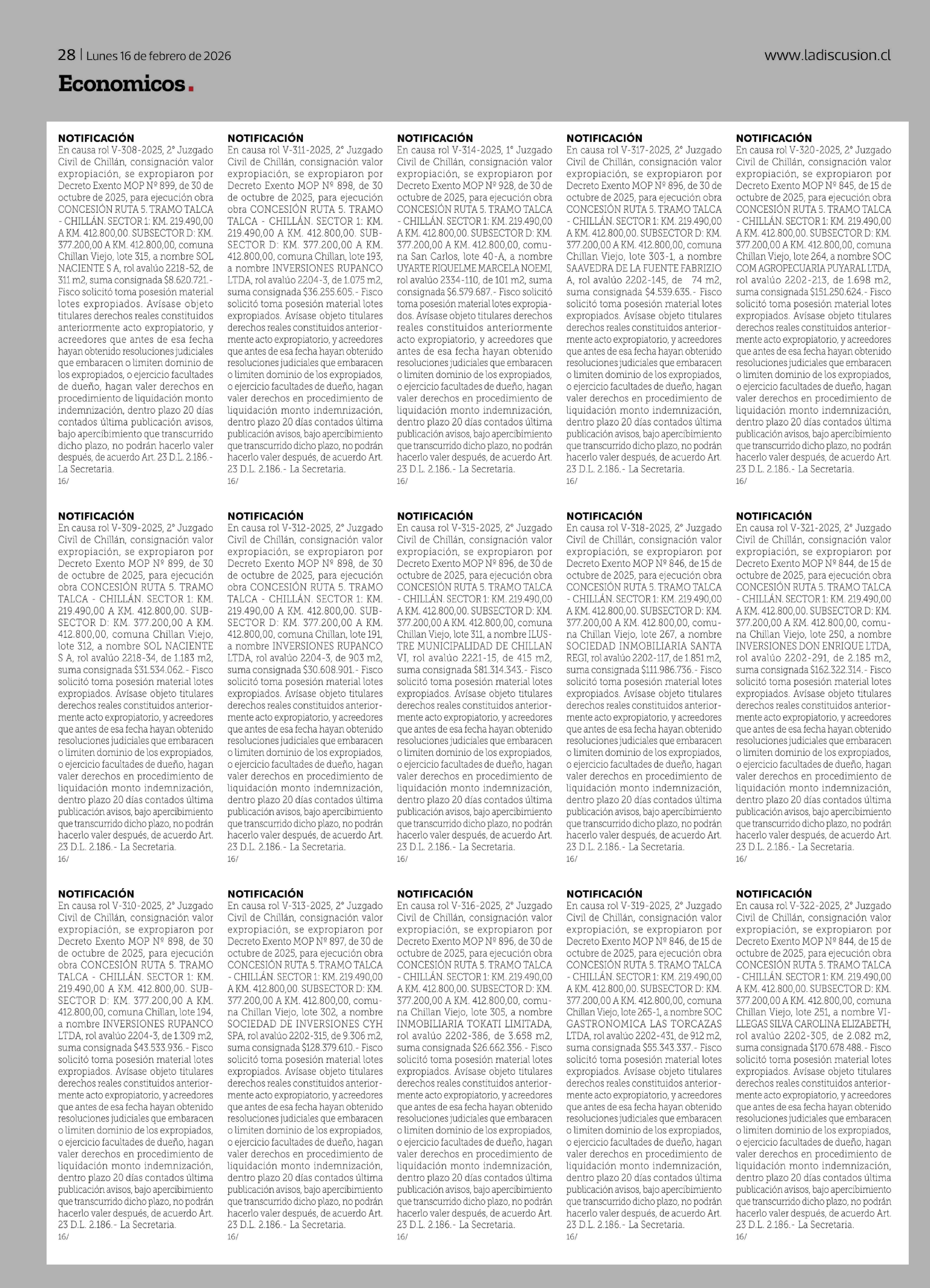 | Título: | NOTIFICACIÓN En causa rol V-309-2025, 2° Juzgado Civil de Chillán, consignación valor expropiación, se expropiaron por Decreto Exento MOP Nº 899, de 30 de octubre de 2025, para ejecución obra CONCESIÓN RUTA 5. TRAMO TALCA - CHILLÁN. SECTOR 1: KM. 219.490,00 AKM. 412.800,00. SUBSECTOR D: KM. 377.200, |