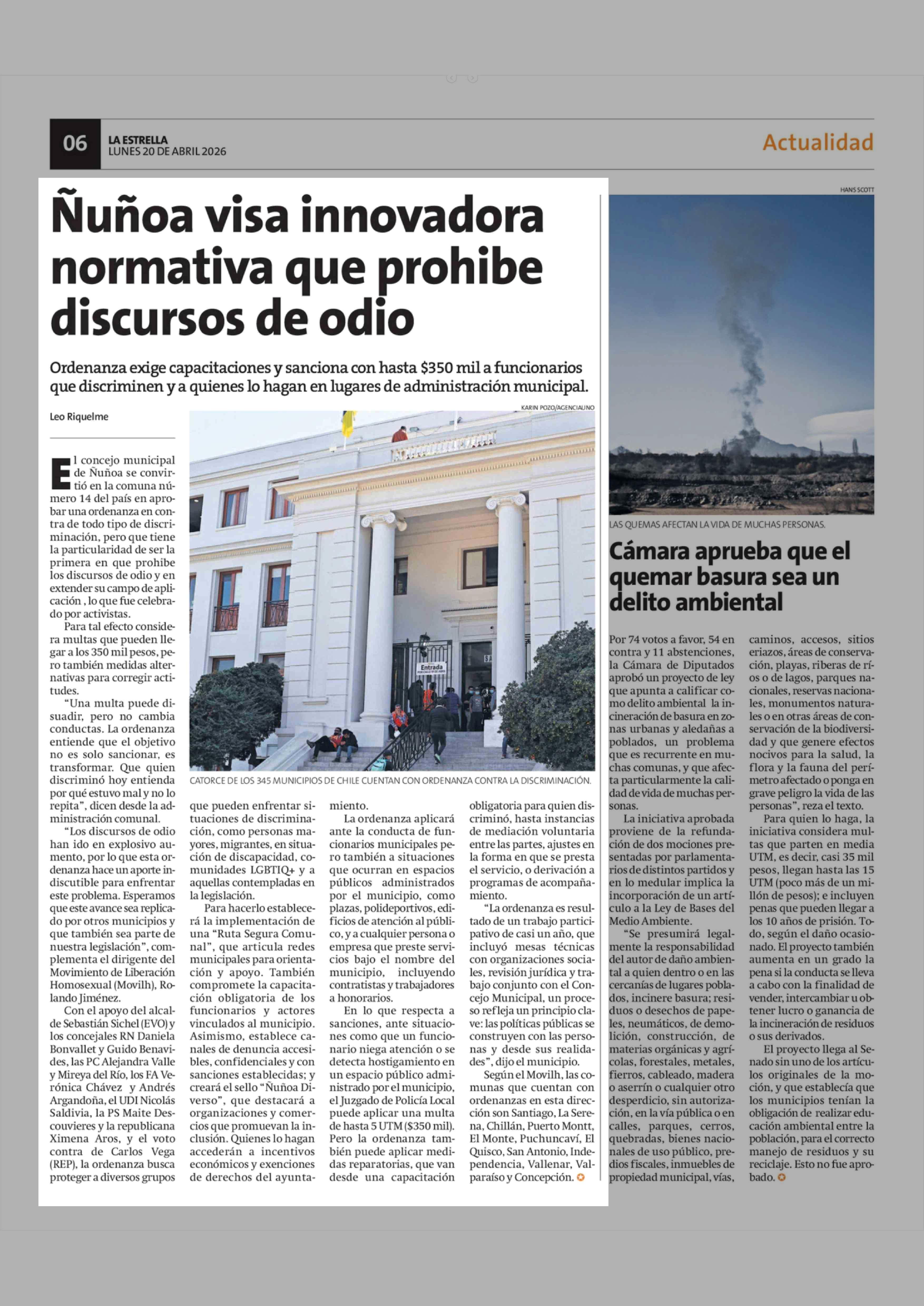 Ñuñoa visa innovadora normativa que prohibe discursos de odio 20-04-2026 La Estrella de Antofagasta |