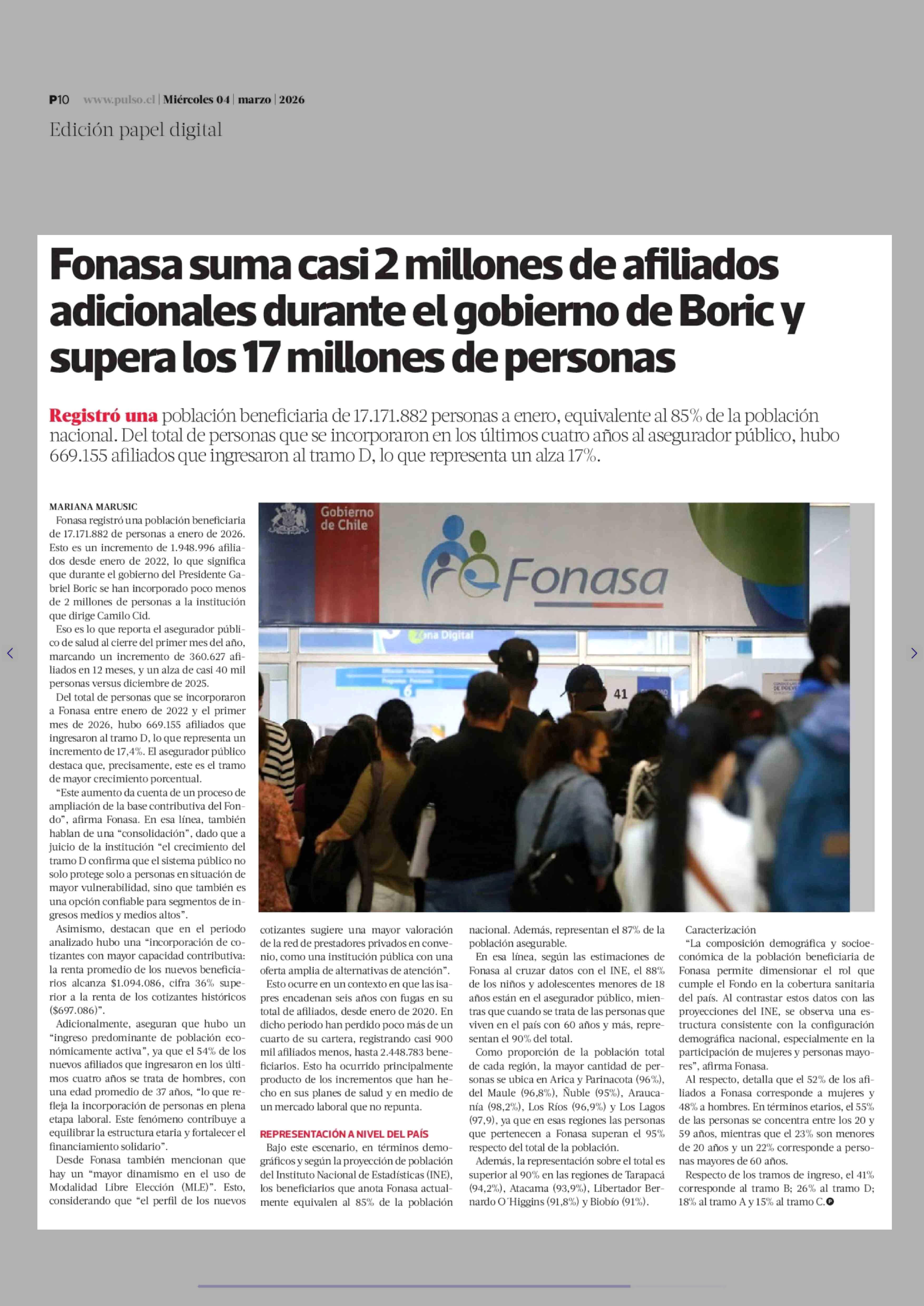 Fonasa suma casi 2 millones de afiliados adicionales durante el gobierno de Boric y supera los 17 millones de personas 04-03-2026 La Tercera |