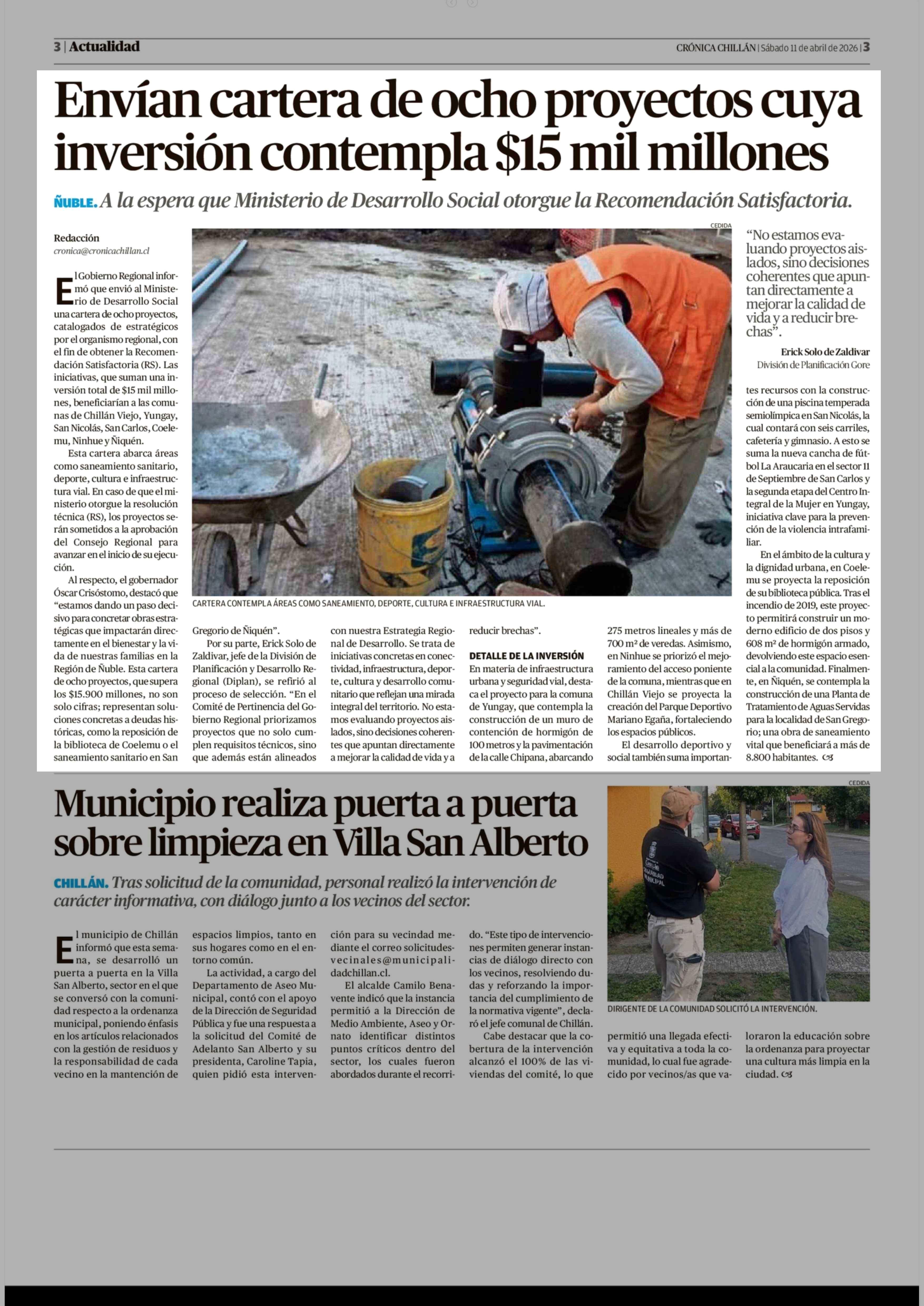 Envían cartera de ocho proyectos cuya inversión contempla $15 mil millones 11-04-2026 Crónica de Chillán |