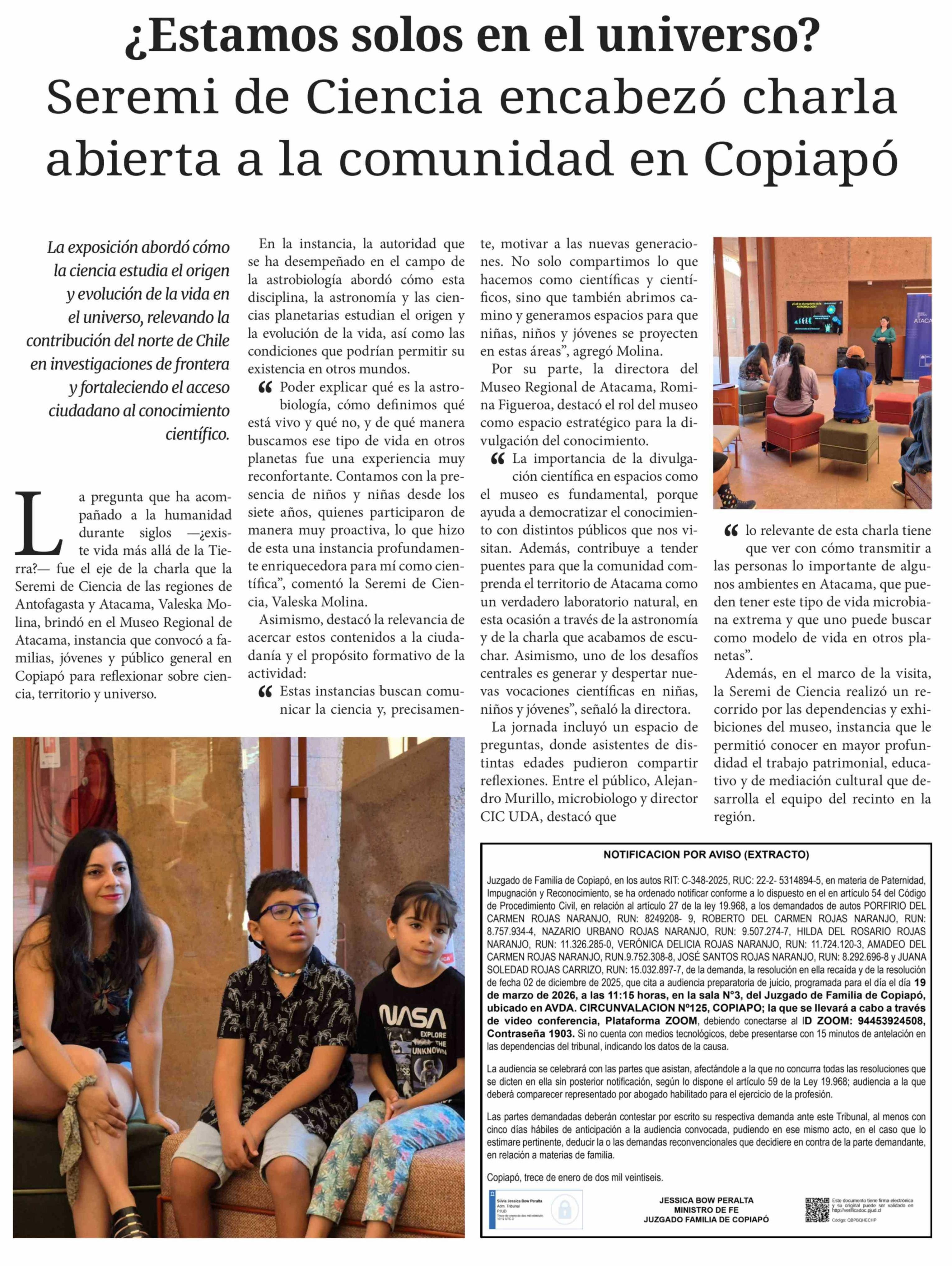 ¿Estamos solos en el universo? Seremi de Ciencia encabezó charla abierta a la comunidad en Copiapó 24-02-2026 Diario Chañarcillo |