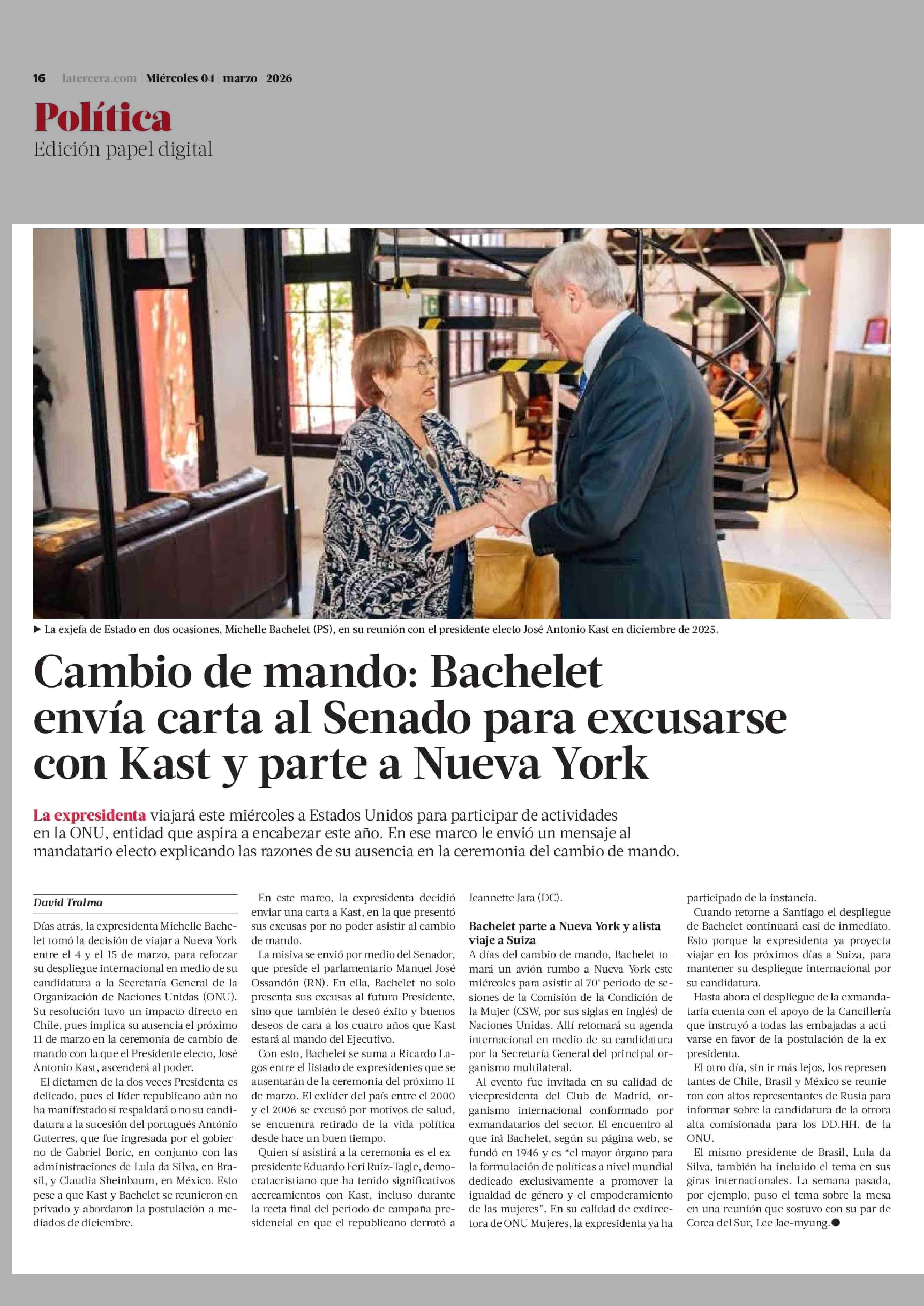 Cambio de mando: Bachelet envía carta al Senado para excusarse con Kast y parte a Nueva York 04-03-2026 La Tercera |