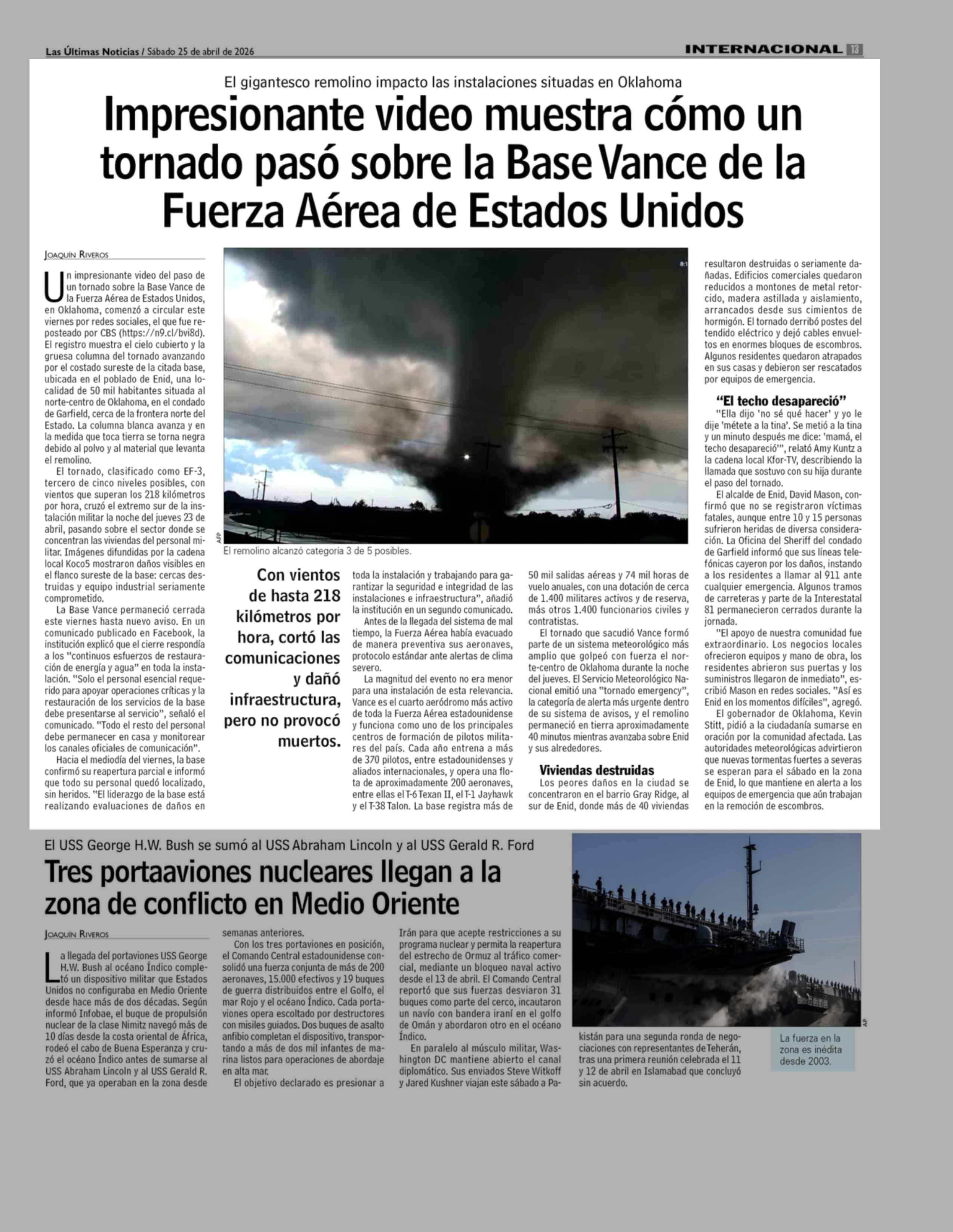 Impresionante video muestra cómo un tornado pasó sobre la Base Vance de la Fuerza Aérea de Estados Unidos 25-04-2026 Las Últimas Noticias |