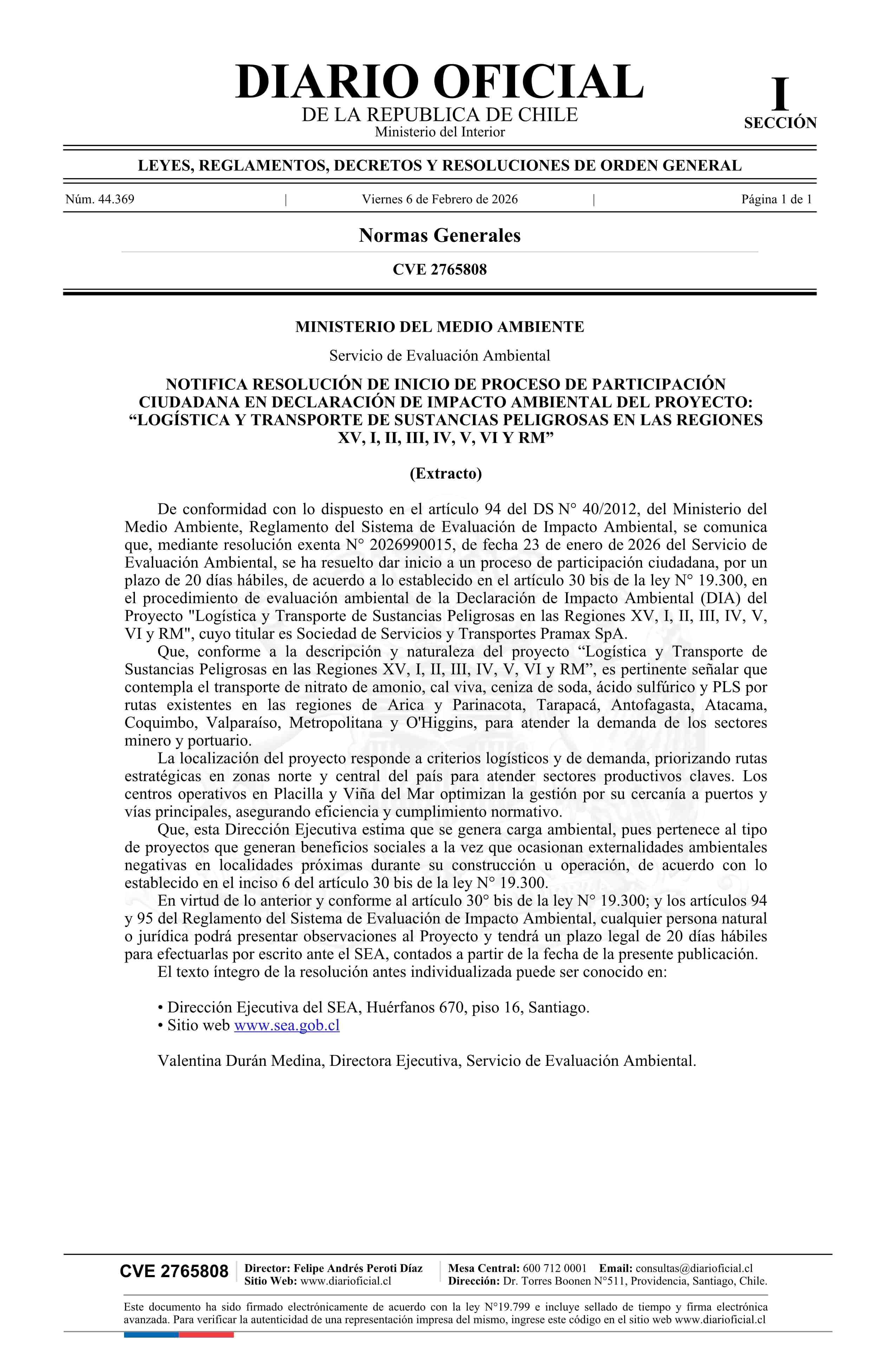 | Título: | Extracto de resolución exenta número 2026990015, de 2026.- Da inicio a Proceso de Participación Ciudadana en Declaración de Impacto Ambiental del proyecto: Logística y Transporte de Sustancias Peligrosas en las Regiones XV, I, II, III, IV, V, VI y RM |