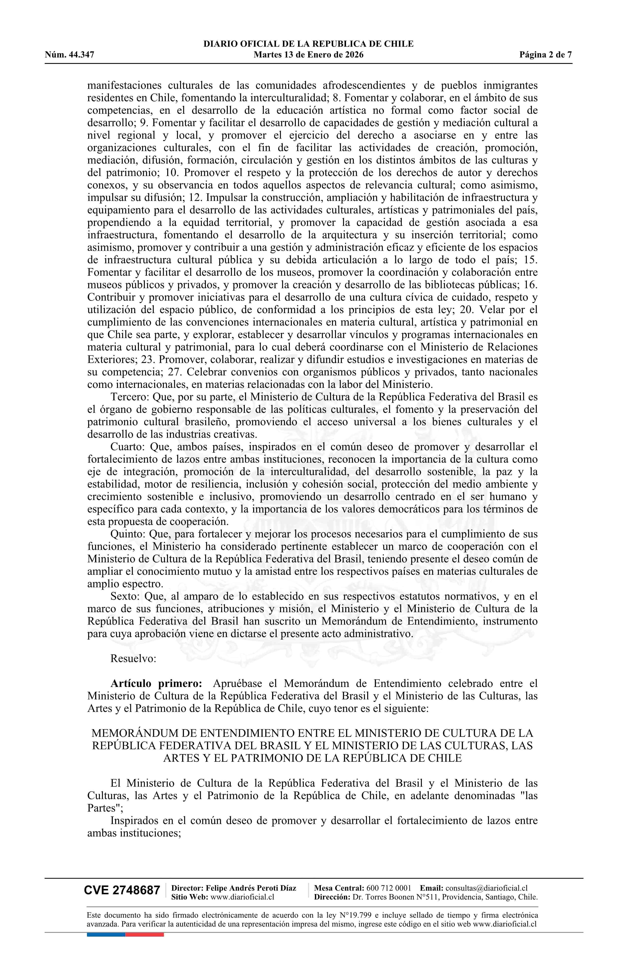 Resolución exenta número 22, de 2025.- Aprueba Memorando de Entendimiento suscrito entre el Ministerio de las Culturas, las Artes y el Patrimonio de la República de Chile y el Ministerio de Cultura de la República Federativa del Brasil 13-01-2026 DIARIO OFICIAL CHILE - BOLETÍN OFICIAL DE MINERÍA |