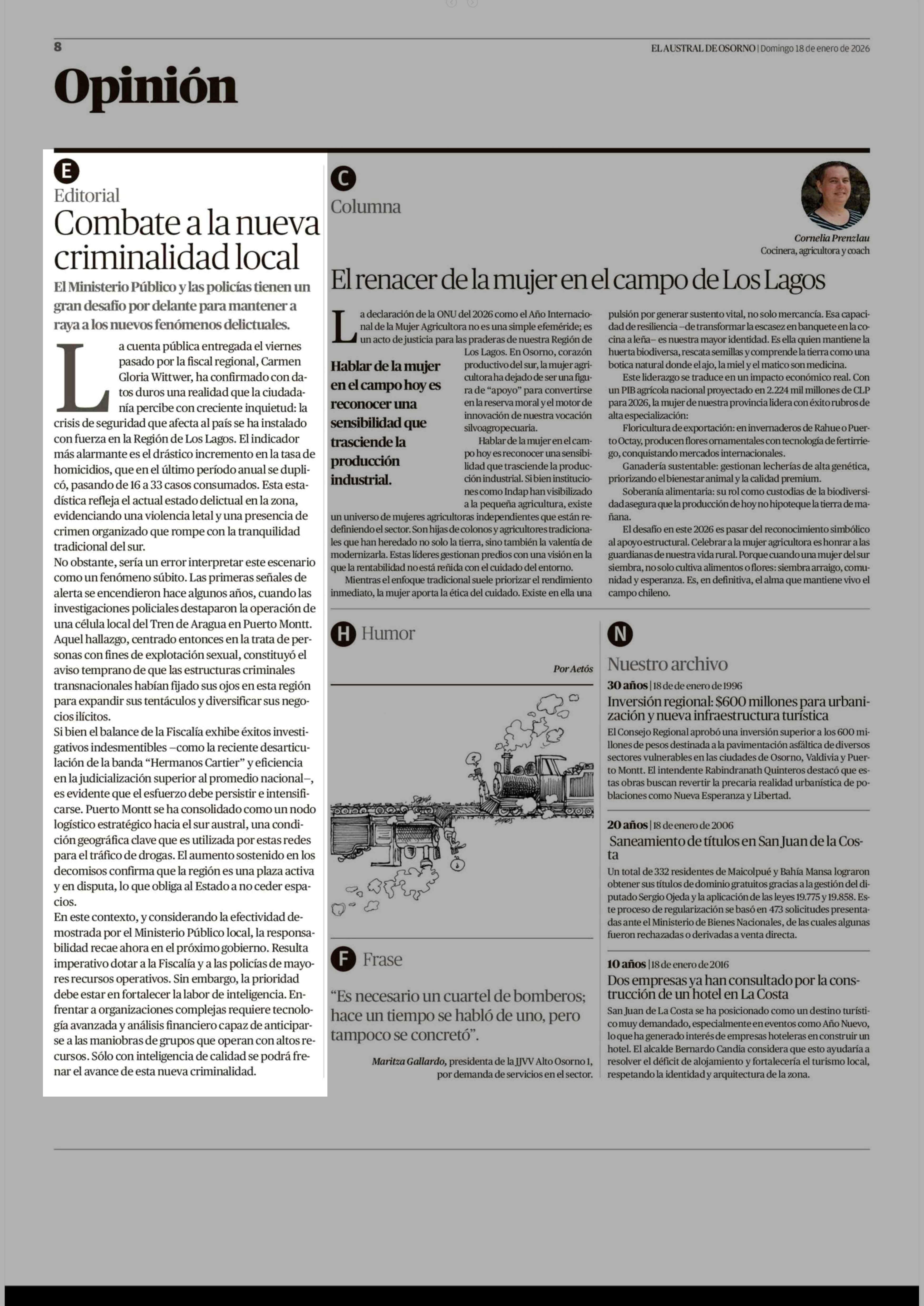 Editorial: Combate a la nueva criminalidad local 18-01-2026 El Austral de Osorno |