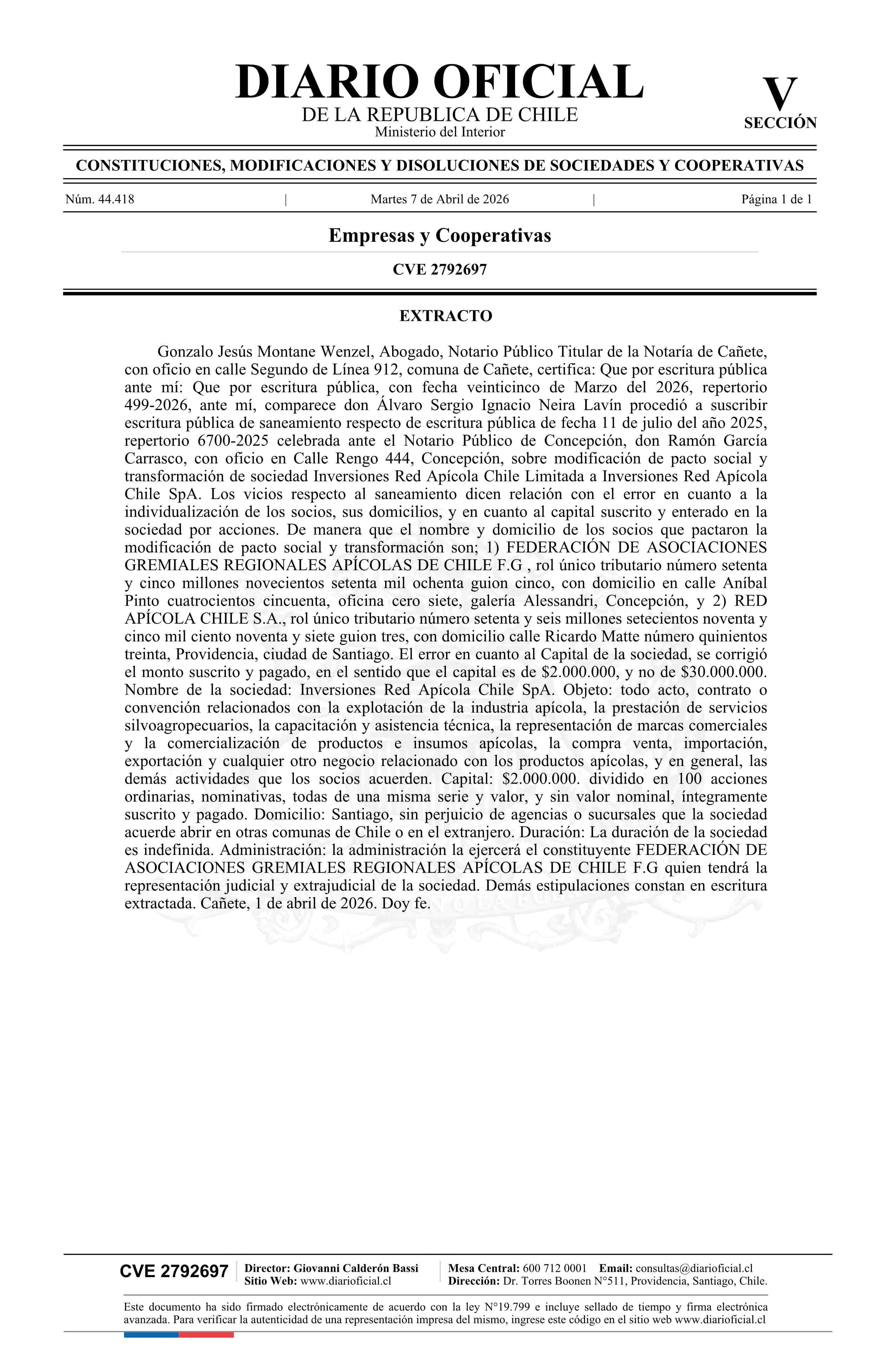 Inversiones Red Apícola Chile SpA 76.795.197-3* 07-04-2026 Diario Oficial Edición Electrónica |