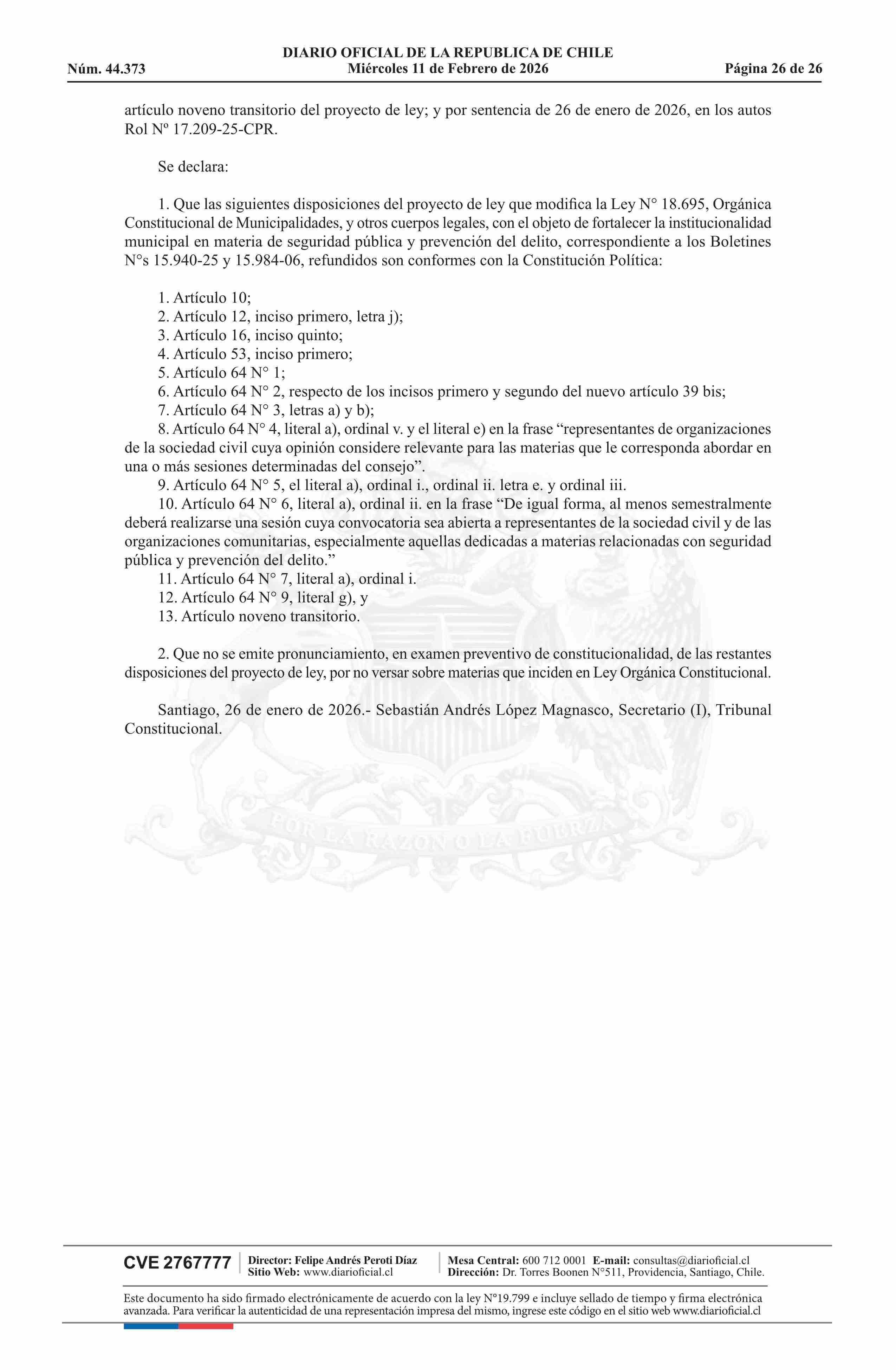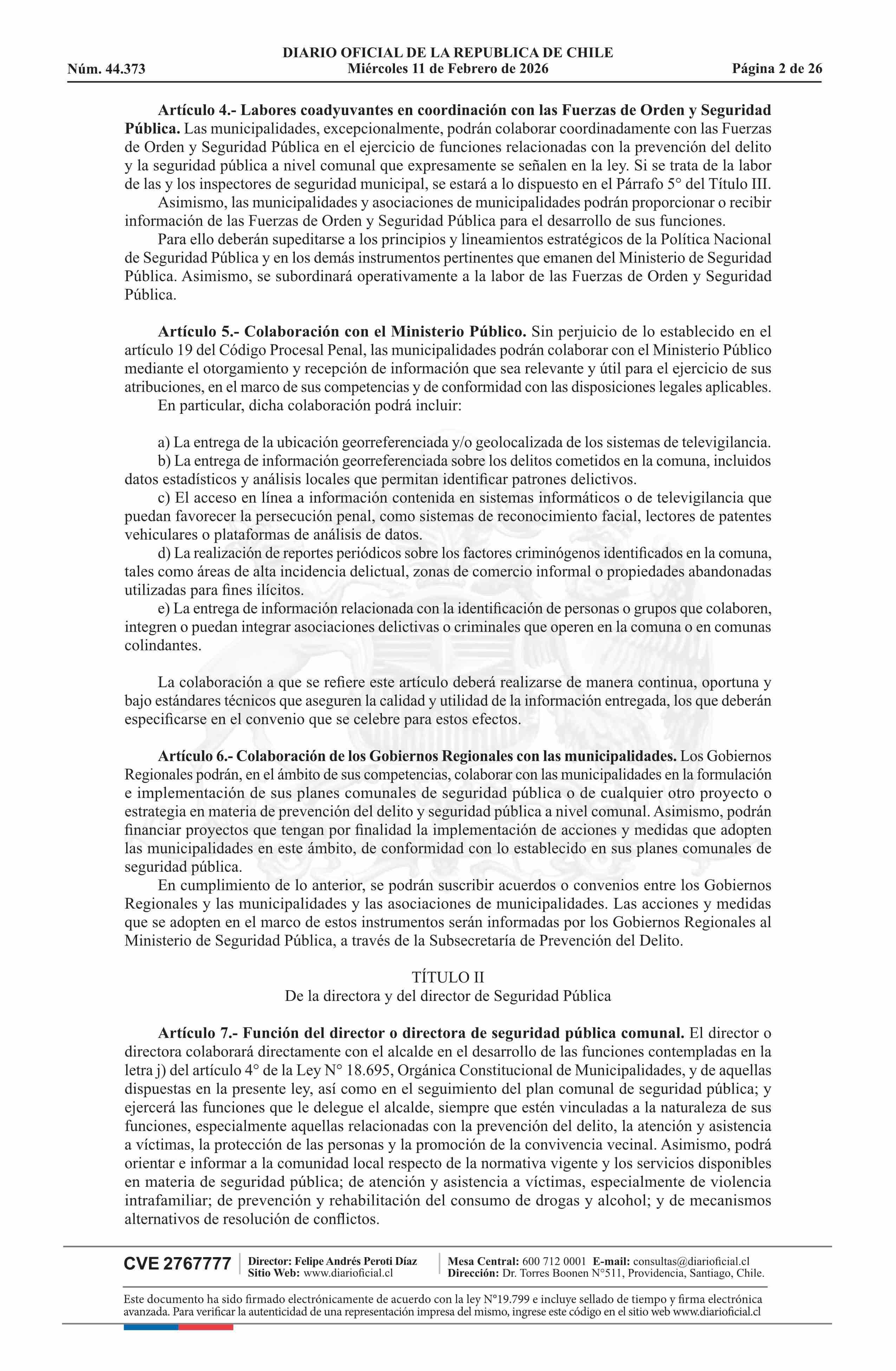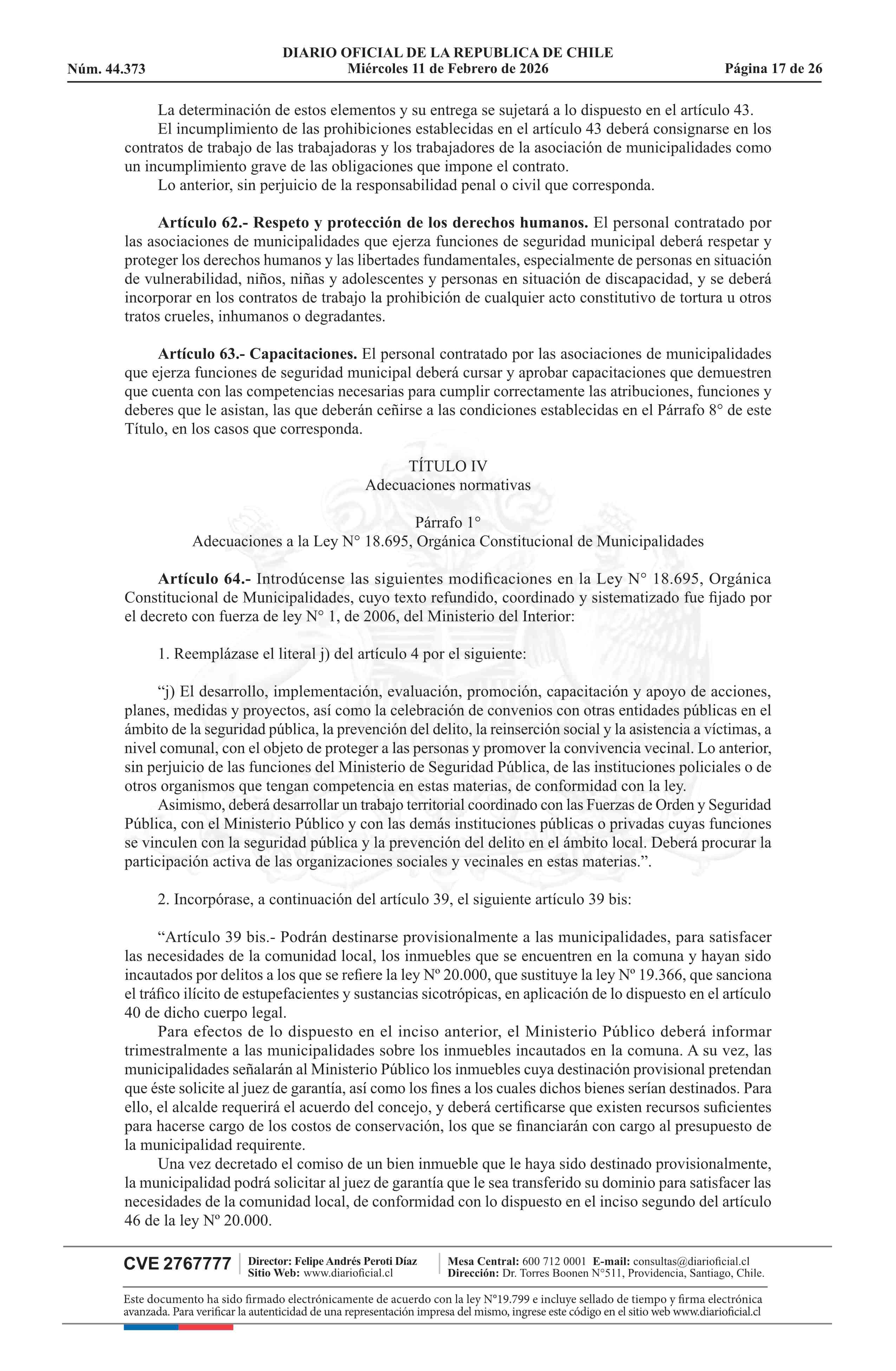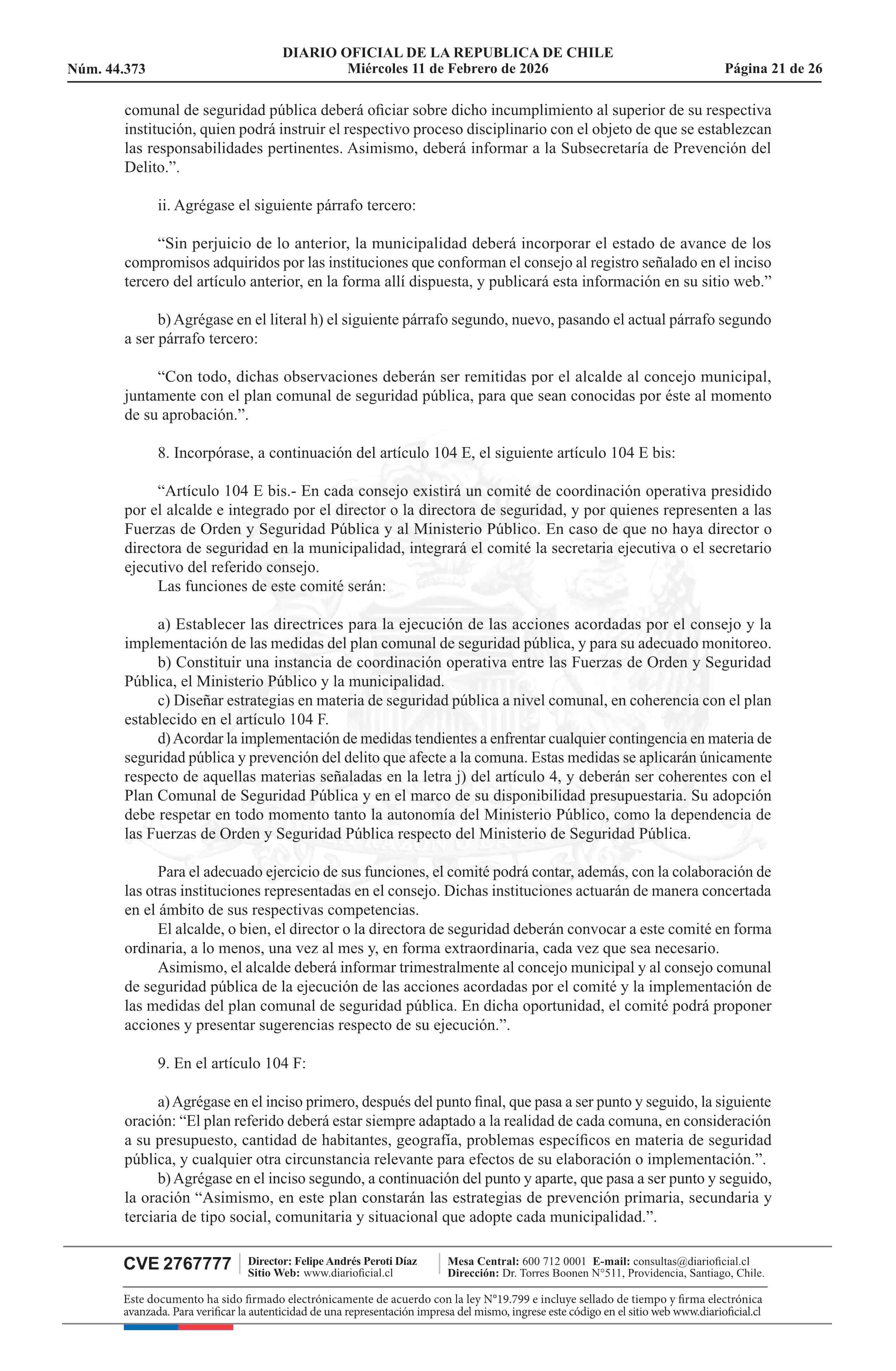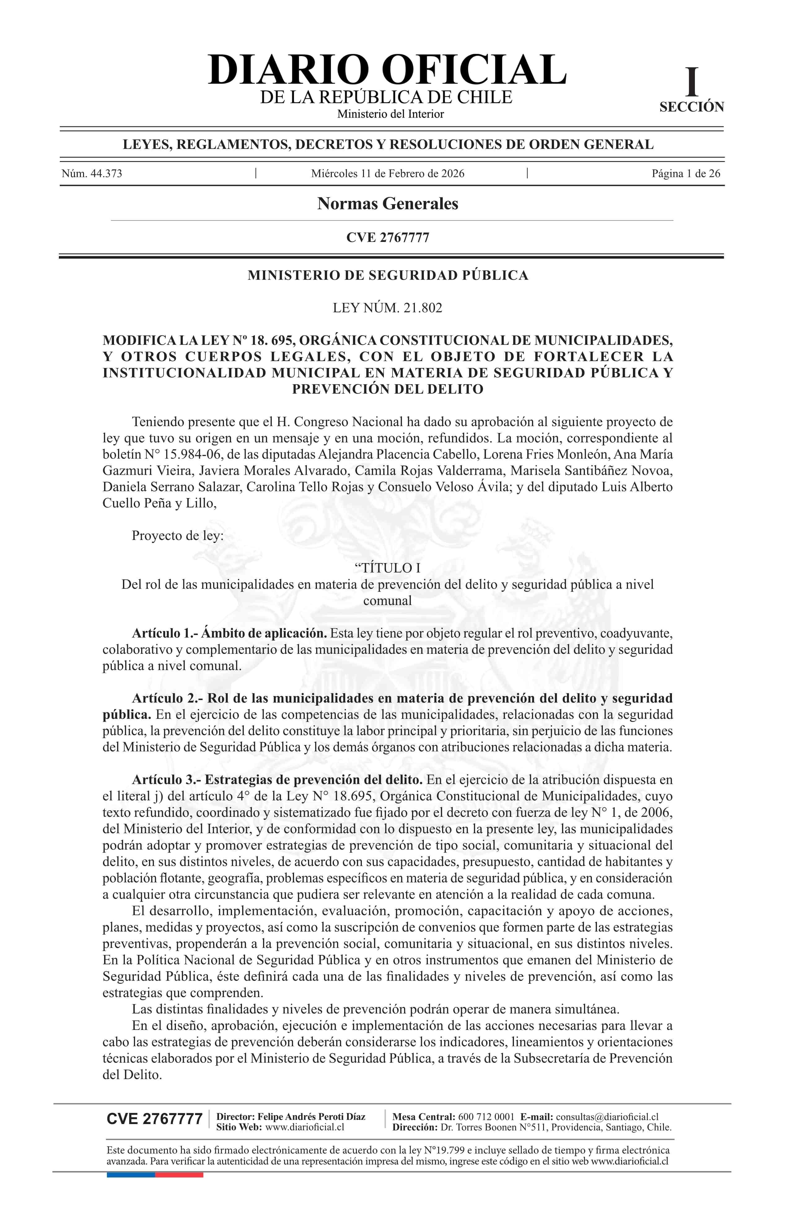 | Título: | Ley número 21.802.- Modifica la Ley N° 18.695, Orgánica Constitucional de Municipalidades, y otros cuerpos legales, con el objeto de fortalecer la institucionalidad municipal en materia de seguridad pública y prevención del delito |
