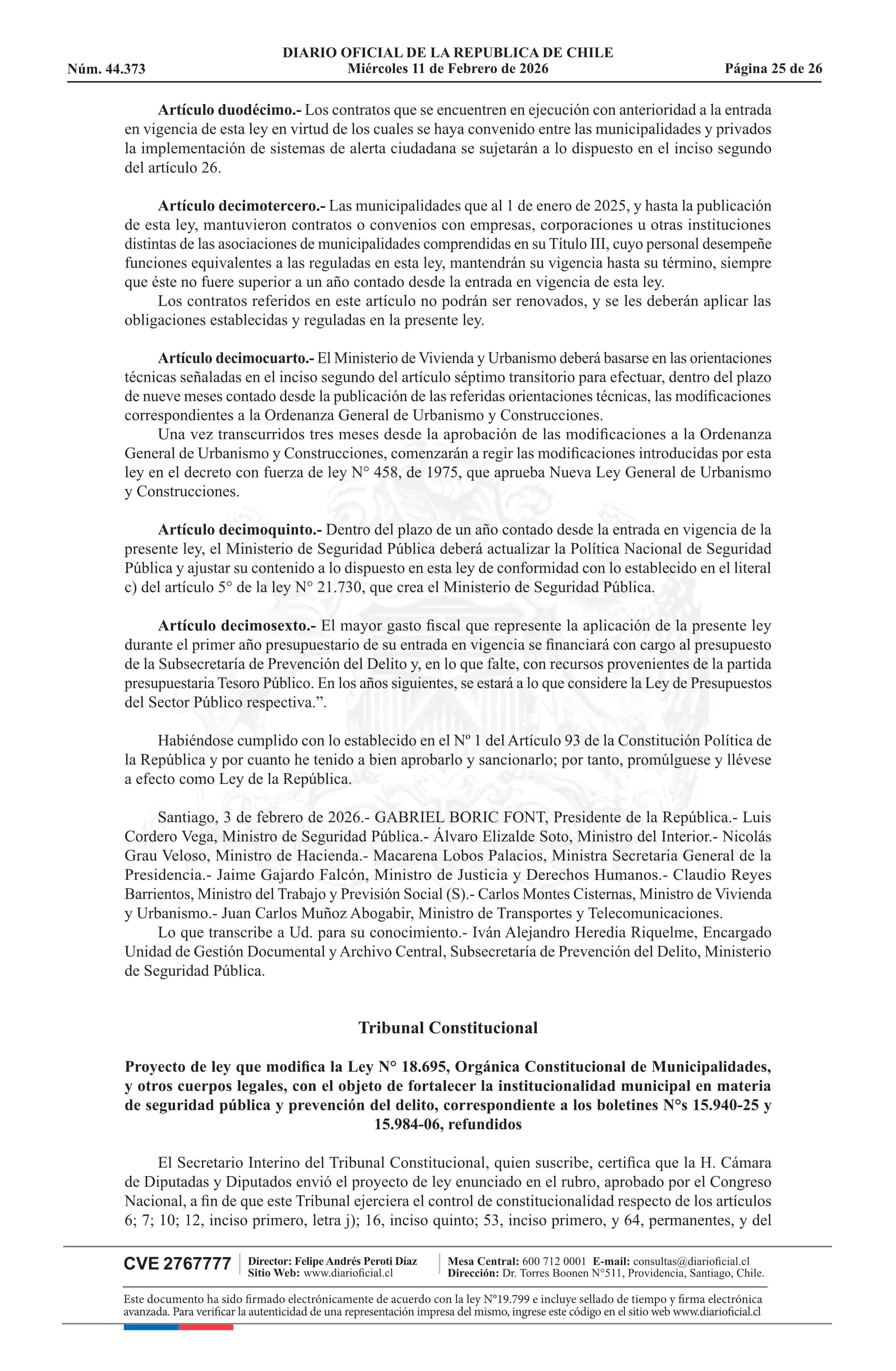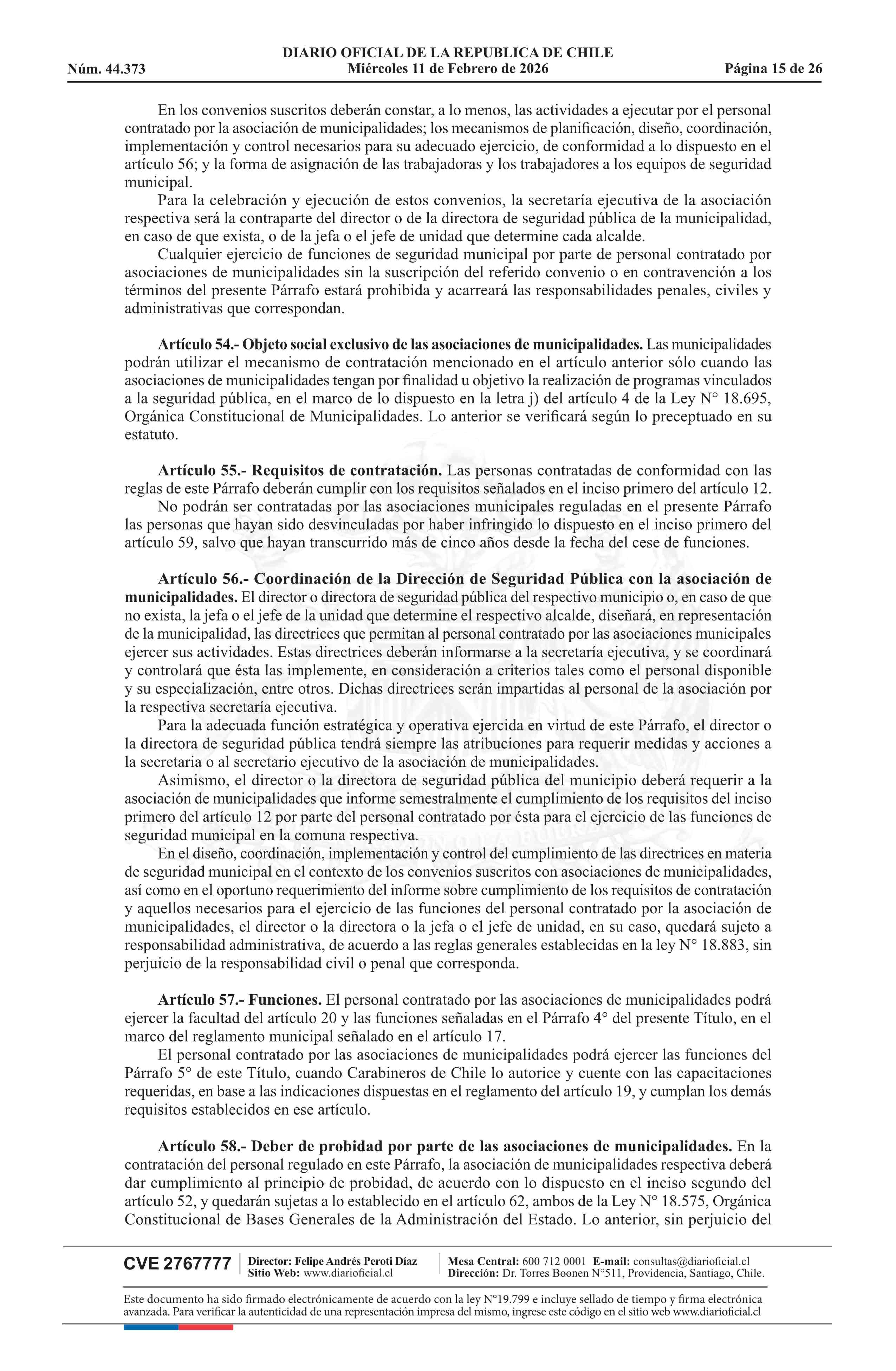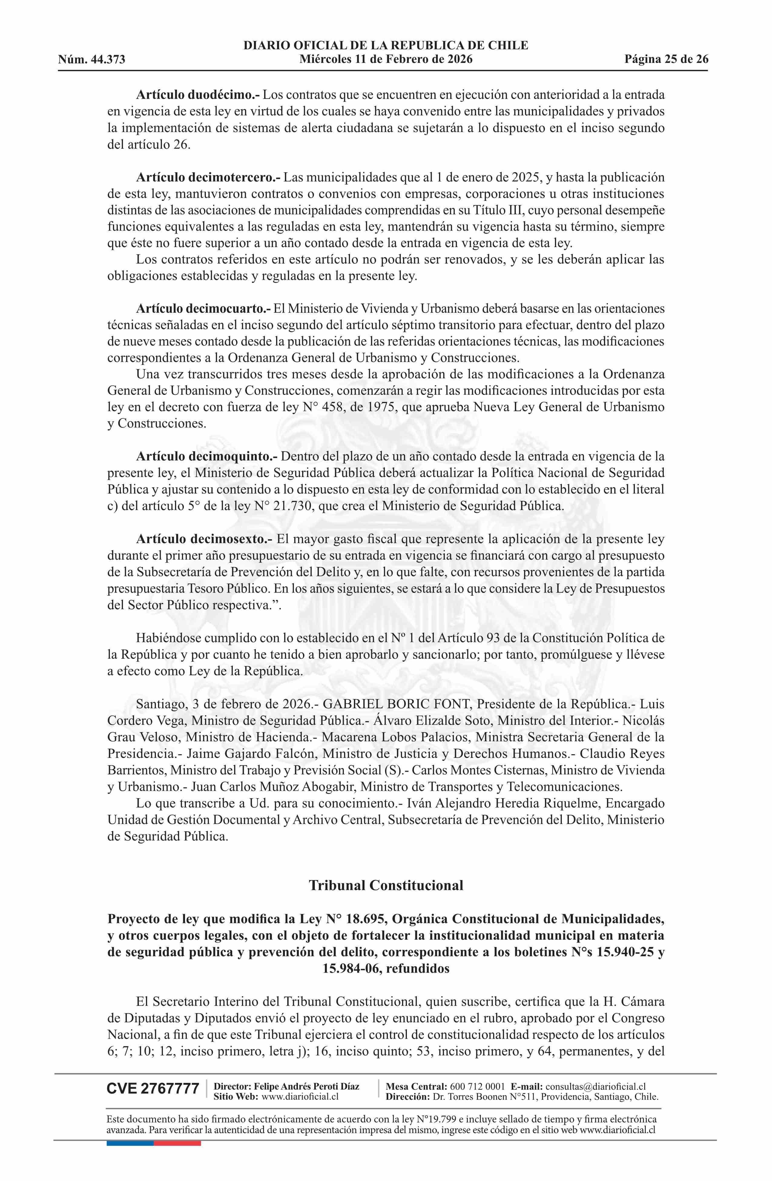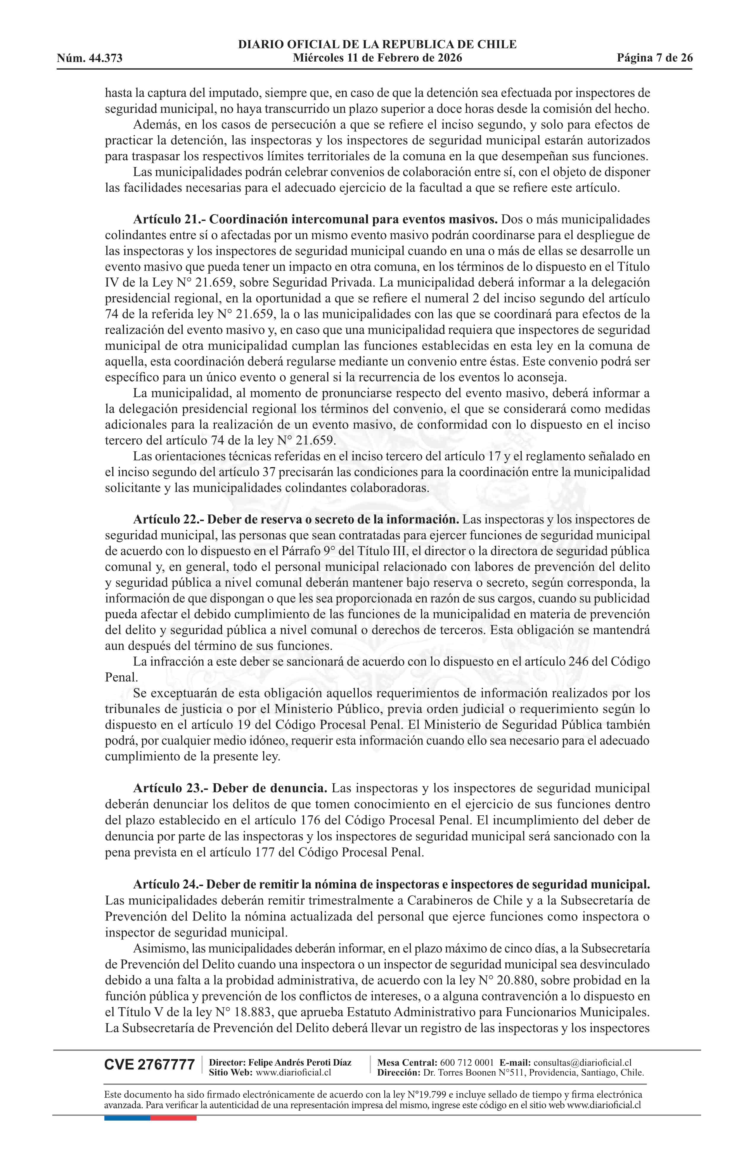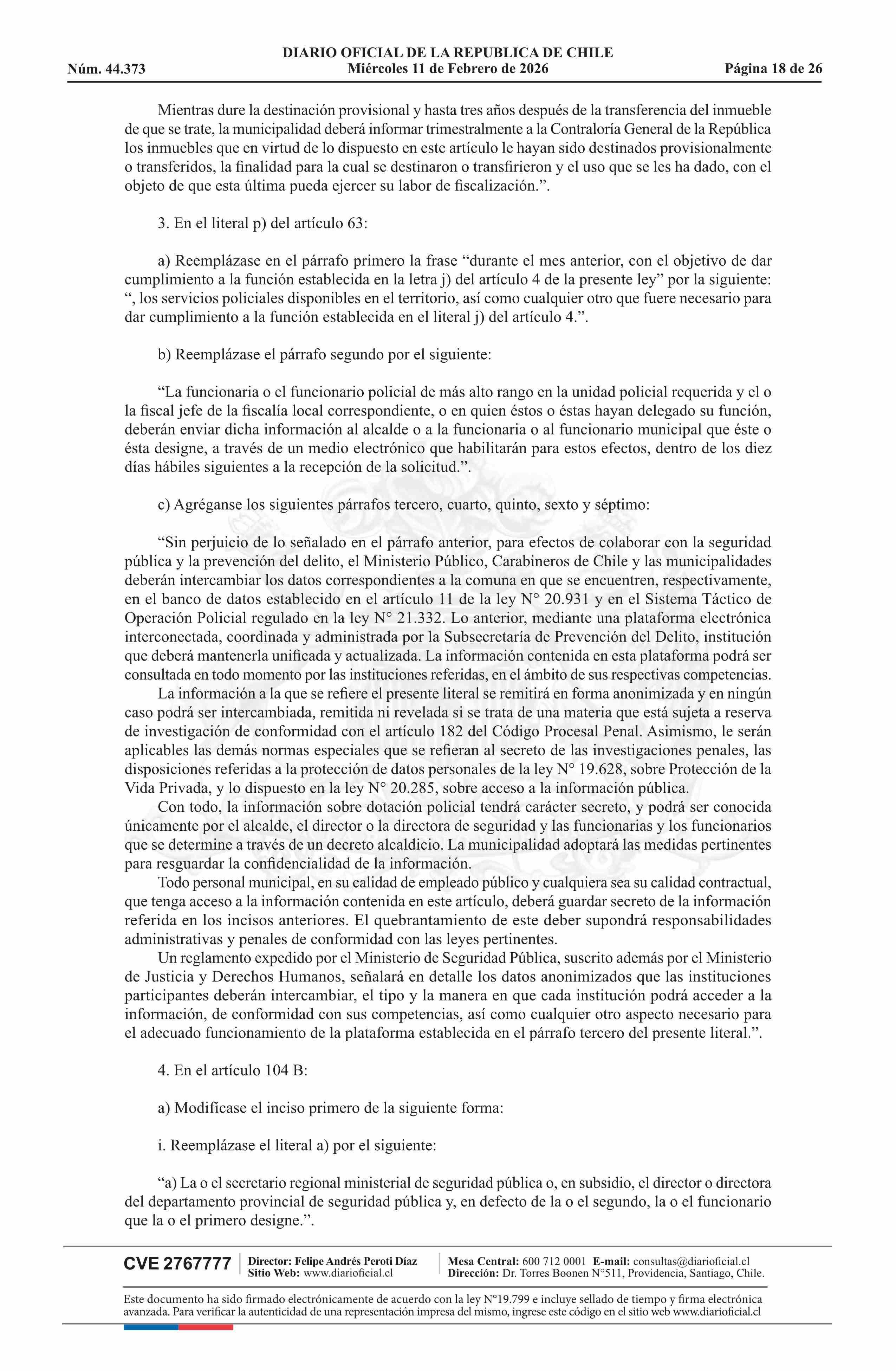 | Título: | Ley número 21.802.- Modifica la Ley N° 18.695, Orgánica Constitucional de Municipalidades, y otros cuerpos legales, con el objeto de fortalecer la institucionalidad municipal en materia de seguridad pública y prevención del delito |