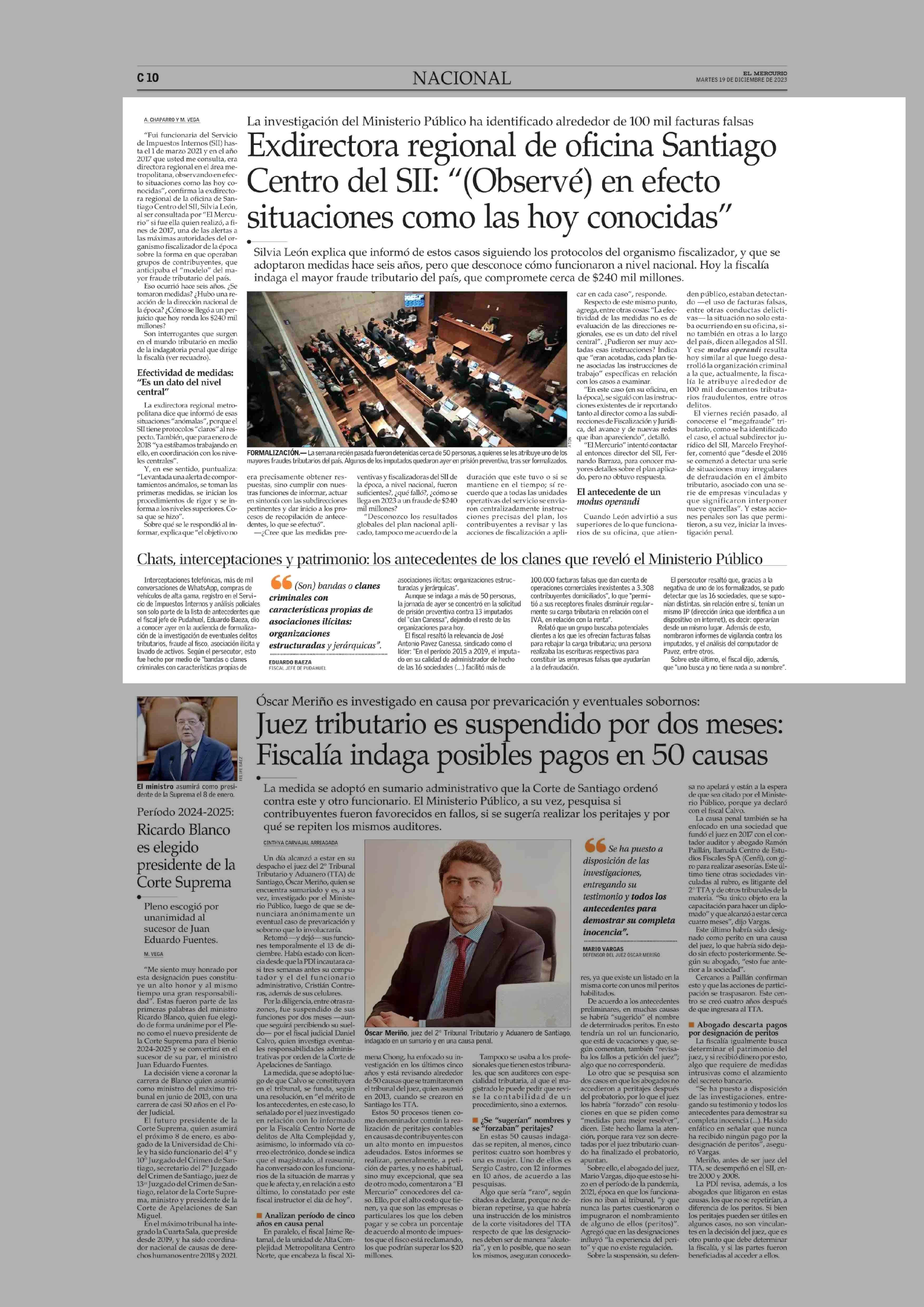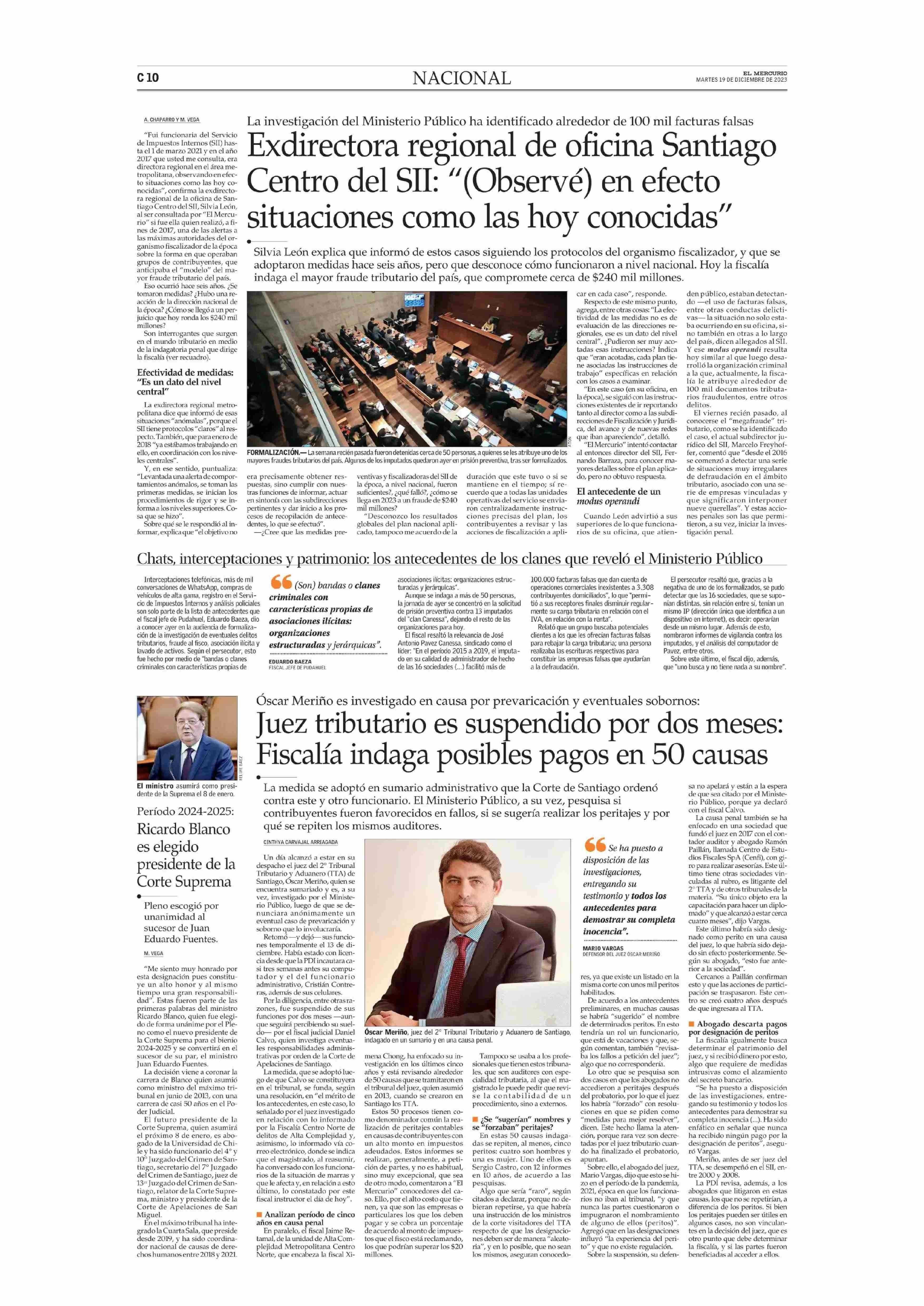 Exdirectora regional de oficina Santiago Centro del SII: “(Observé) en efecto situaciones como las hoy conocidas” 19-12-2023 El Mercurio Segunda Edición (C) - Chile |