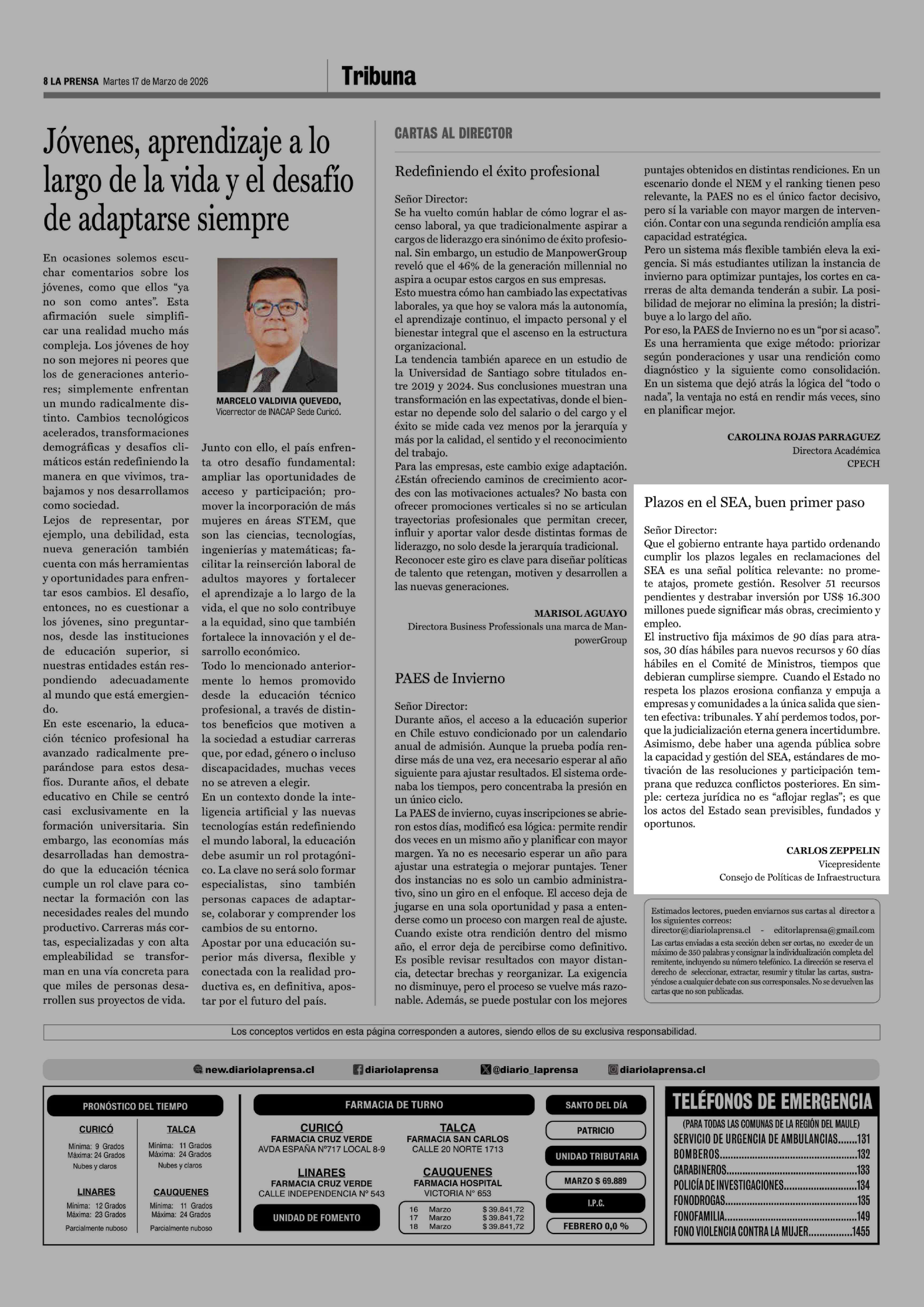 Cartas: Plazos en el SEA, buen primer paso 17-03-2026 La Prensa de Curicó |