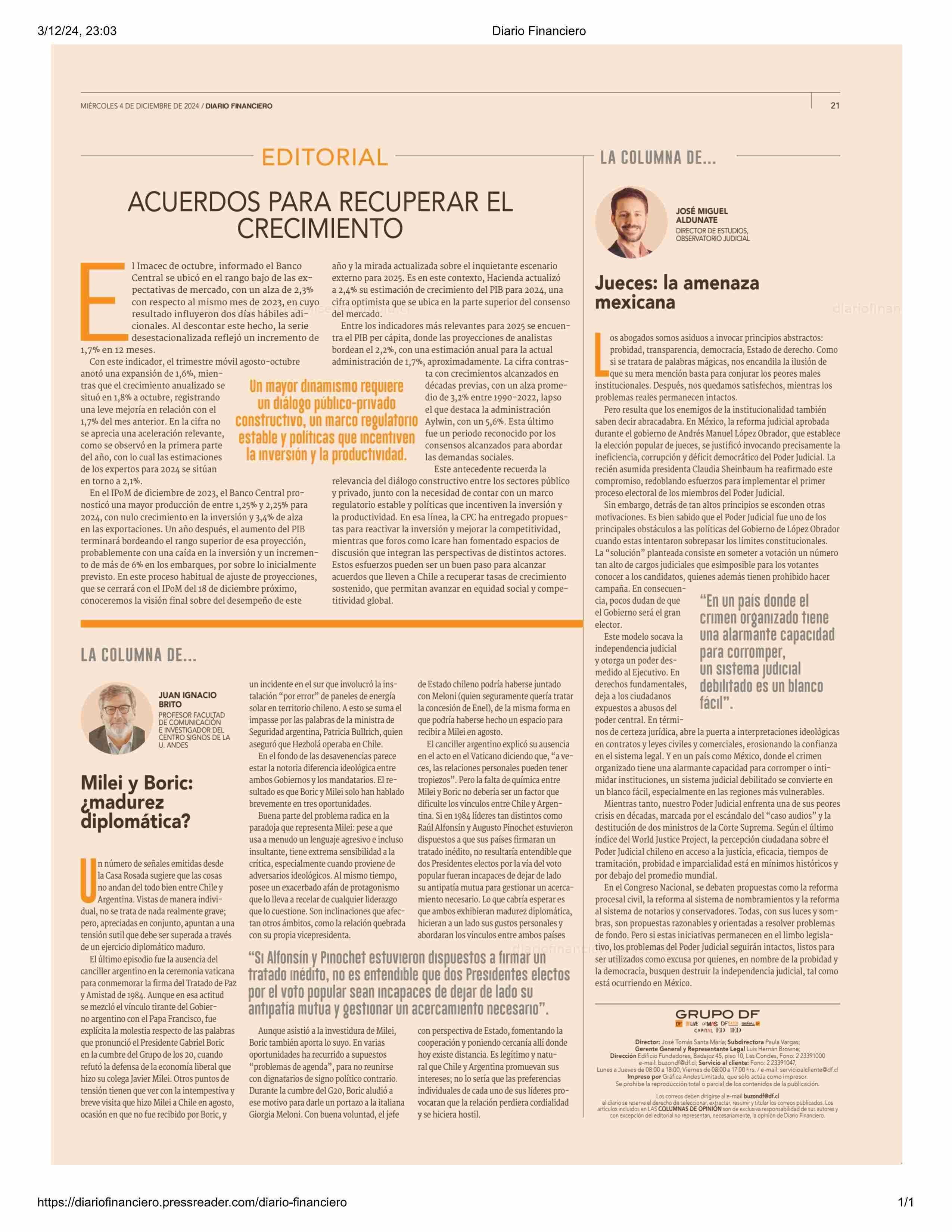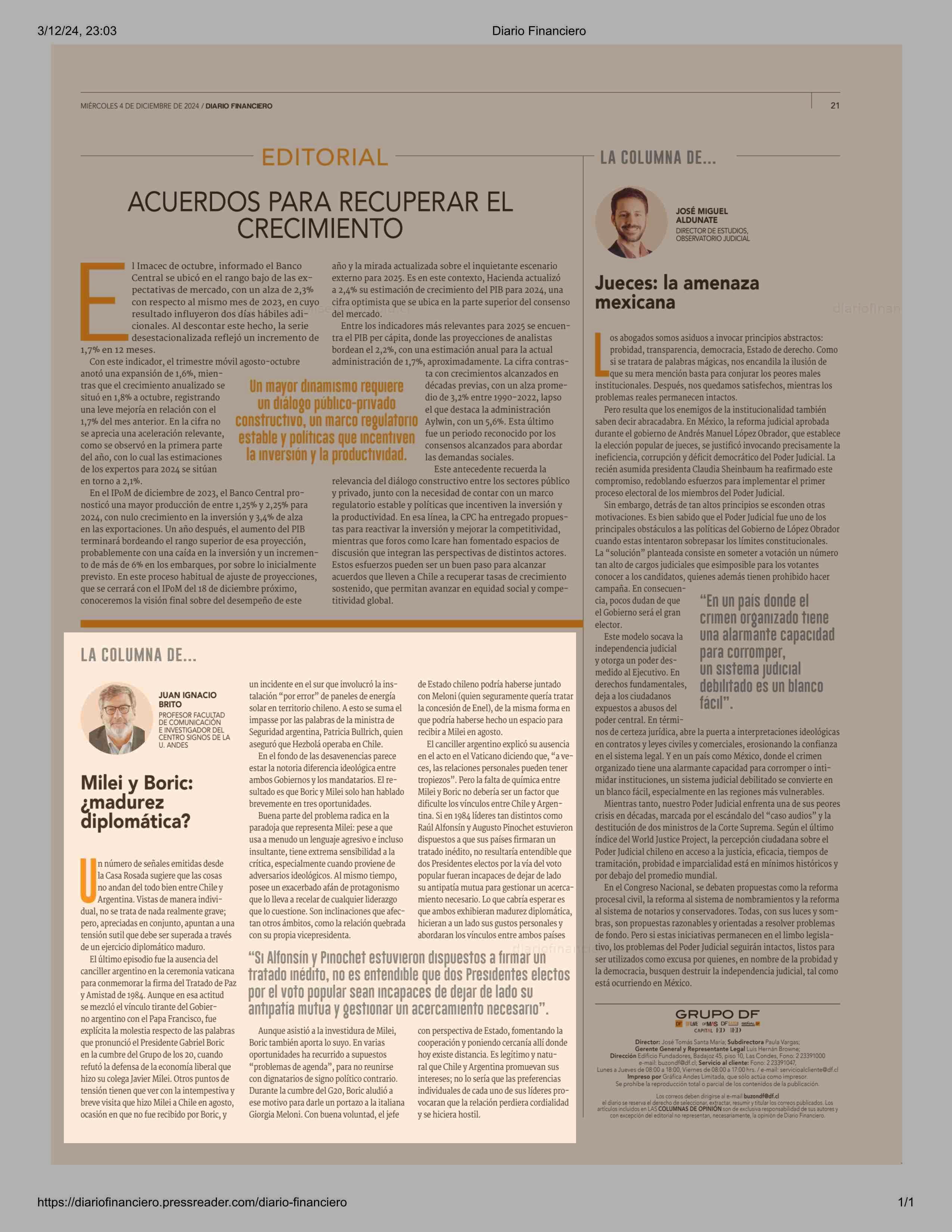 COLUMNAS DE OPINIÓN: Milei y Boric: madurez diplomática? 04-12-2024 Diario Financiero |