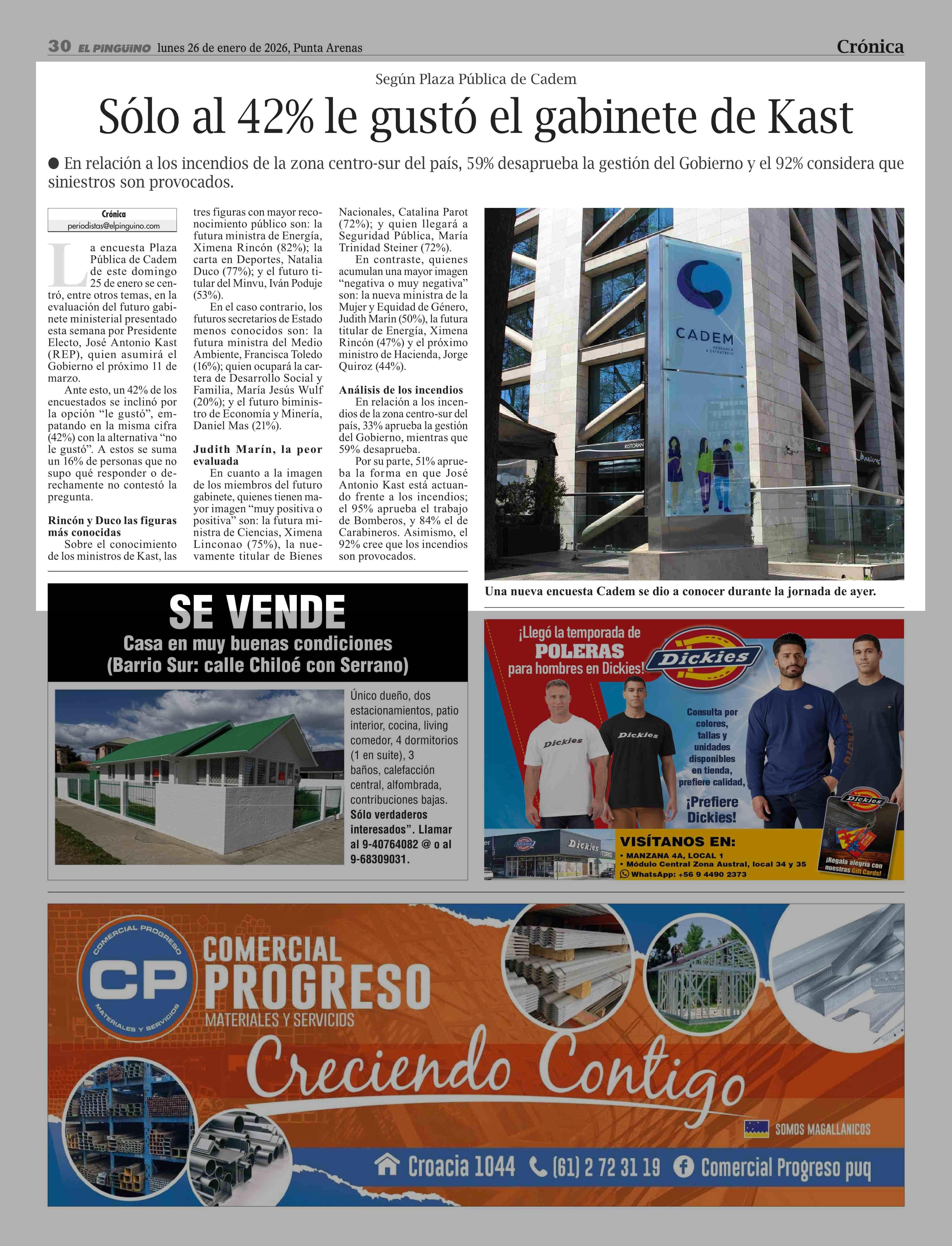 Sólo al 42% le gustó el gabinete de Kast 26-01-2026 El Pingüino |