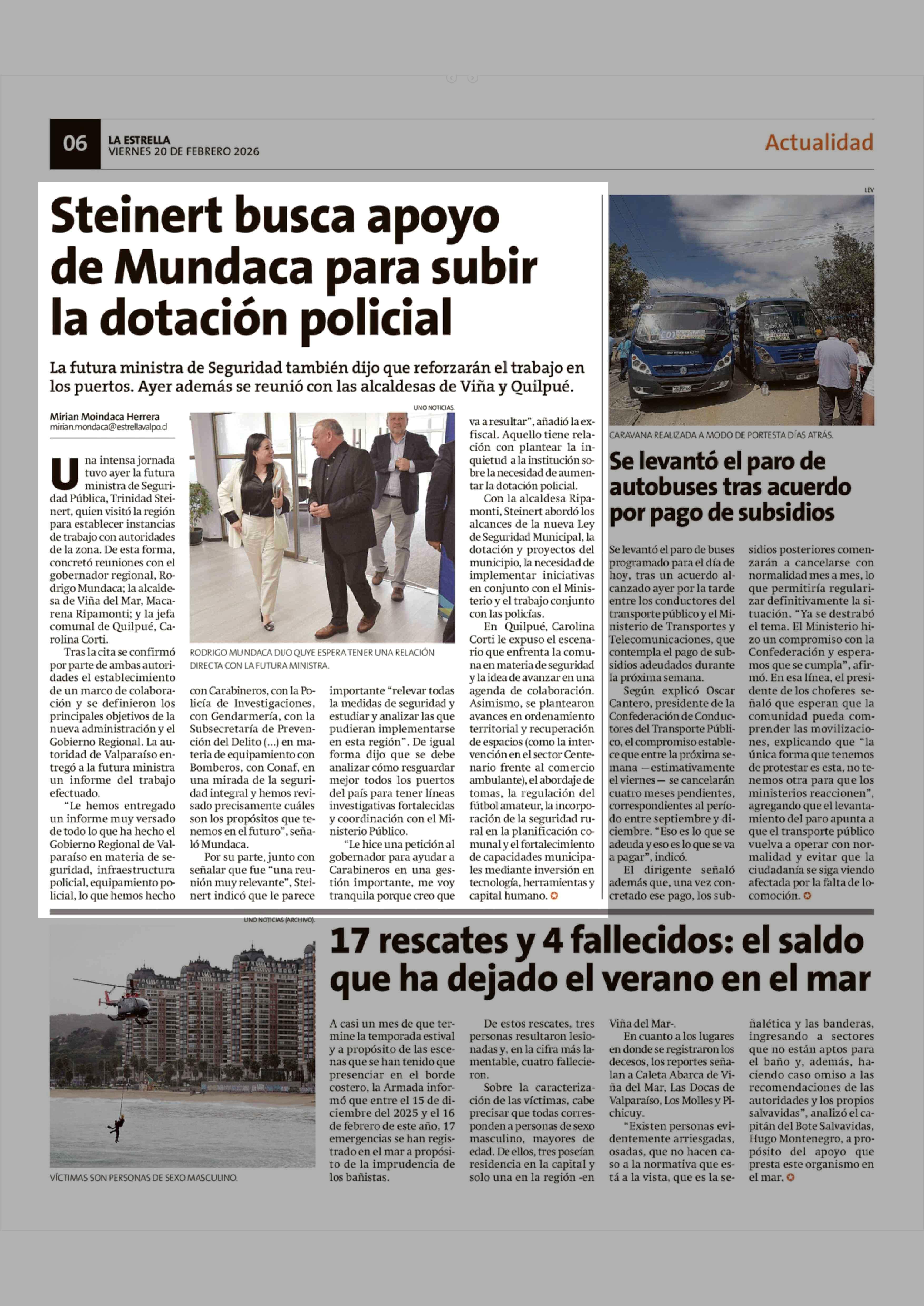 Steinert busca apoyo de Mundaca para subir la dotación policial 20-02-2026 La Estrella de Valparaíso |