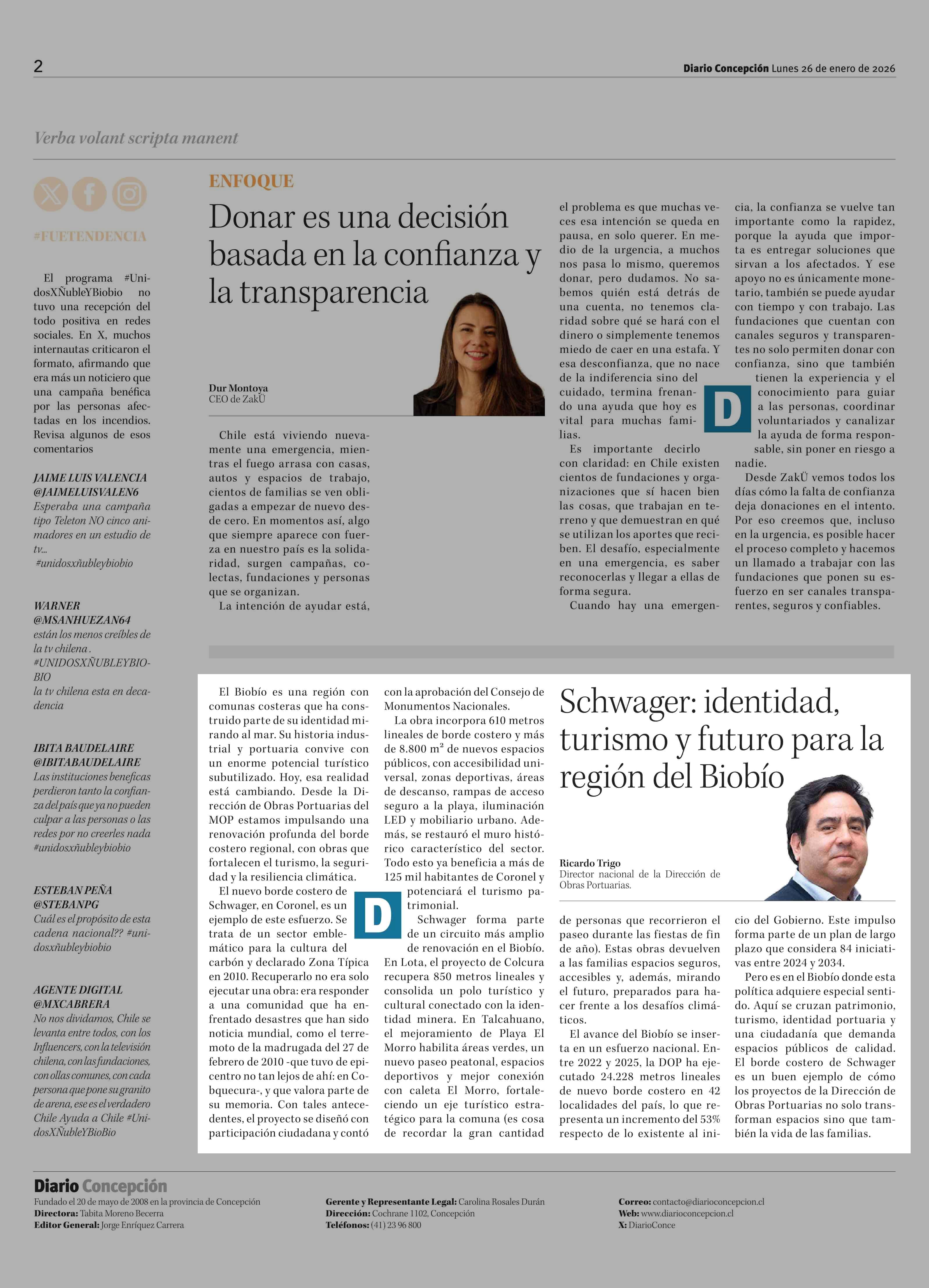 Columnas de Opinión: Schwager: identidad, turismo y futuro para la región del Biobío 26-01-2026 Diario Concepción |