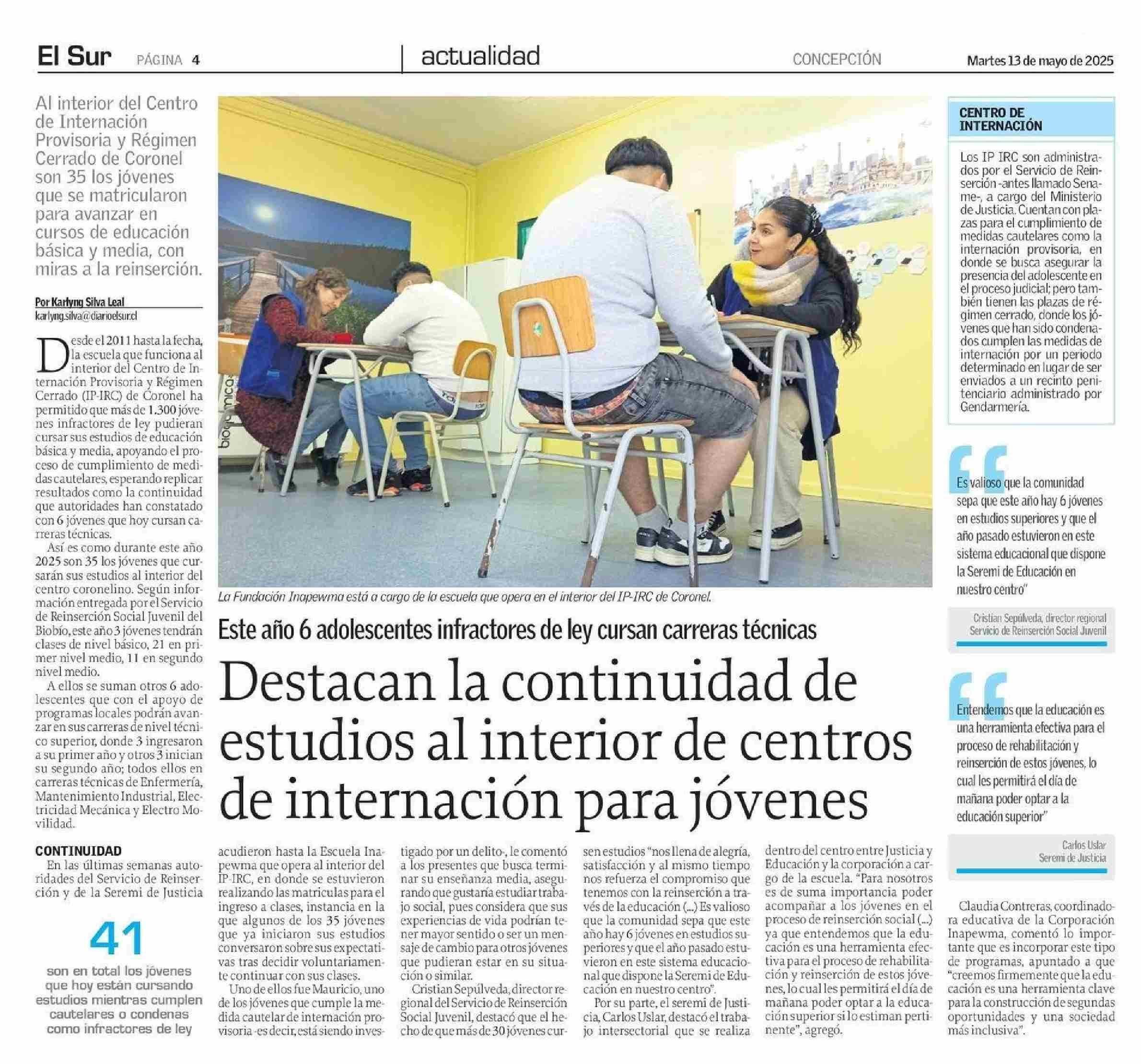 Destacan la continuidad de estudios al interior de centros de internación para jóvenes 13-05-2025 El Sur |