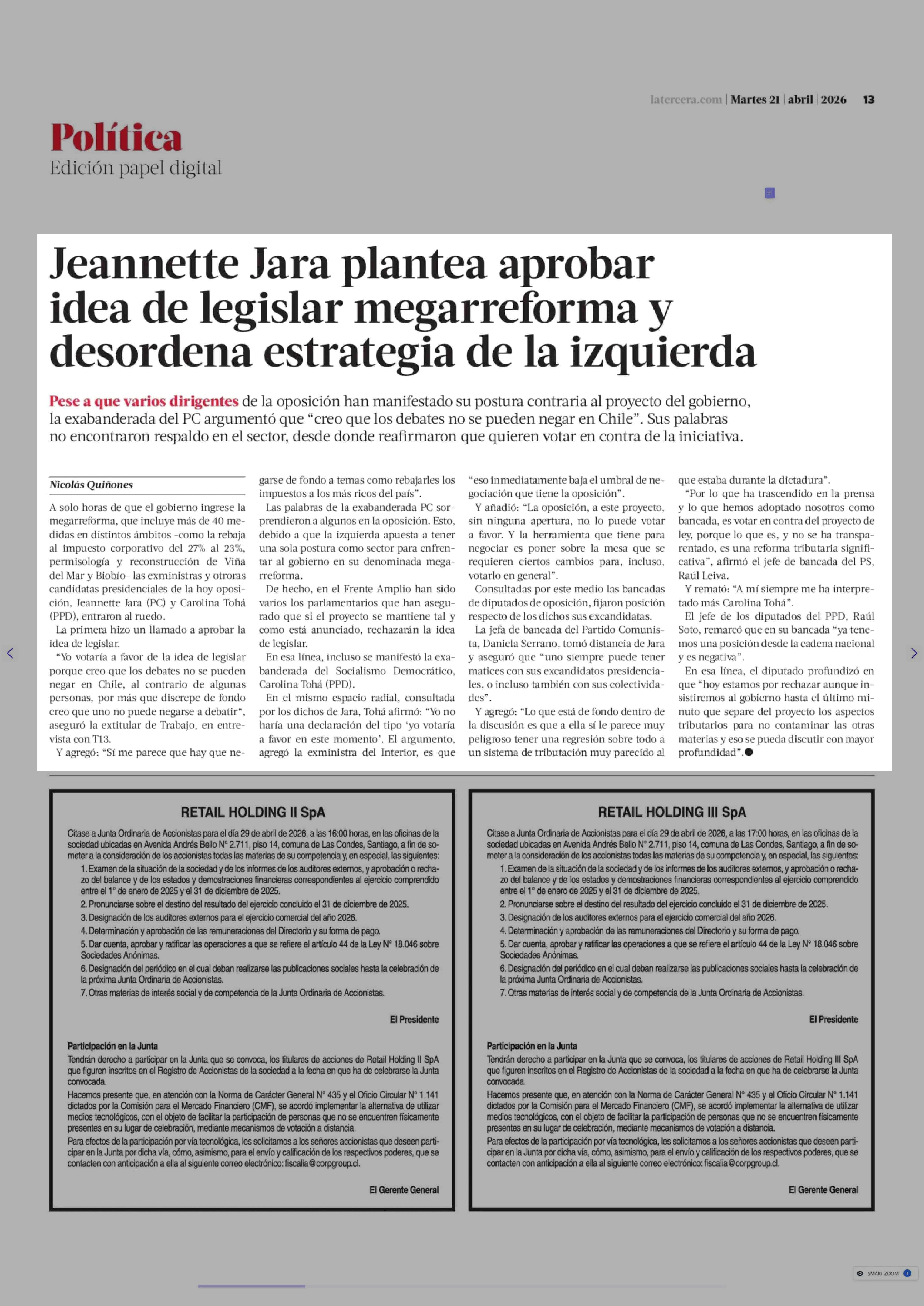 Jeannette Jara plantea aprobar idea de legislar megarreforma y desordena estrategia de la izquierda 21-04-2026 La Tercera |