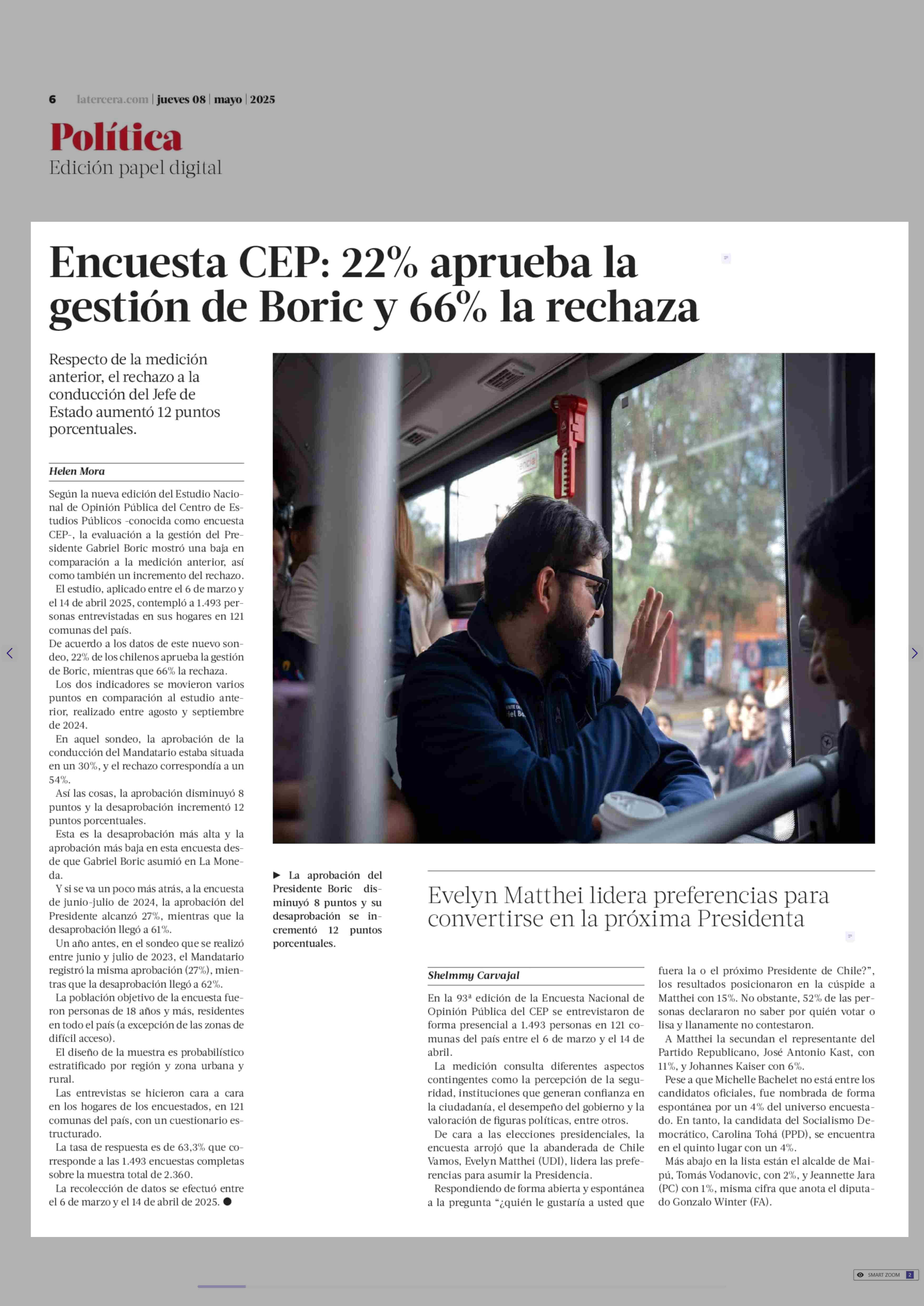 Encuesta CEP: 22% aprueba la gestión de Boric y 66% la rechaza 08-05-2025 La Tercera |
