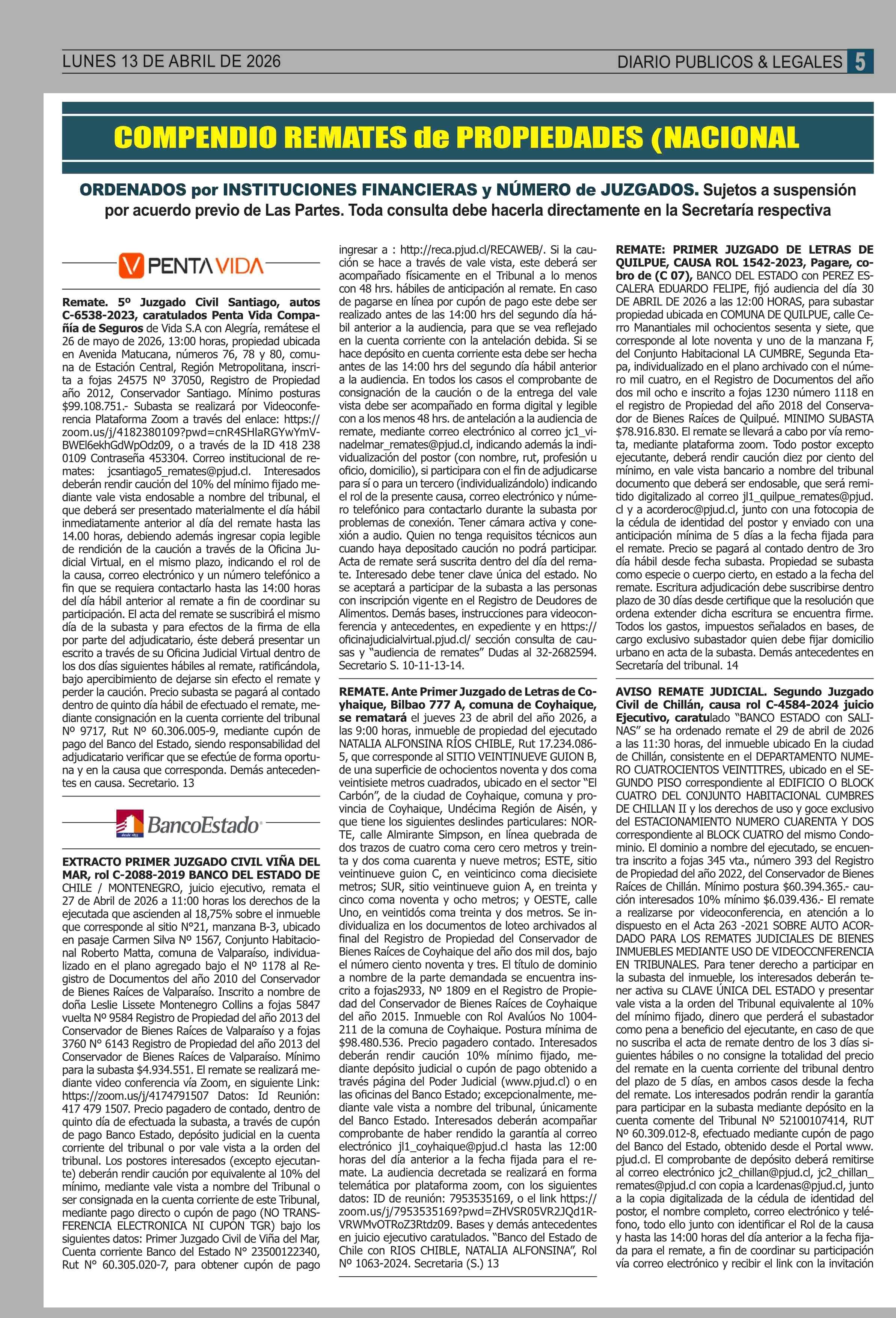 REMATES: COMPENDIO REMATES de PROPIEDADES (NACIONAL 13-04-2026 P&L Públicos y Legales |