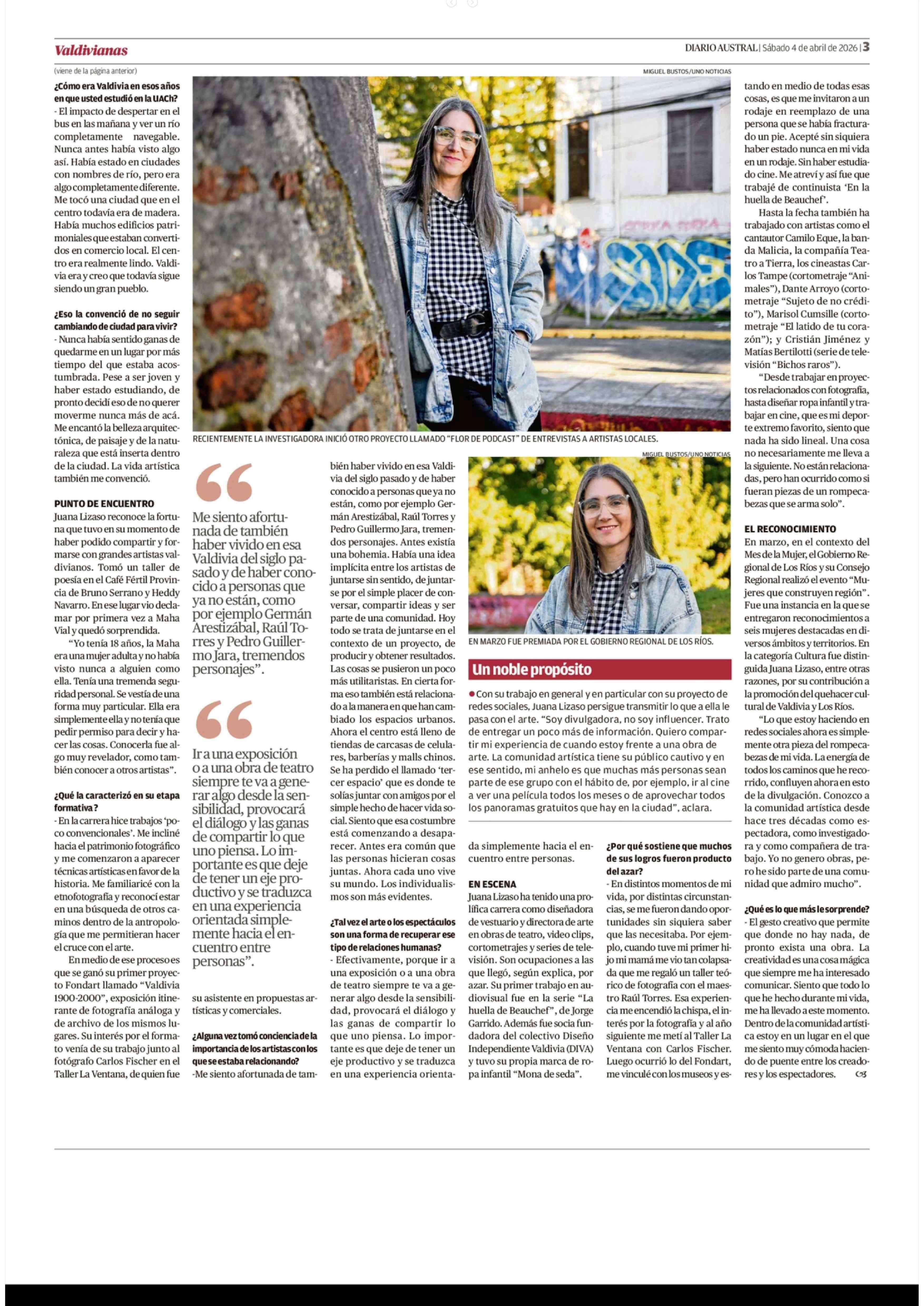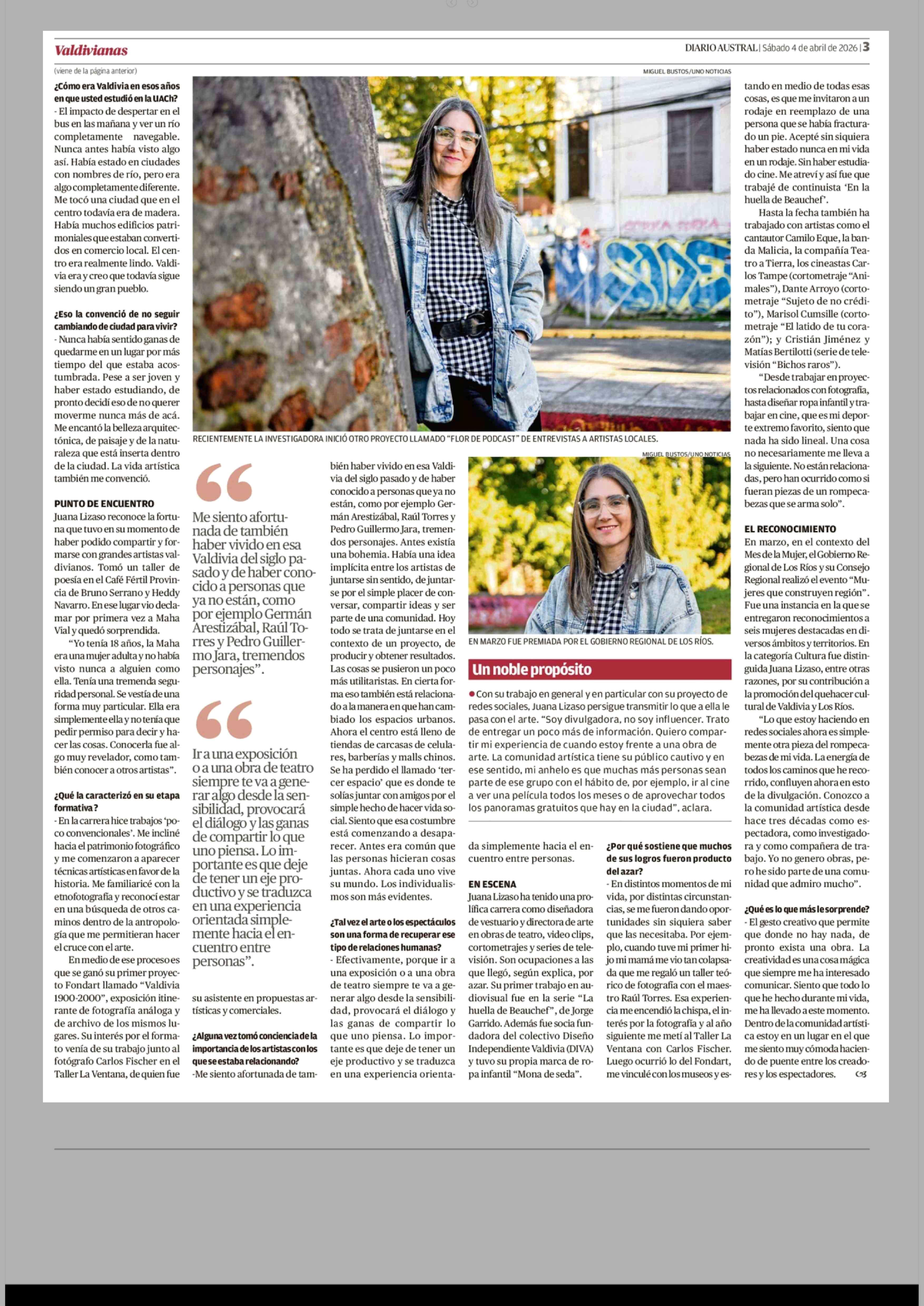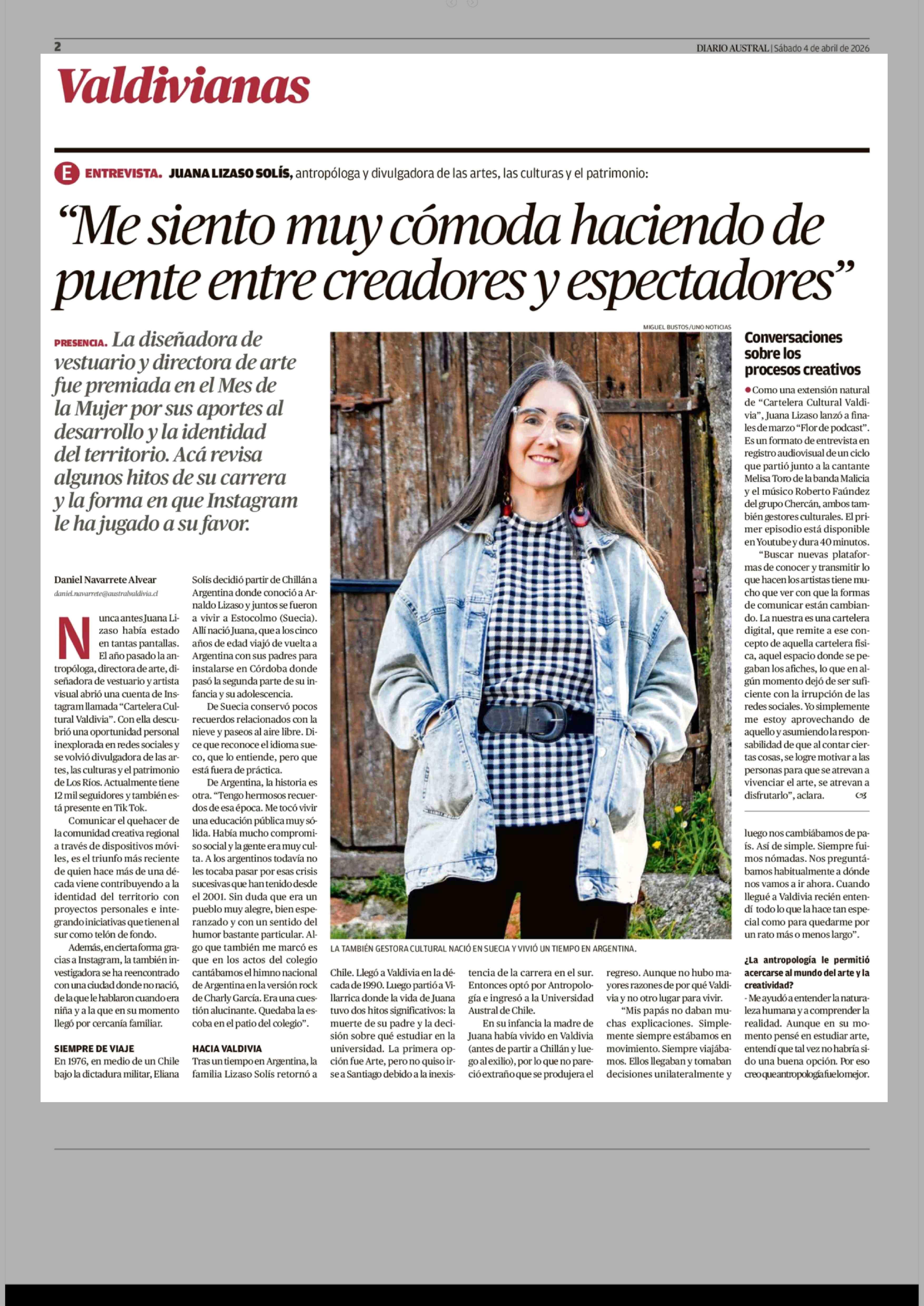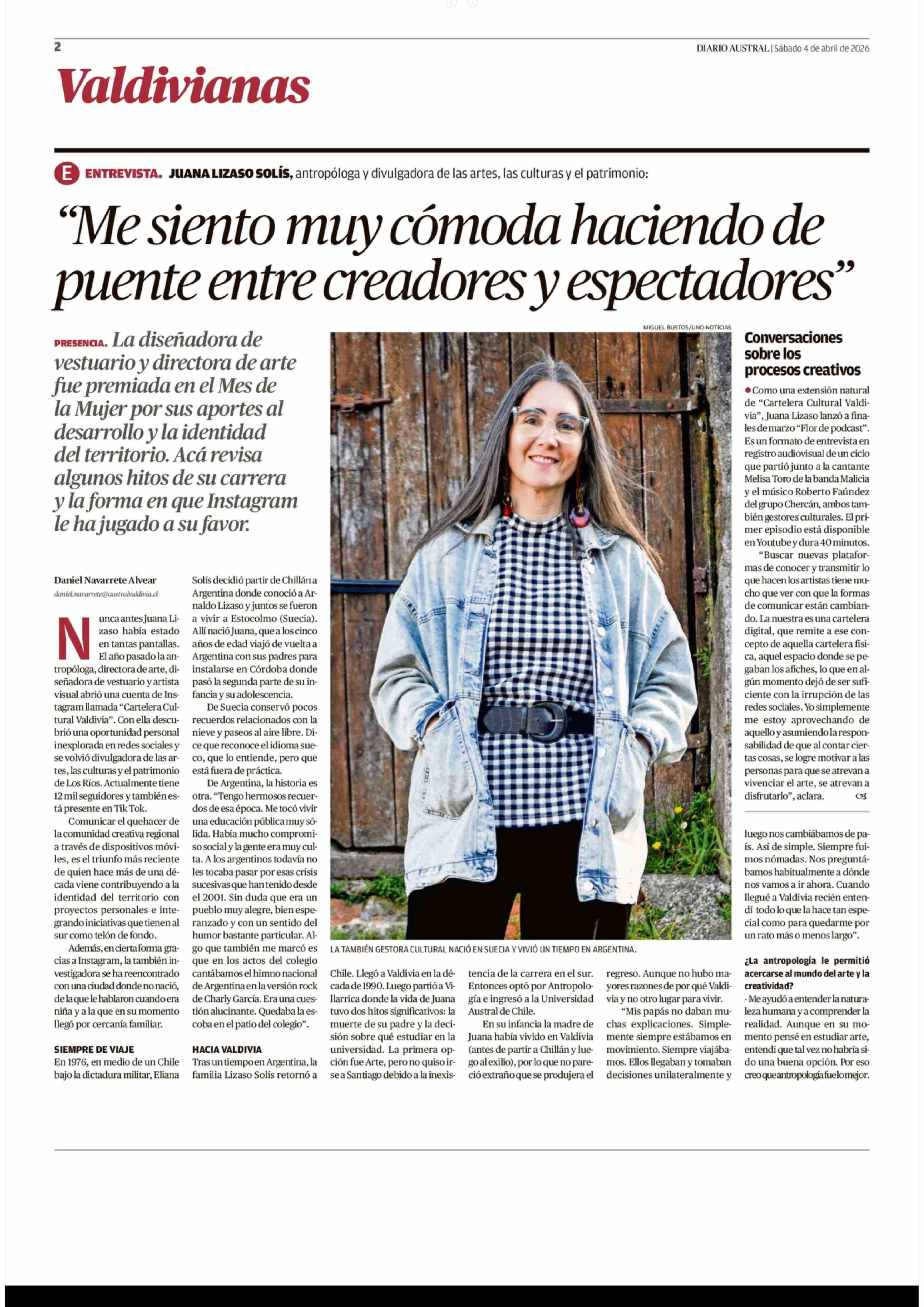 "Me siento muy cómoda haciendo de puente entre creadores y espectadores" 04-04-2026 Diario Austral Región de Los Ríos |