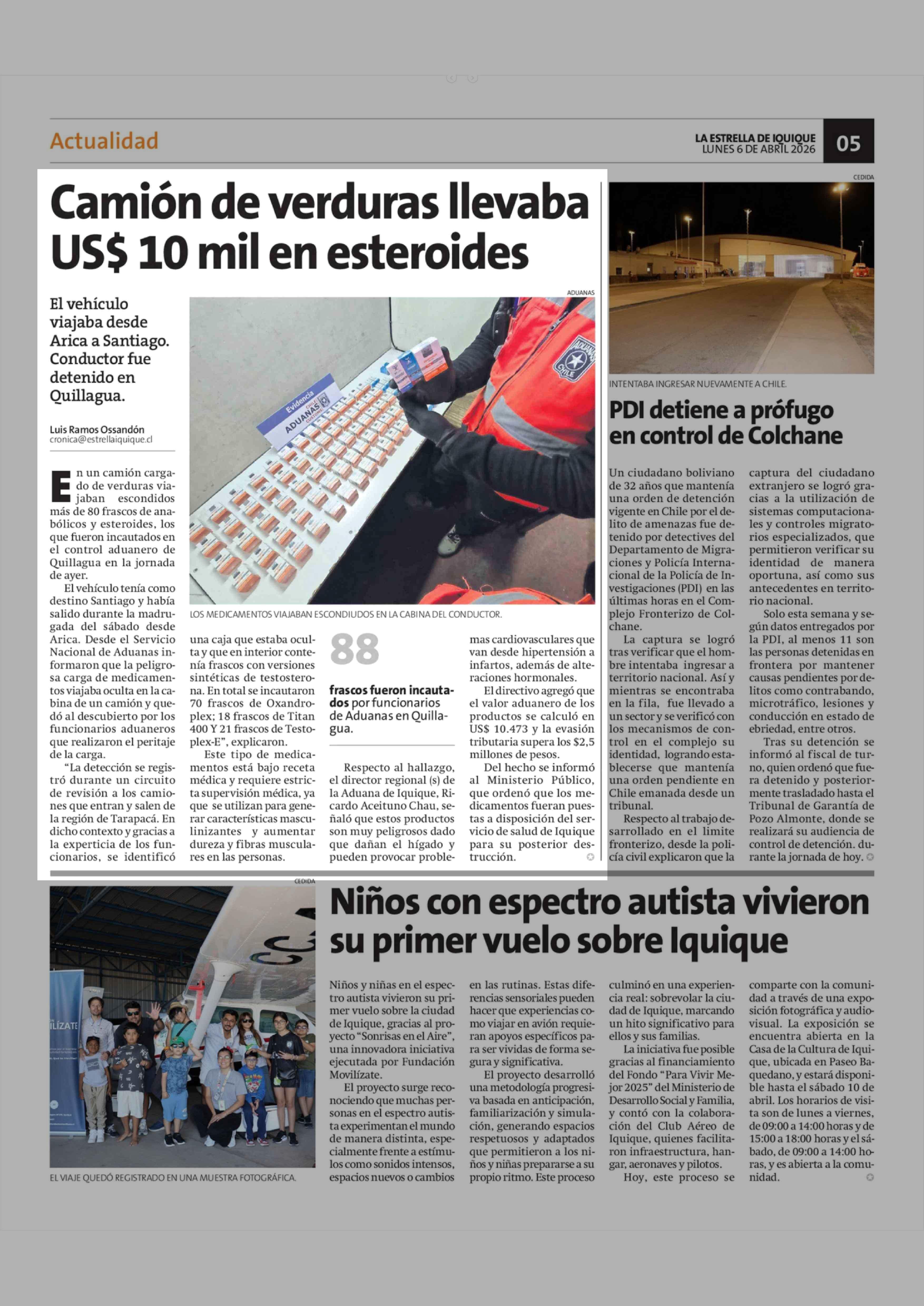 Camión de verduras llevaba US$ 10 mil en esteroides 06-04-2026 La Estrella de Iquique |