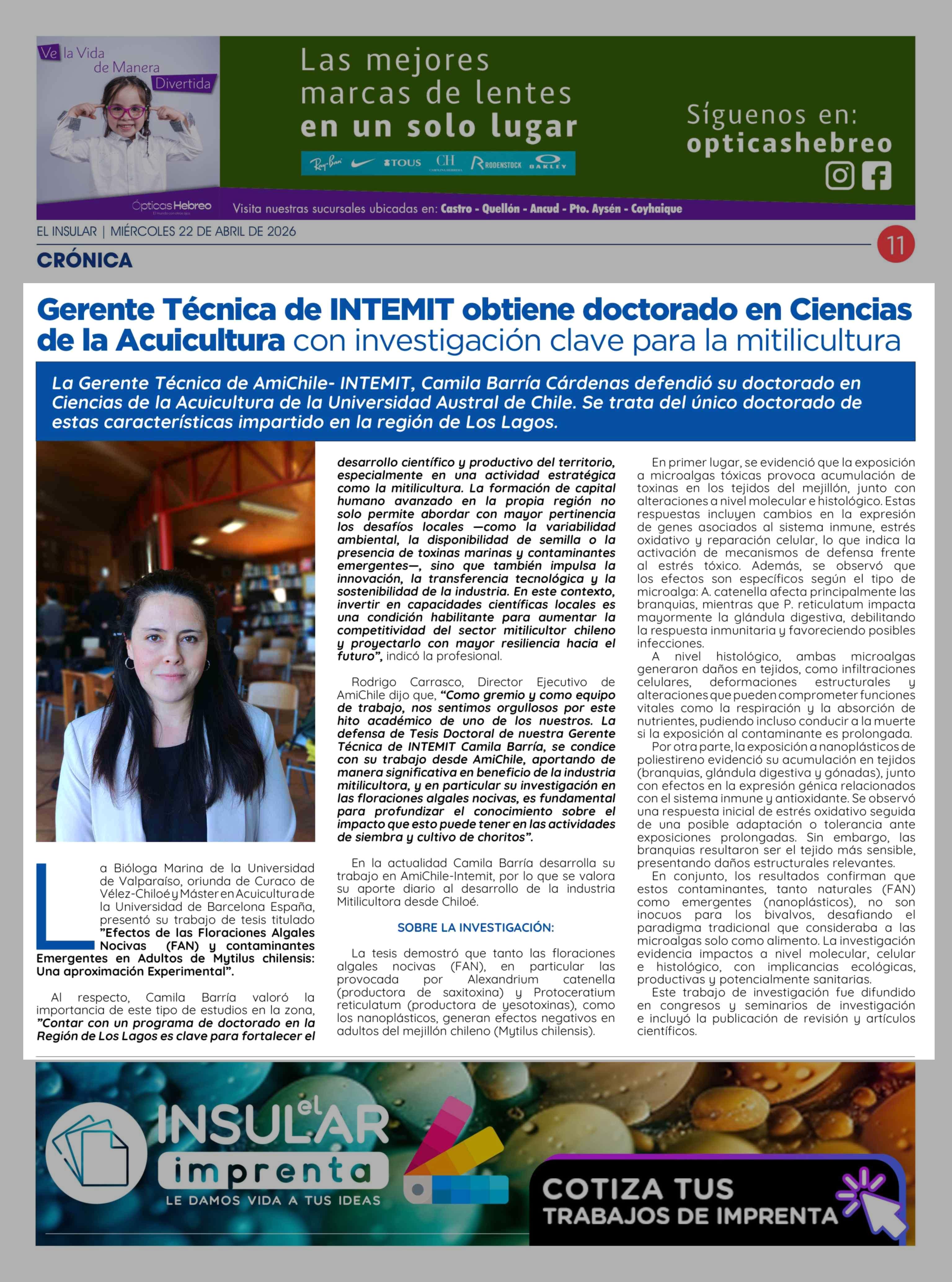 Gerente Técnica de INTEMIT obtiene doctorado en Ciencias de la Acuicultura con investigación clave para la mitilicultura 22-04-2026 El Insular |