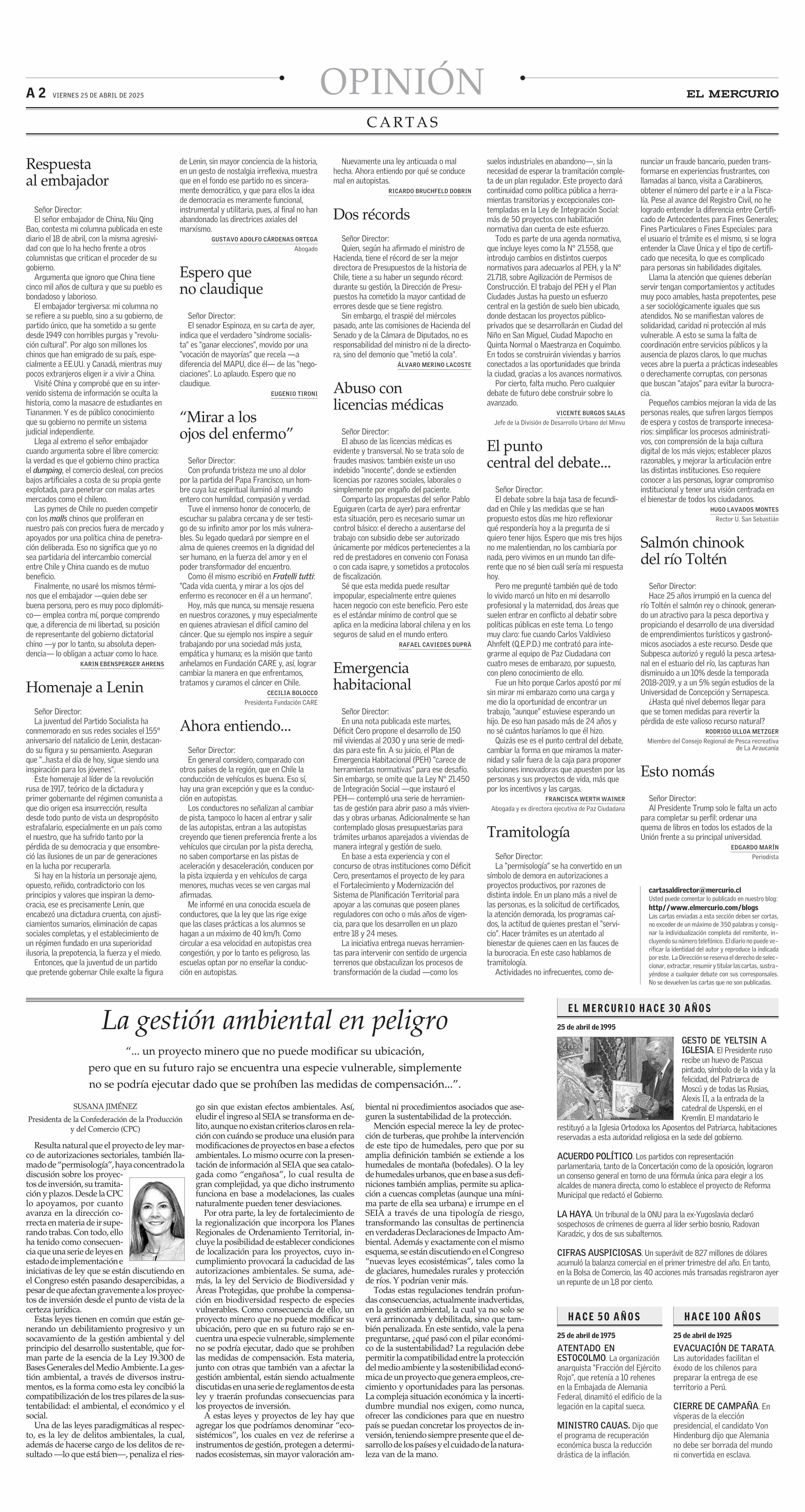 COLUMNAS DE OPINIÓN: La gestión ambiental en peligro 25-04-2025 El Mercurio |