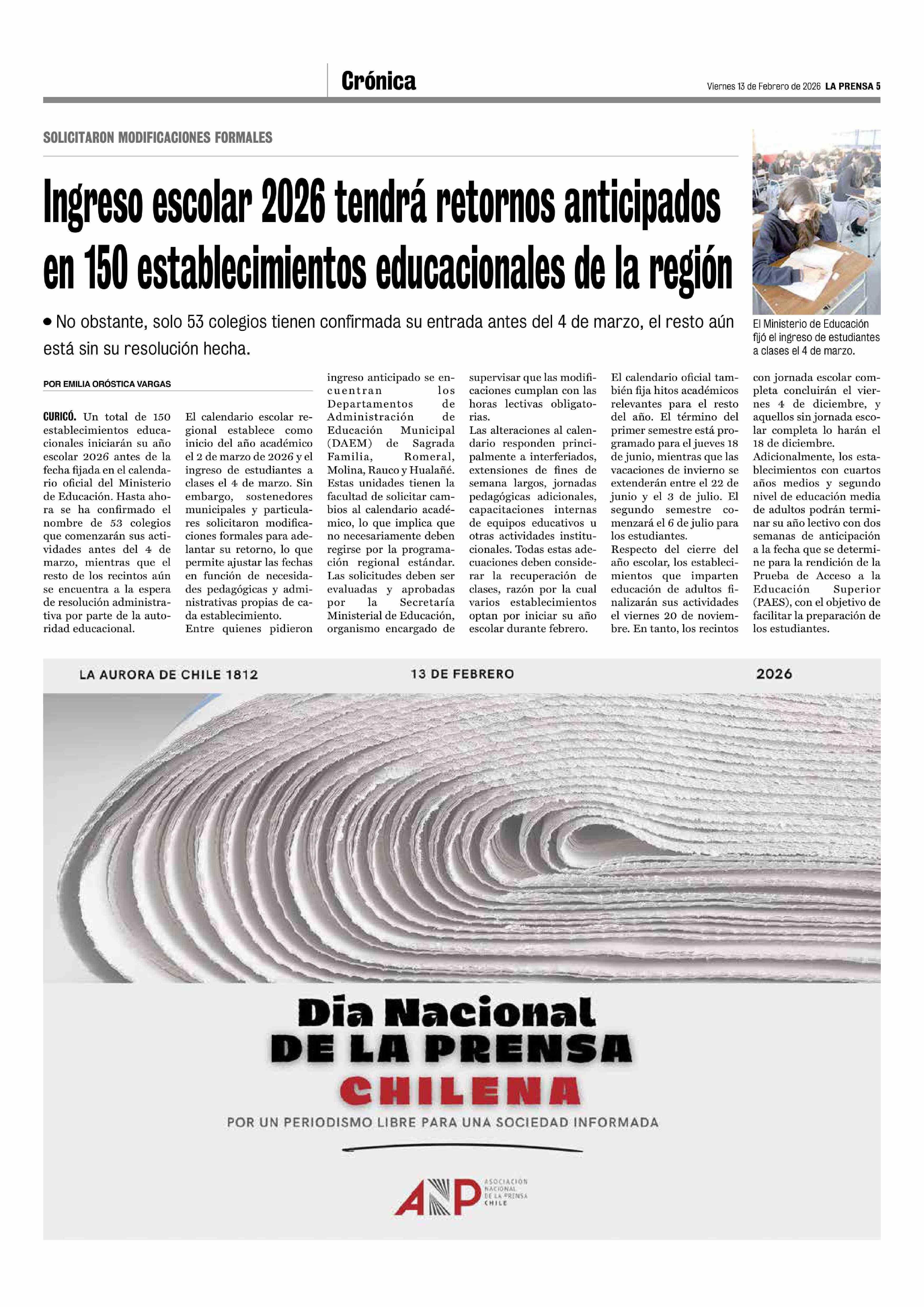 Ingreso escolar 2026 tendrá retornos anticipados en 150 establecimientos educacionales de la región 13-02-2026 La Prensa de Curicó |