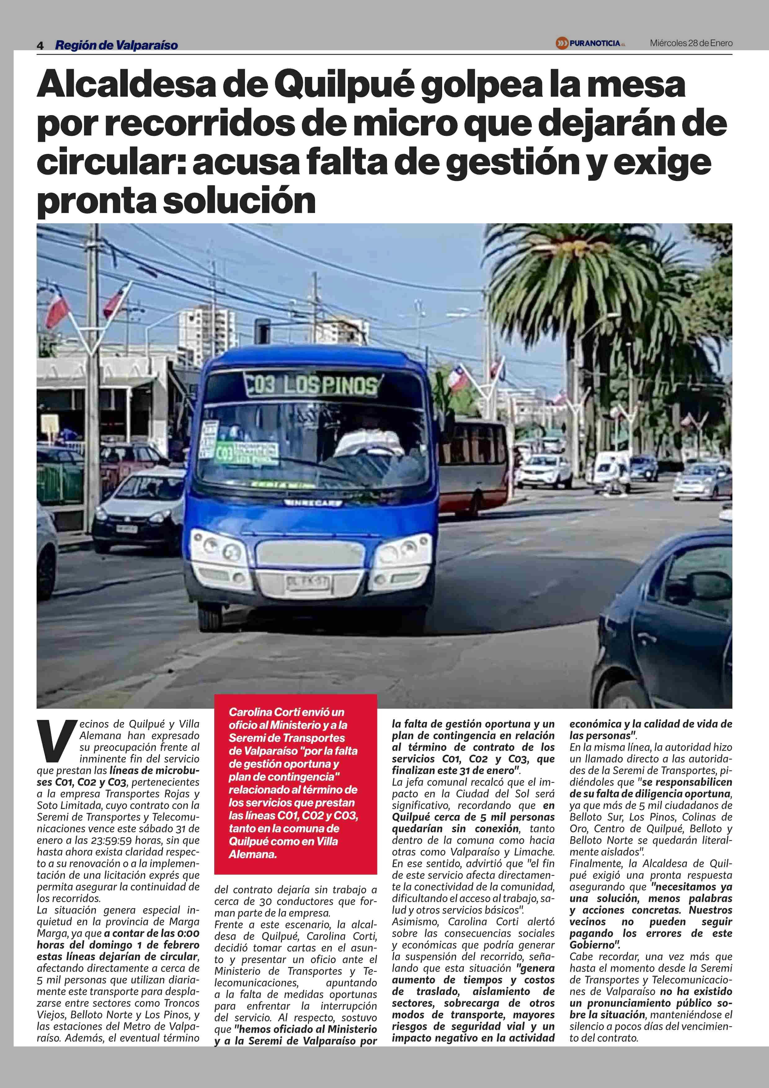 Título: Alcaldesa de Quilpué golpea la mesa por recorridos de micro que dejarán de circular: acusa falta de gestión y exige pronta solución