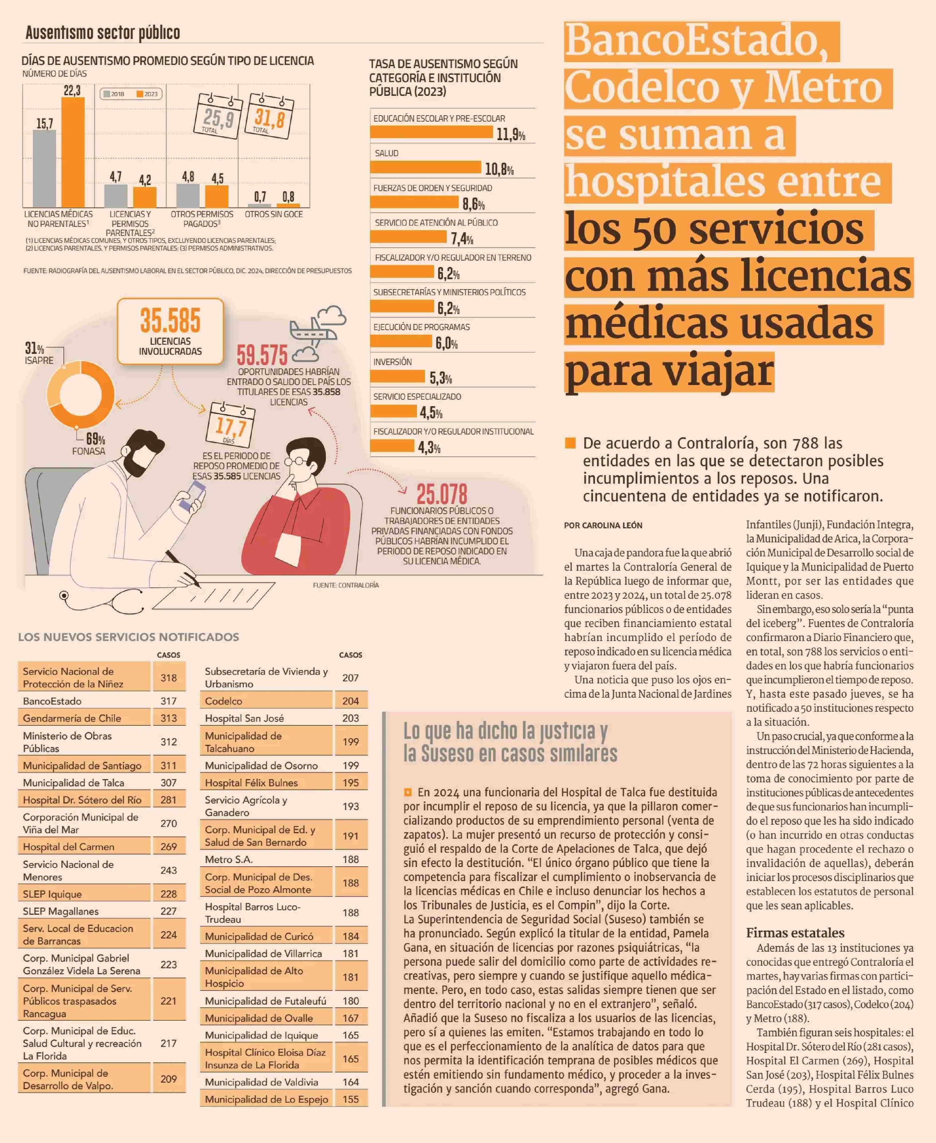 | Título: | BancoEstado, Codelco y Metro se suman a hospitales entre los 50 servicios con más licencias médicas usadas para viajar |