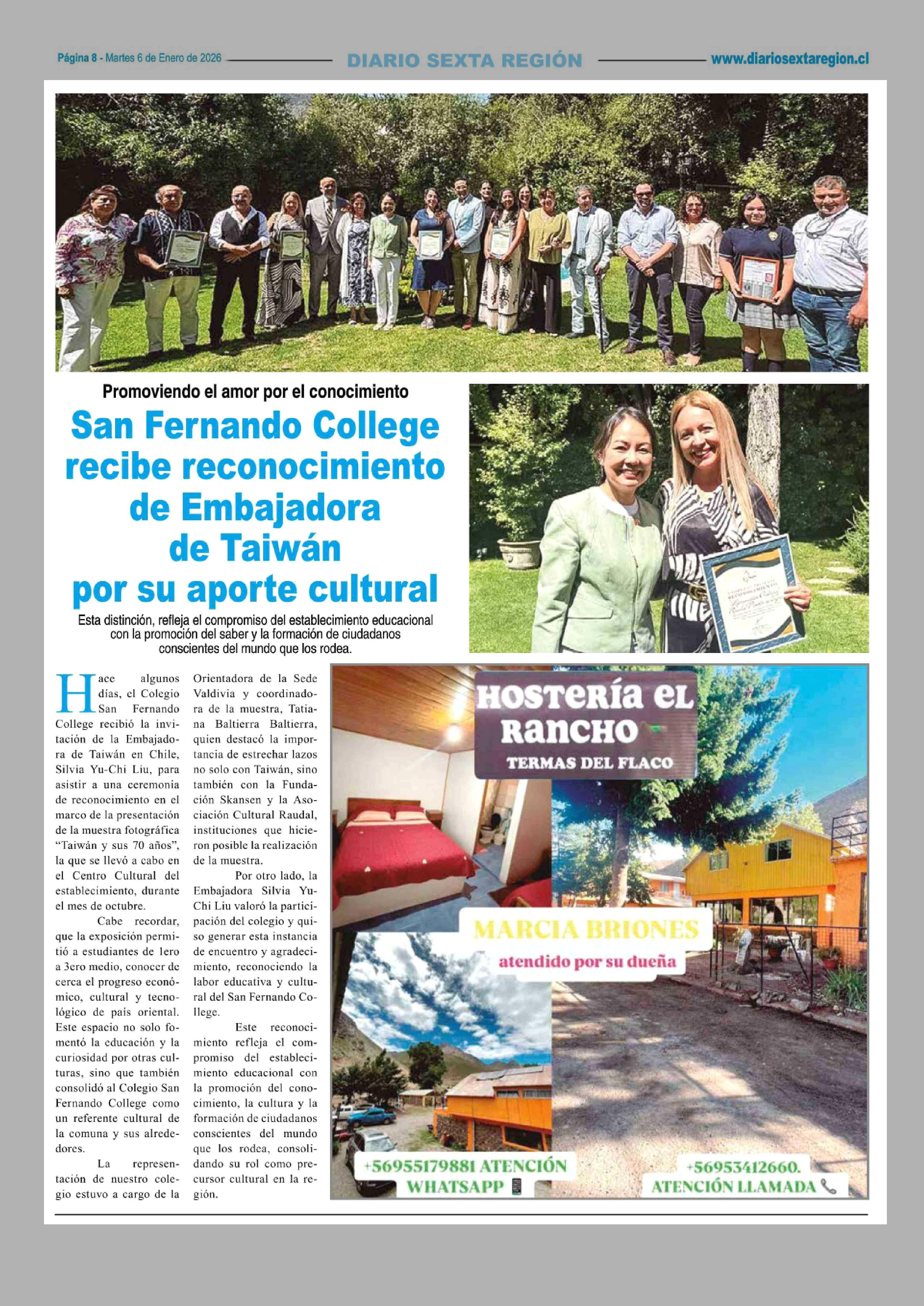 San Fernando College recibe reconocimiento de Embajadora de Taiwán por su aporte cultural 06-01-2026 Diario VI Región |