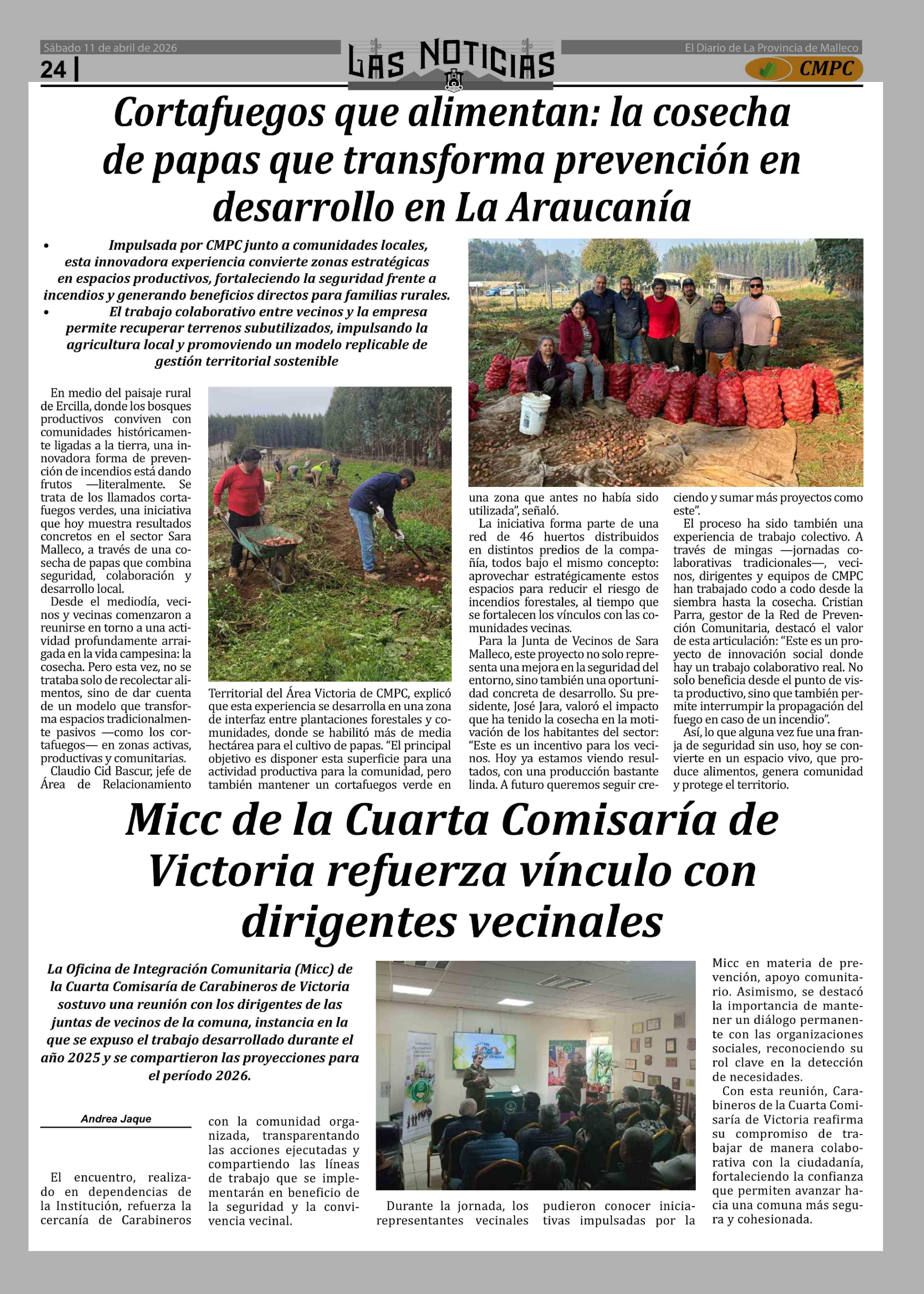 Cortafuegos que alimentan: la cosecha de papas que transforma prevención en desarrollo en La Araucanía 11-04-2026 Las Noticias |