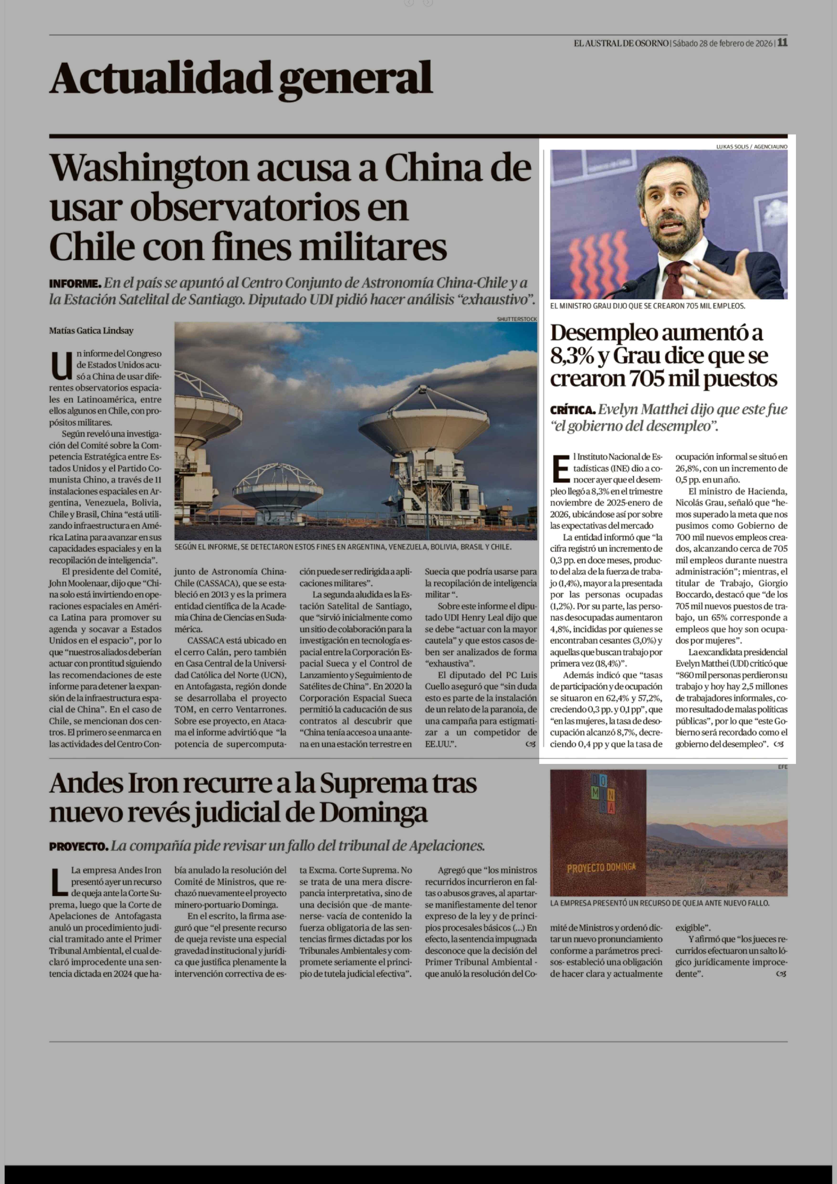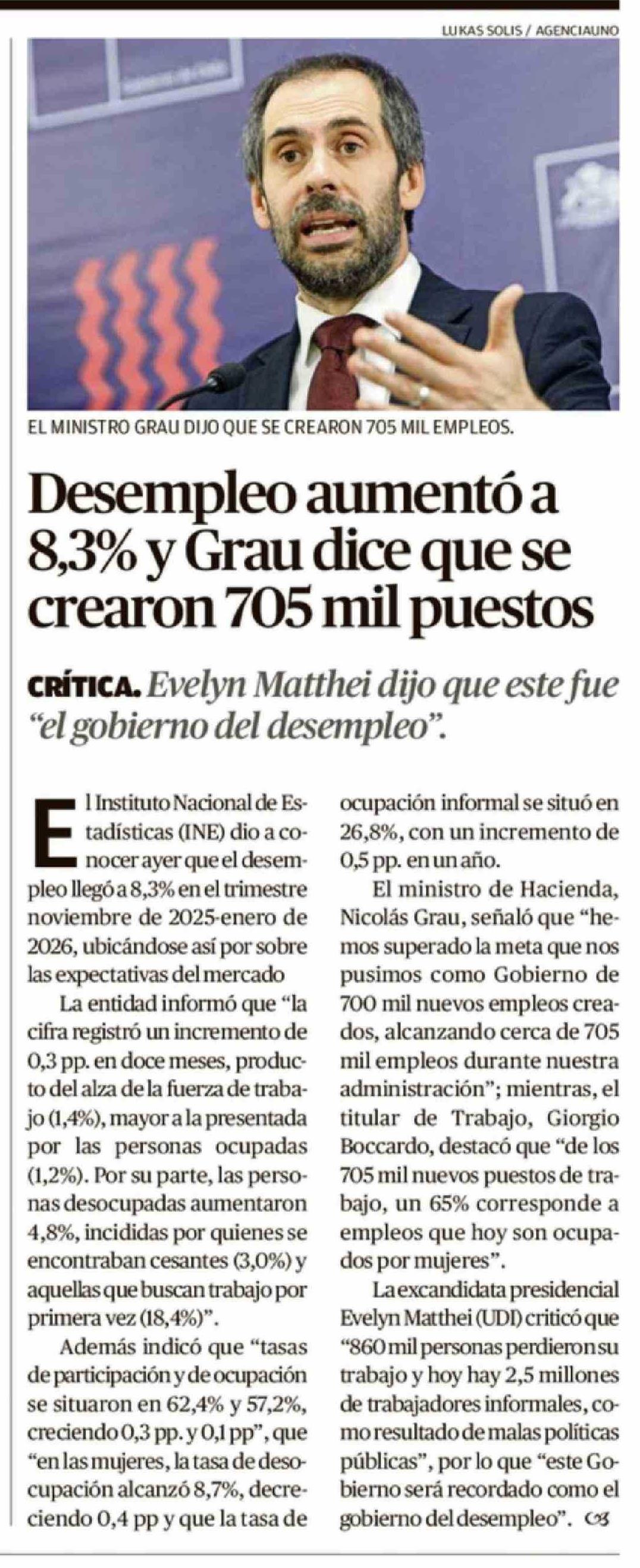 Desempleo aumentó a 8,3% y Grau dice que se crearon 705 mil puestos 28-02-2026 El Austral de Osorno |