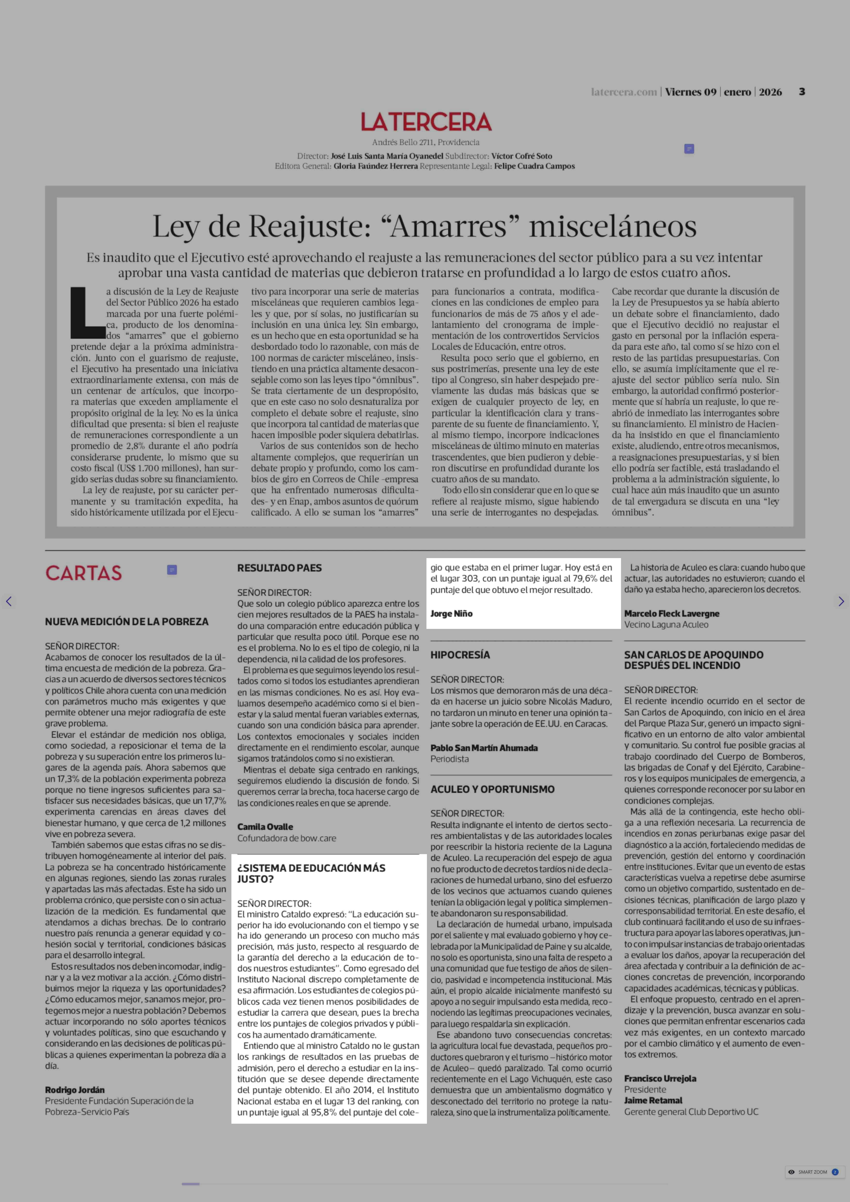 Cartas: ¿SISTEMA DE EDUCACIÓN MÁS JUSTO? 09-01-2026 La Tercera |