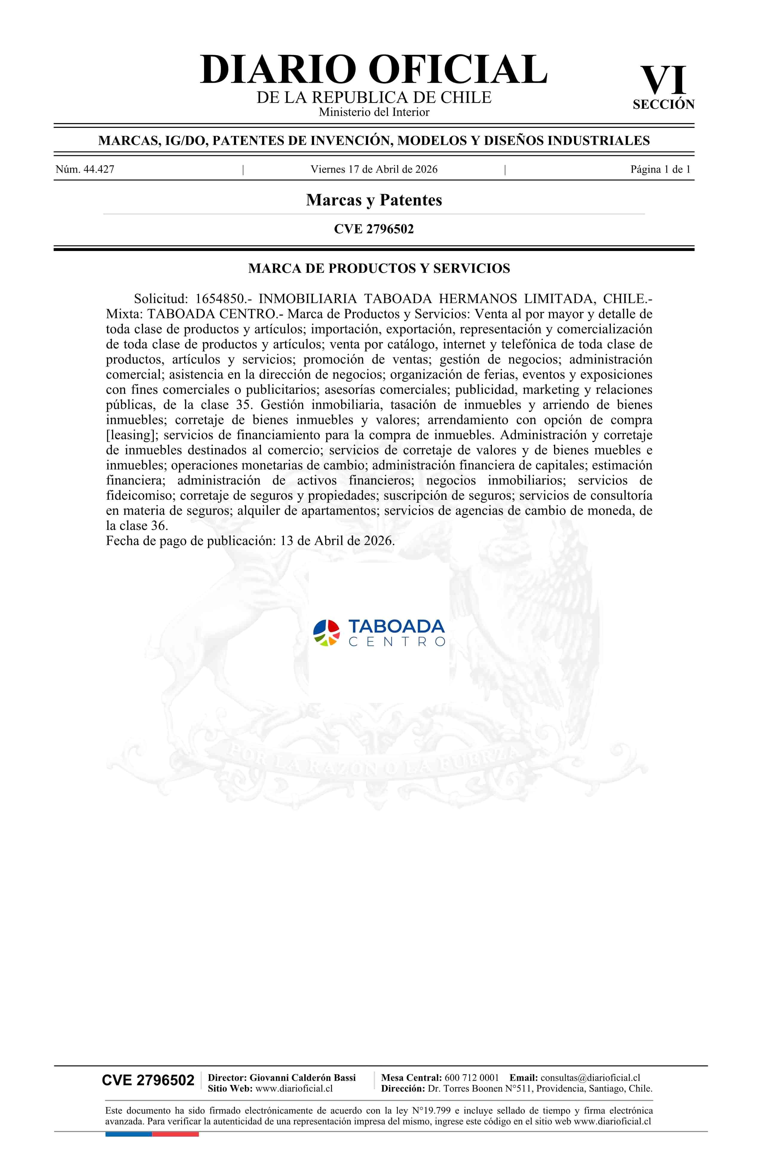 Solicitud número 1654850.- TABOADA CENTRO 17-04-2026 Diario Oficial Edición Electrónica |