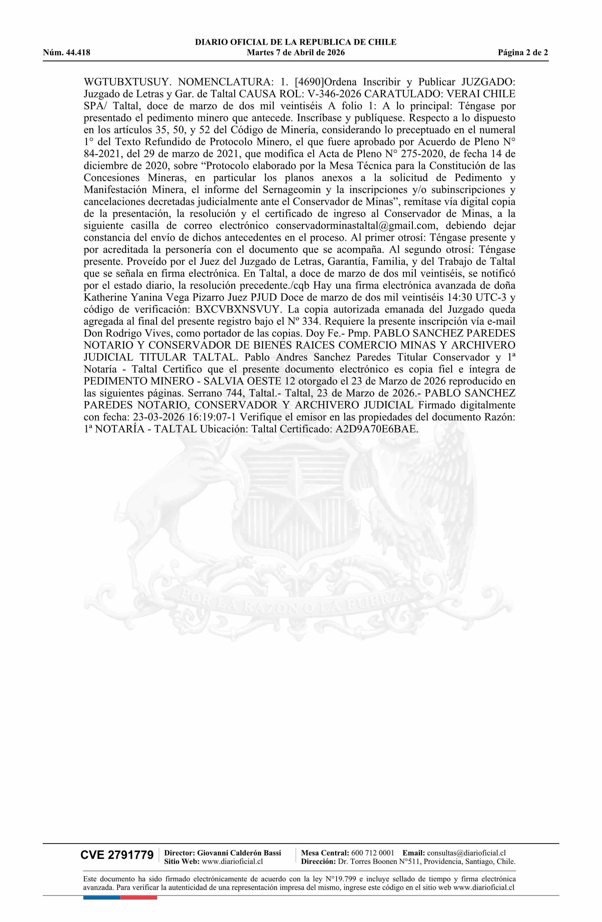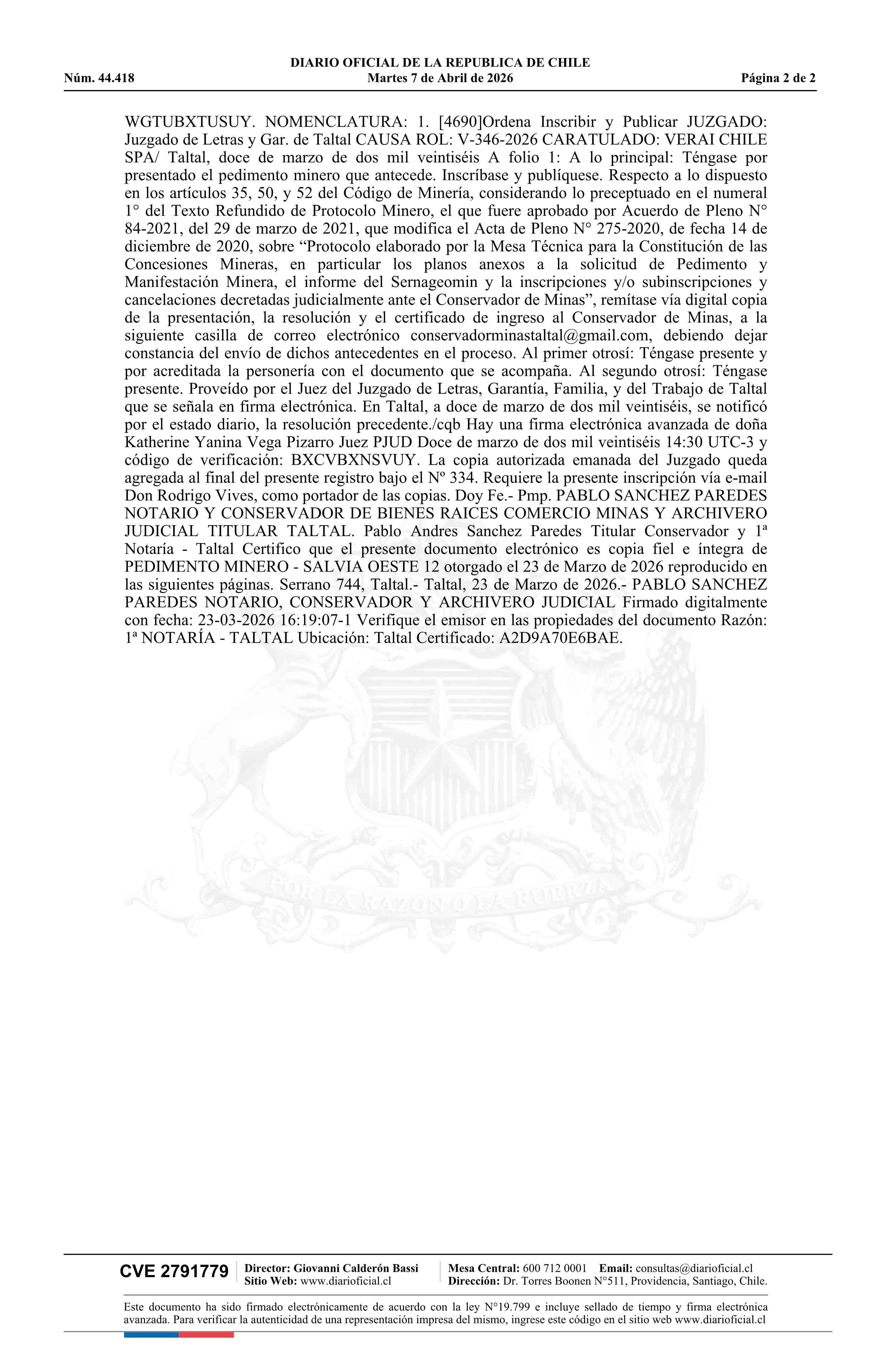 SALVIA OESTE 12 / Verai Chile SpA 07-04-2026 DIARIO OFICIAL CHILE - BOLETÍN OFICIAL DE MINERÍA |