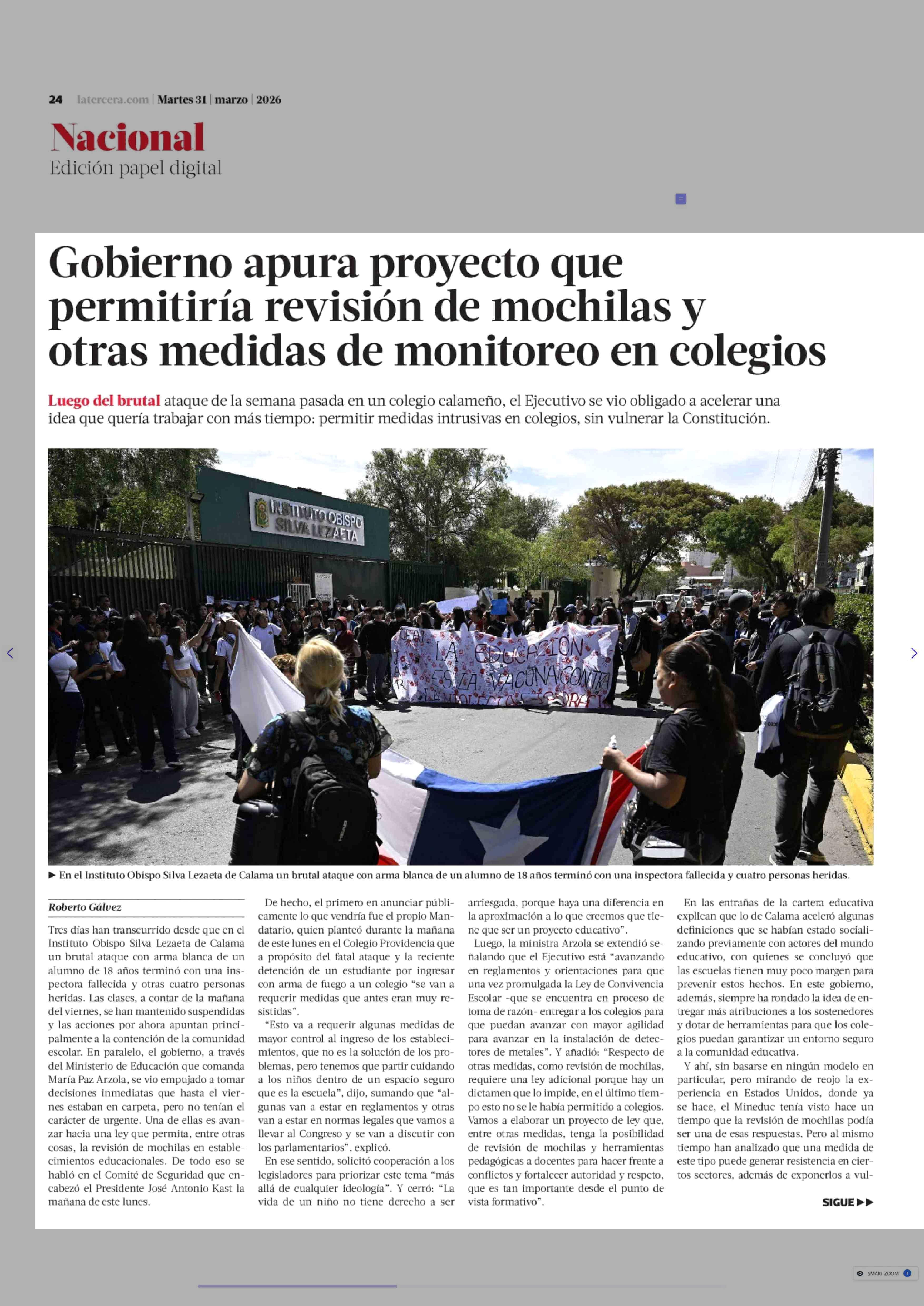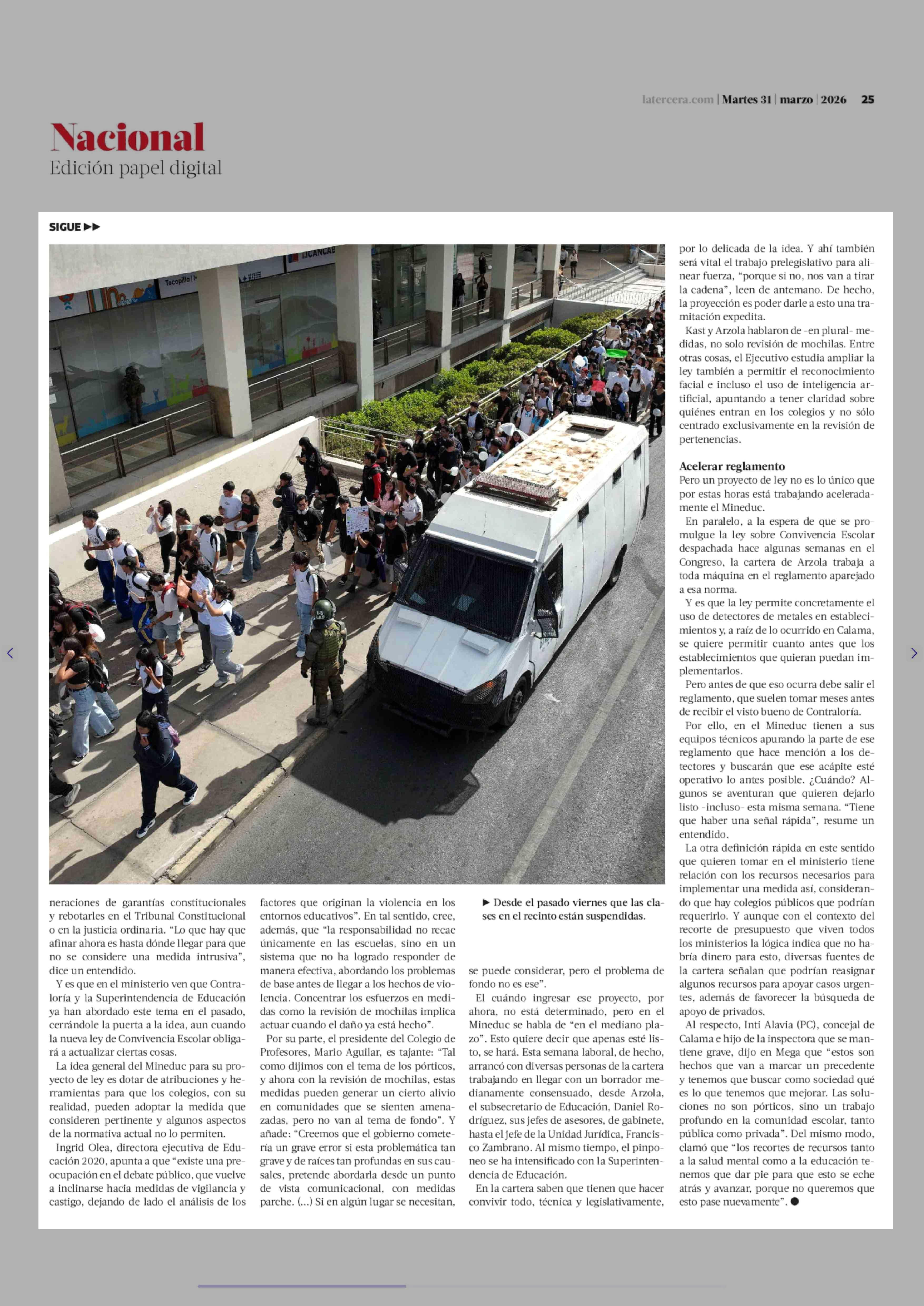Título: Gobierno apura proyecto que permitiría revisión de mochilas y otras medidas de monitoreo en colegios