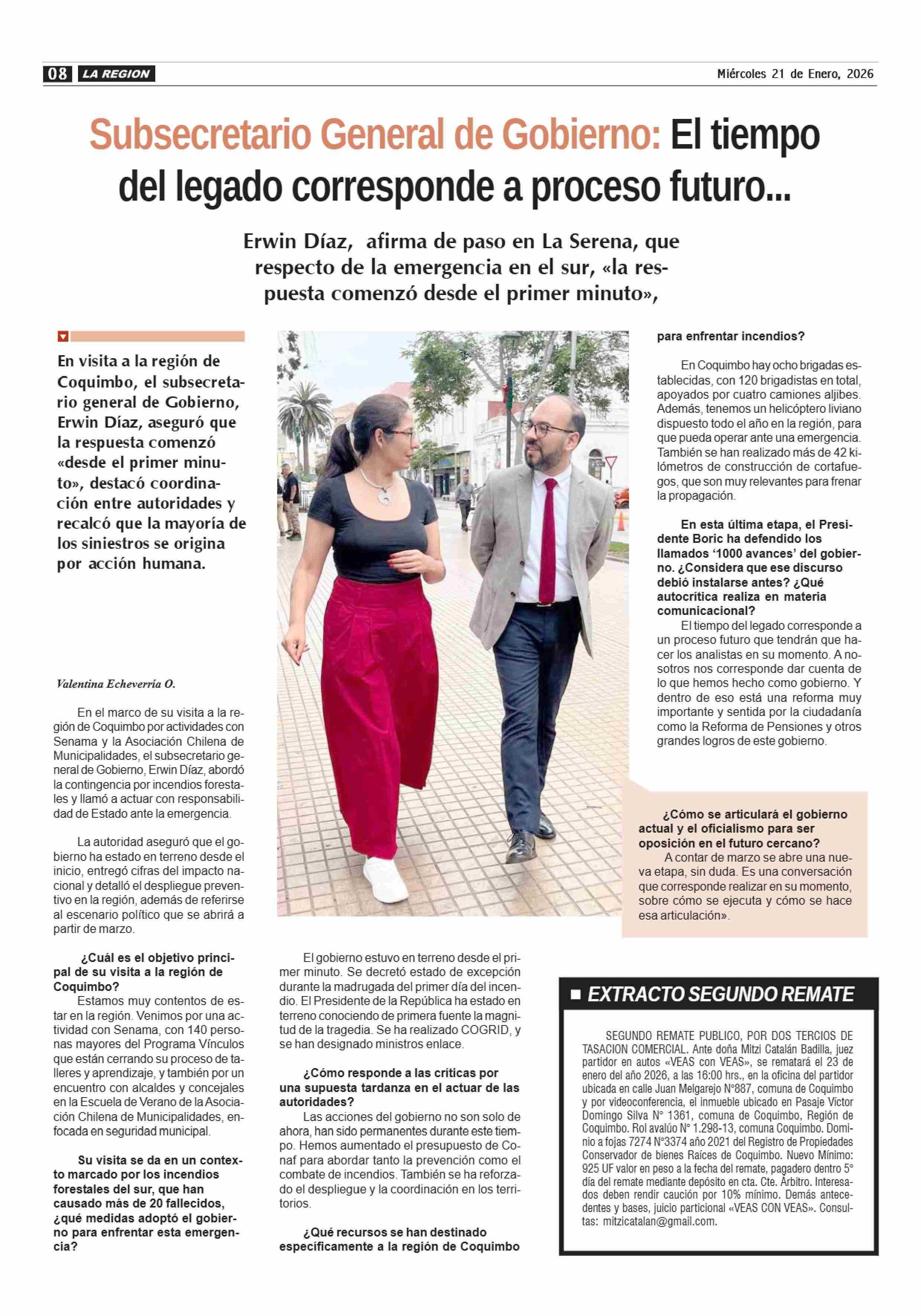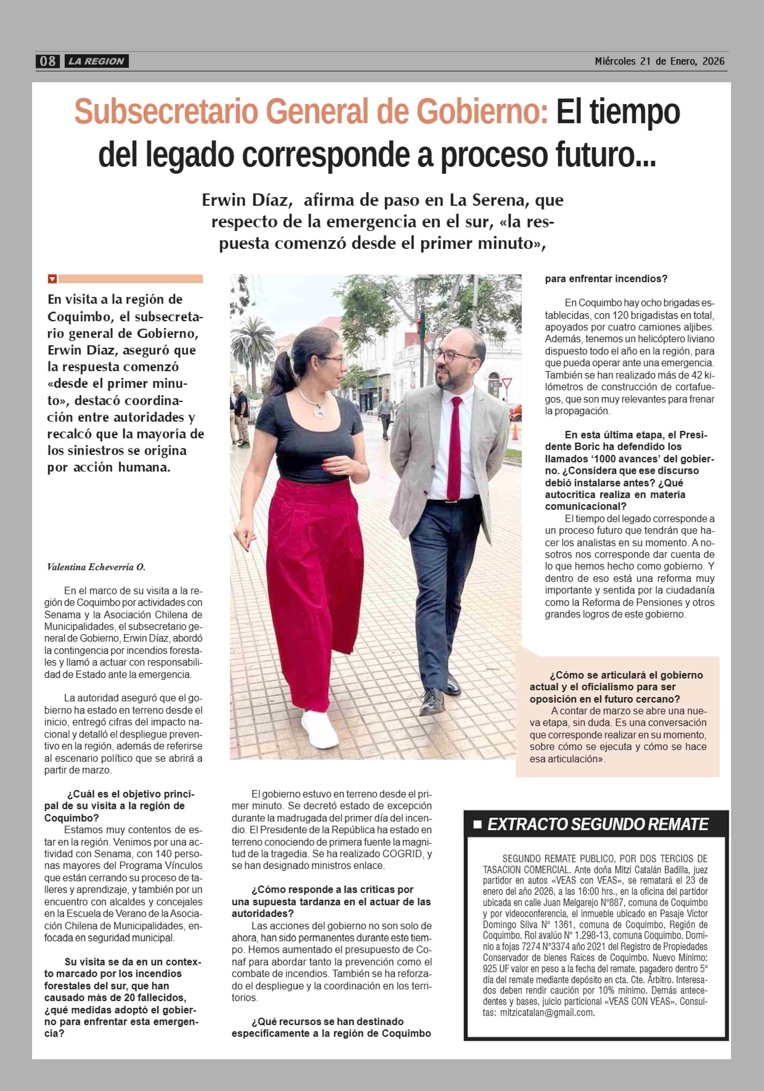 Subsecretario General de Gobierno: El tiempo del legado corresponde a proceso futuro ... 21-01-2026 Diario la Región |