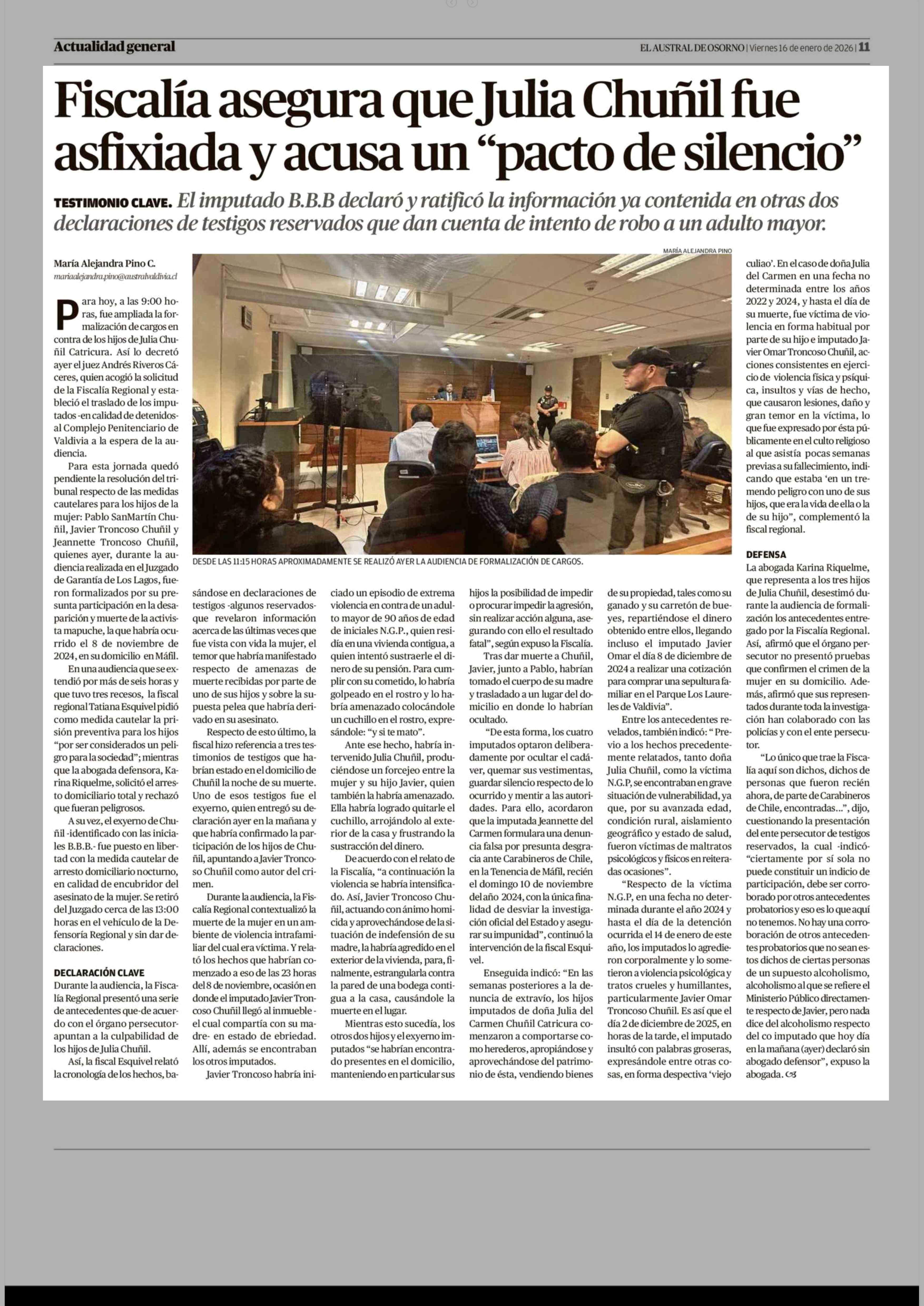 Título: Fiscalía asegura que Julia Chuñil fue asfixiada y acusa un "pacto de silencio"